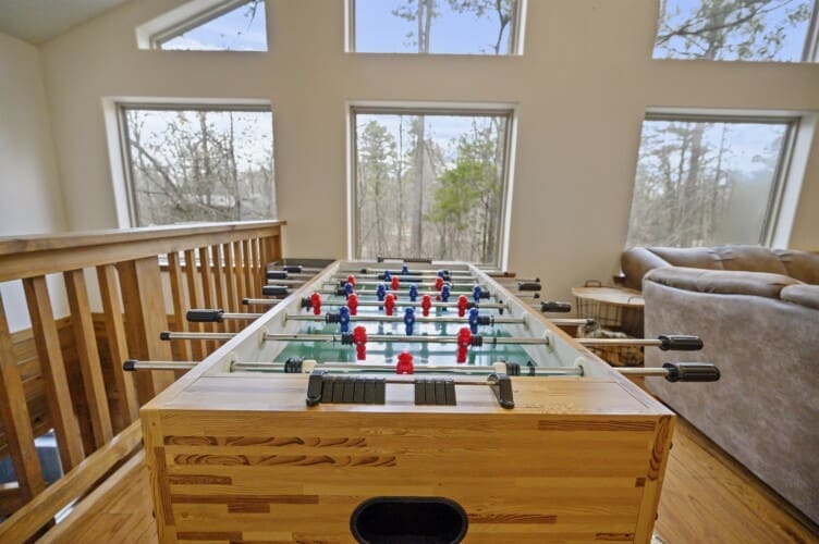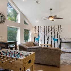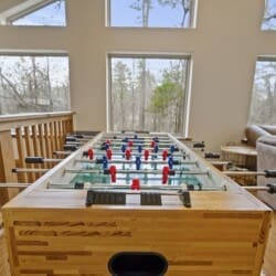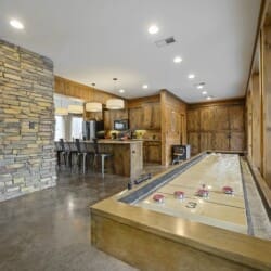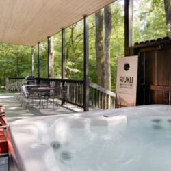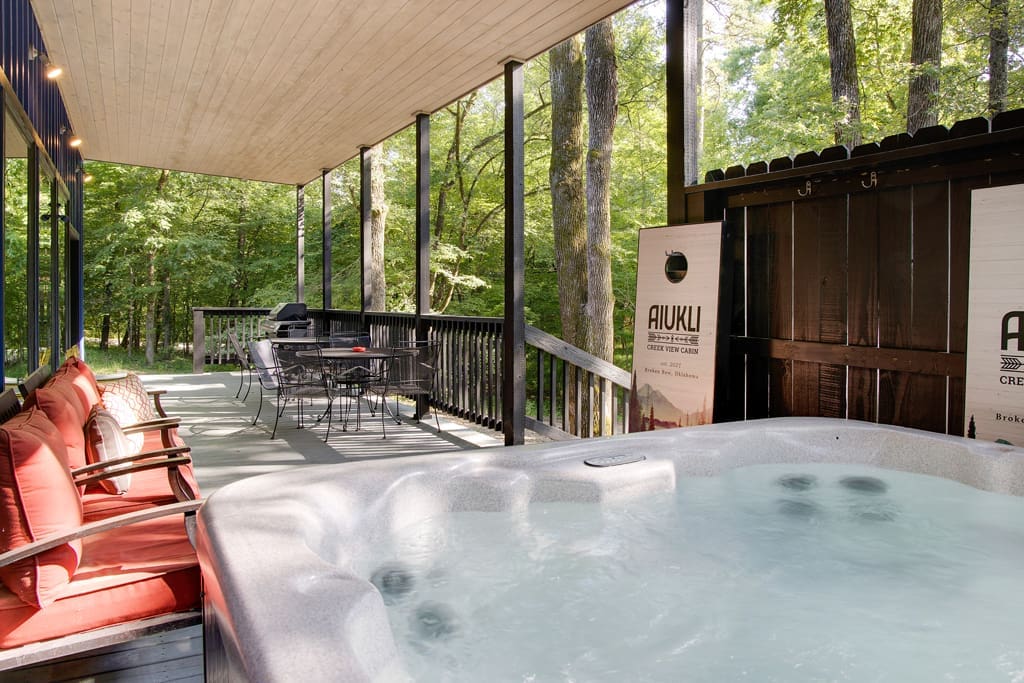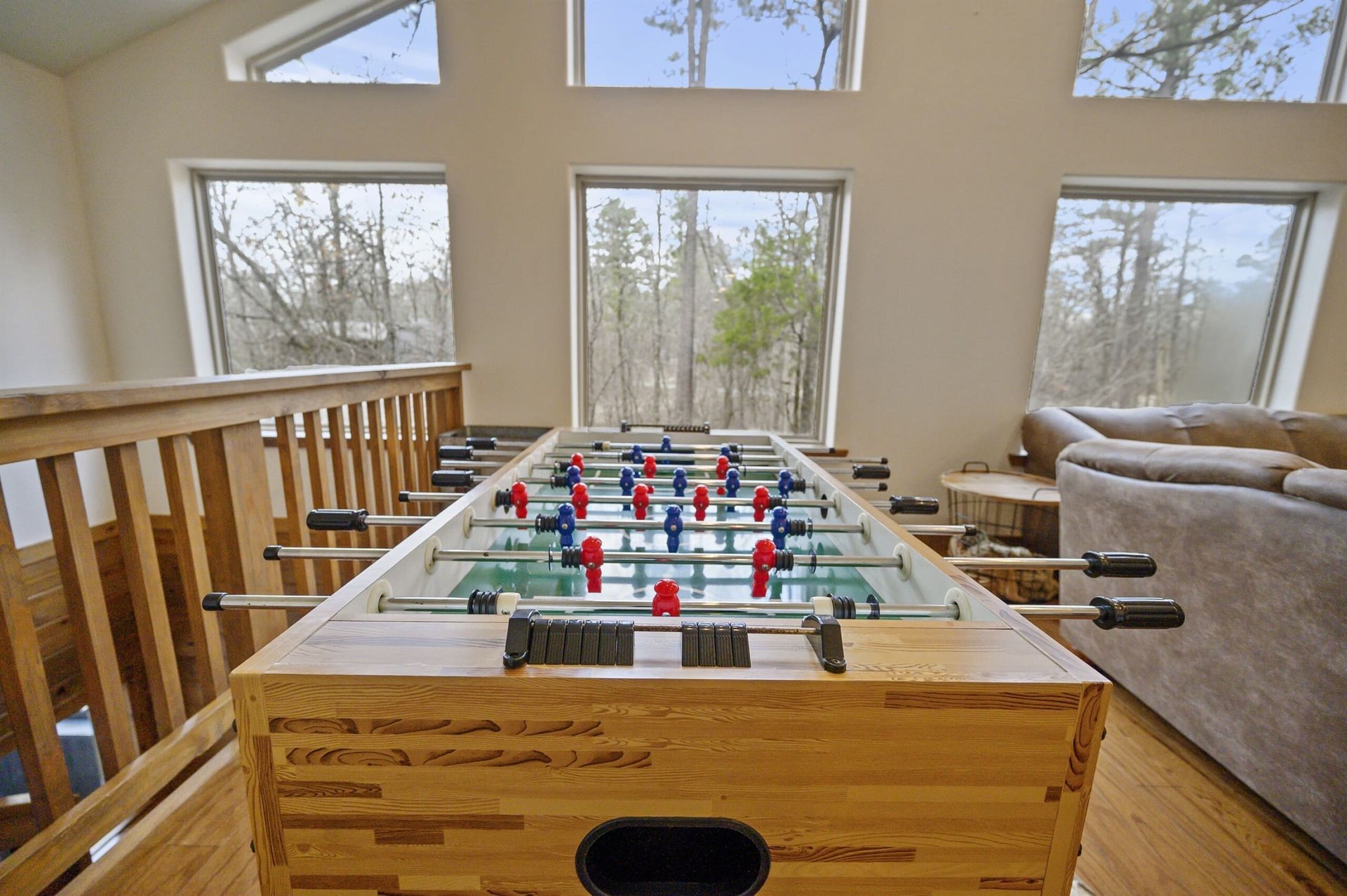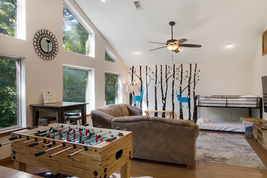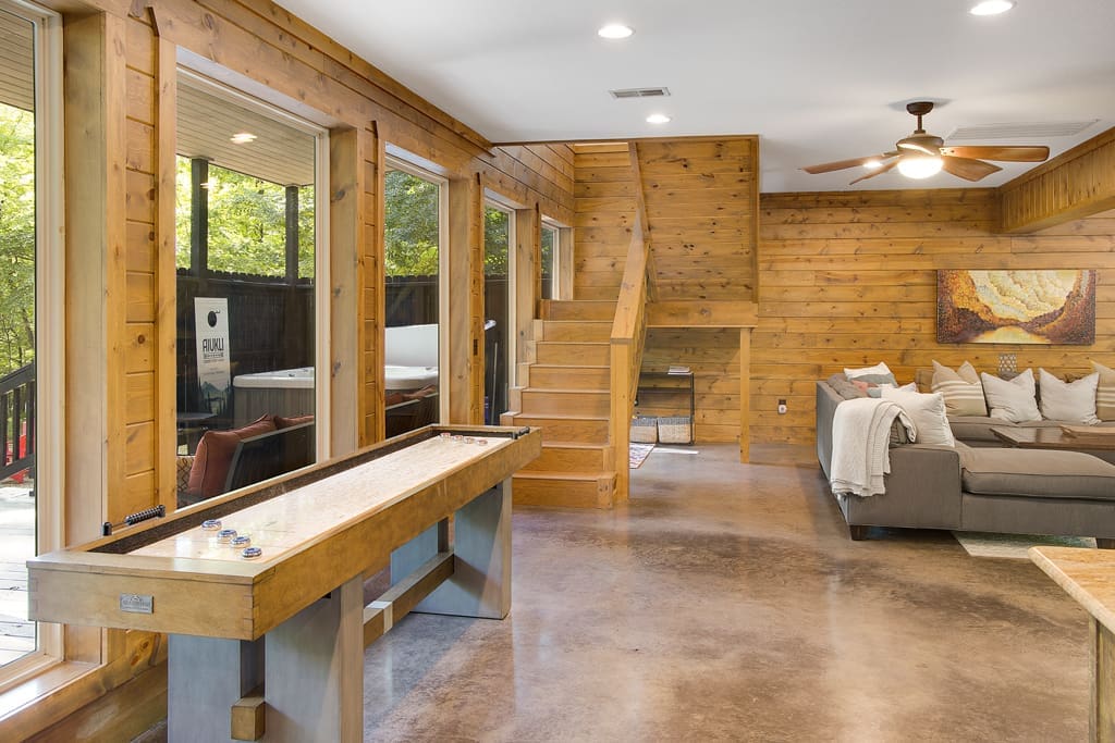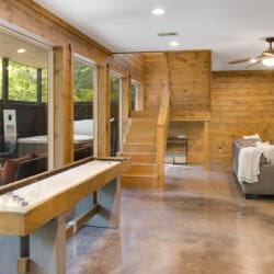 Step inside Aiukli Creek View Cabin to discover a world of comfort and entertainment. Our cabin boasts a BRAND Waffle Bar, a sumptuous steam room infused with complimentary natural oil aromatherapy, and a bubbling hot tub to soothe your senses. Test your skills at shuffleboard, engage in spirited matches on the foosball table, or reminisce over classic arcade games like Pac-Man. Outdoors, the fun continues with activities like Corn Hole, horseshoes, and life-sized tic tac toe. Let the little ones frolic in the kiddie corner while you relax on swing seats by the picnic table.
