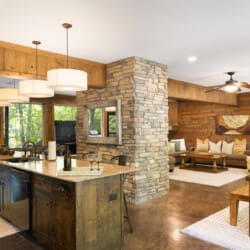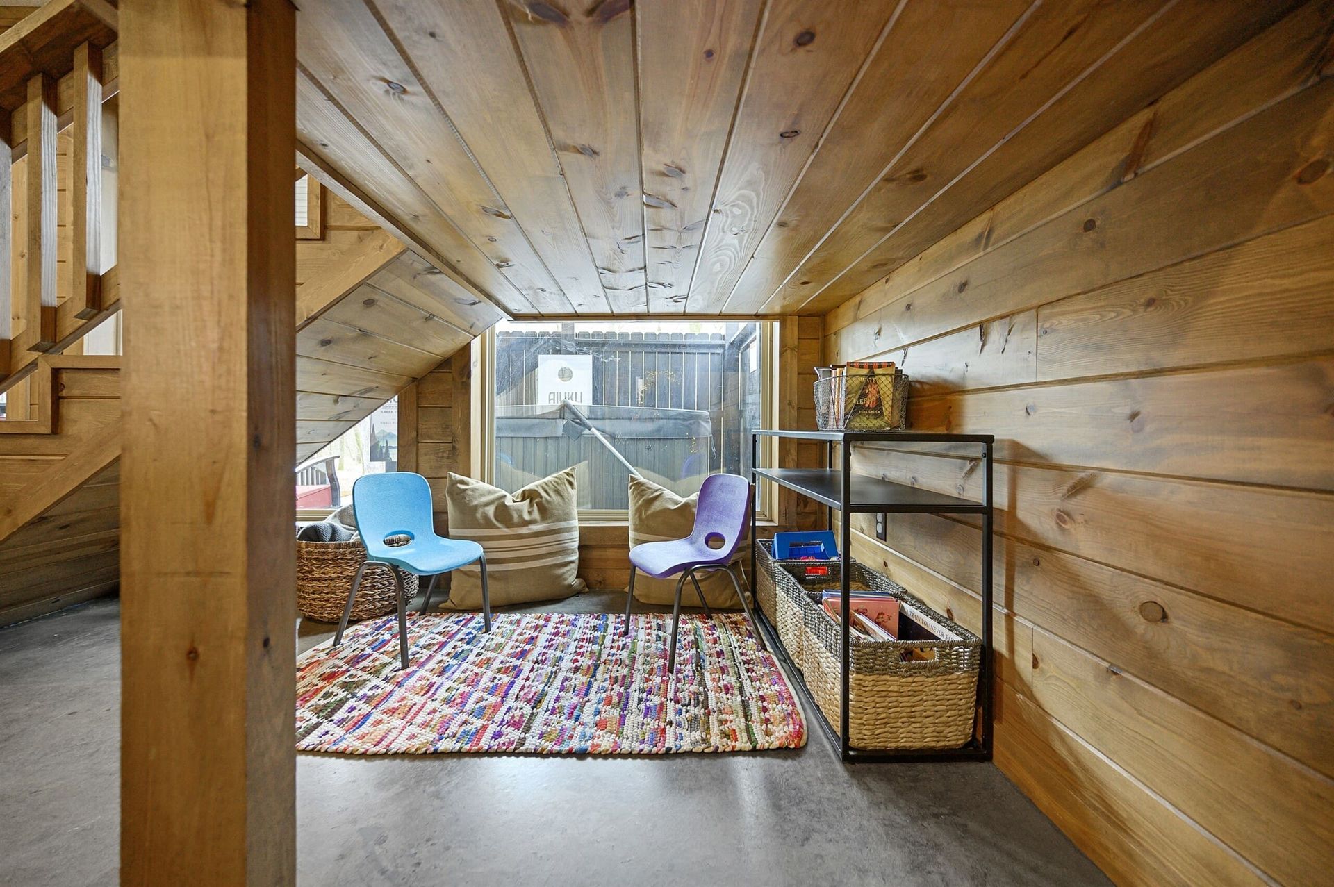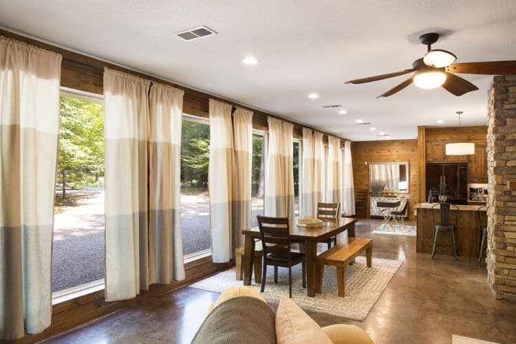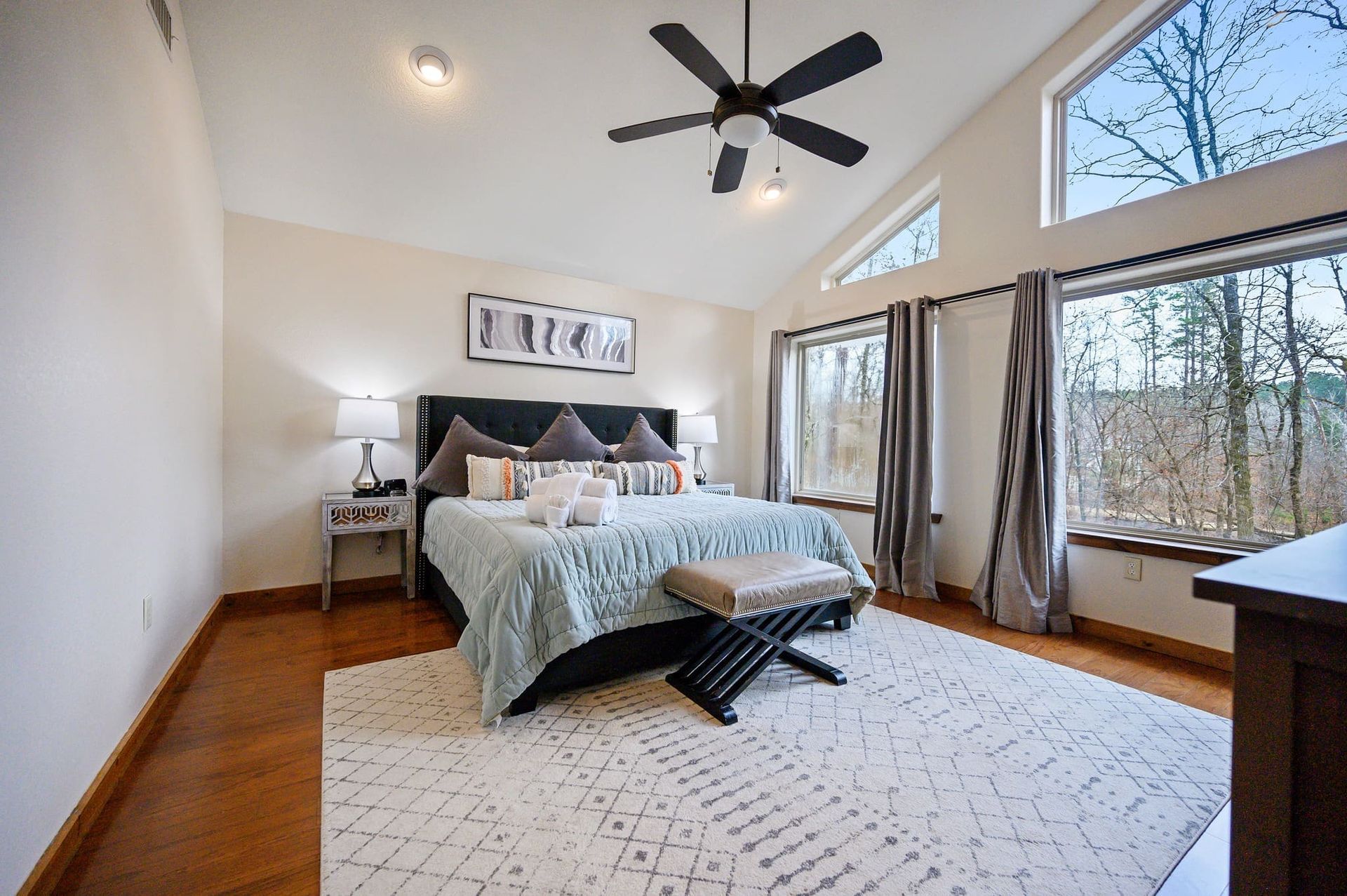 The charm of Aiukli Creek View Cabin extends to its interior, where an open floor plan invites you to be part of the action—floor-to-ceiling windows frame picturesque views, creating a seamless connection to nature. Whip culinary delights in the fully equipped kitchen, gather around the extra-long bar for lively conversations or unwind by the indoor gas fireplace. With amenities like laundry facilities, a work desk, and fast internet, convenience is at your fingertips.