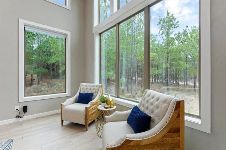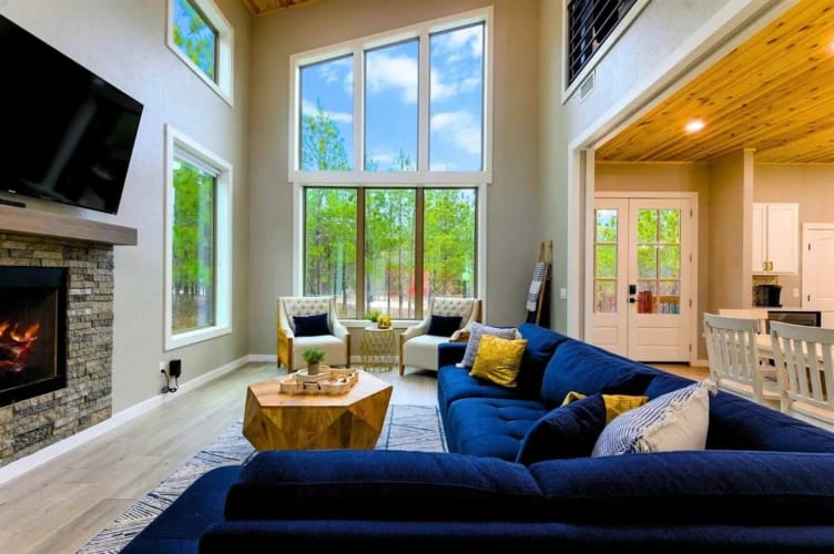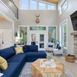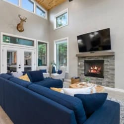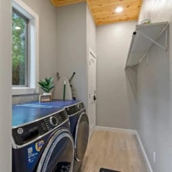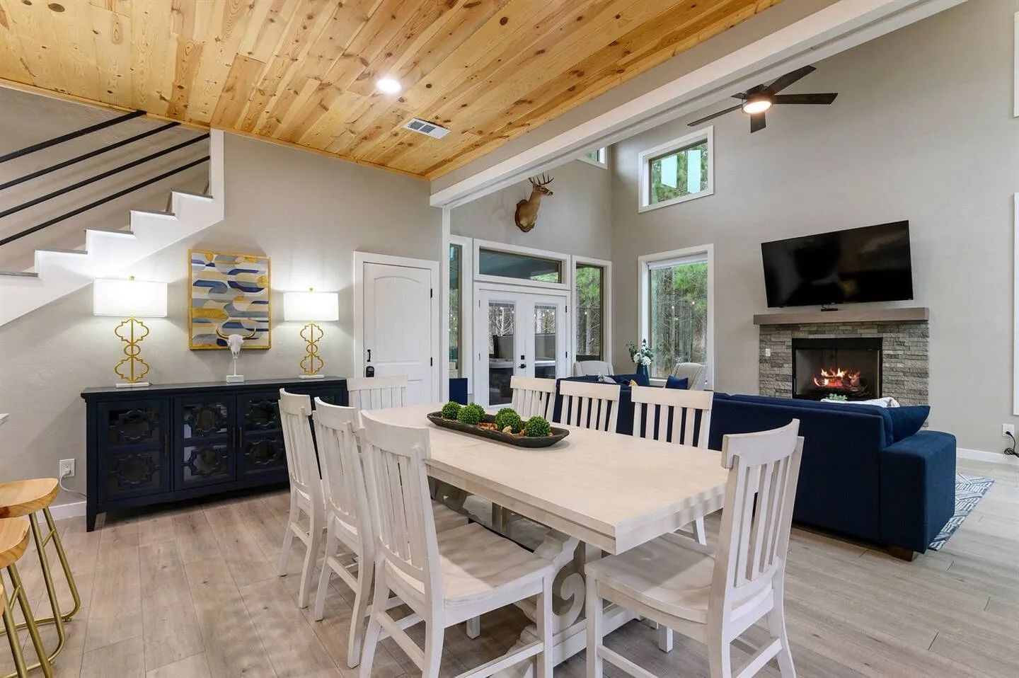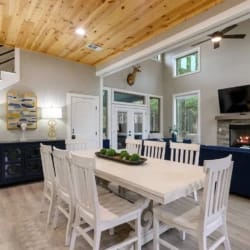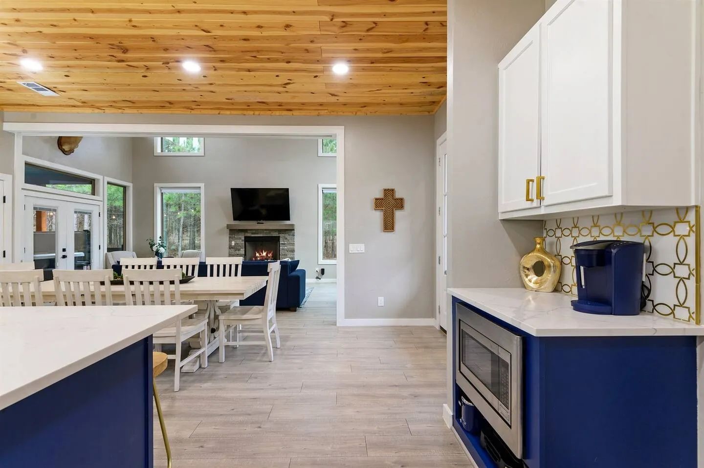 For those who love to cook and entertain, the kitchen inside All Your Promises offers everything needed to prepare memorable meals. Stainless steel appliances gleam against quartz countertops, and the open layout ensures everyone stays connected, even while preparing dinner. A large dining table comfortably seats eight, with additional bar seating for four, making it easy for large groups to enjoy mealtime together. Morning coffee becomes a ritual here, with both drip and pod options available, while the laughter of loved ones fills the air as pancakes flip and the forest quietly stirs outside the windows.