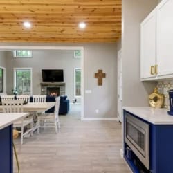 Stepping inside All Your Promises, the spacious living area greets guests with its open-concept design and high vaulted ceilings, allowing sunlight to stream through the large windows. Plush seating surrounds a stone gas fireplace that provides warmth on crisp Oklahoma evenings. Whether lounging with a good book or streaming your favorite series on the Smart TV, every detail here enhances the feeling of cozy indulgence. The scent of pinewood and the fire crackle complete the perfect cabin experience — an embrace that feels like home in every way imaginable.