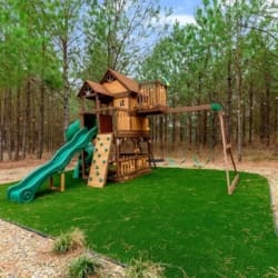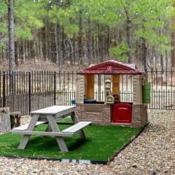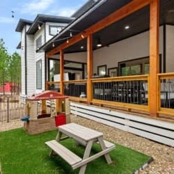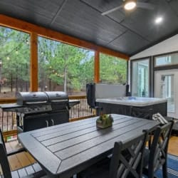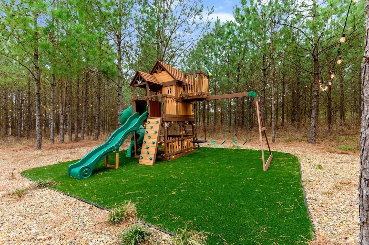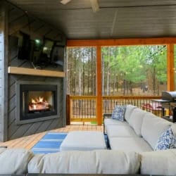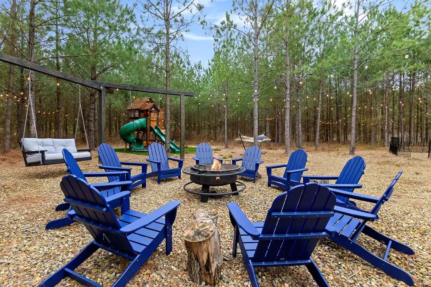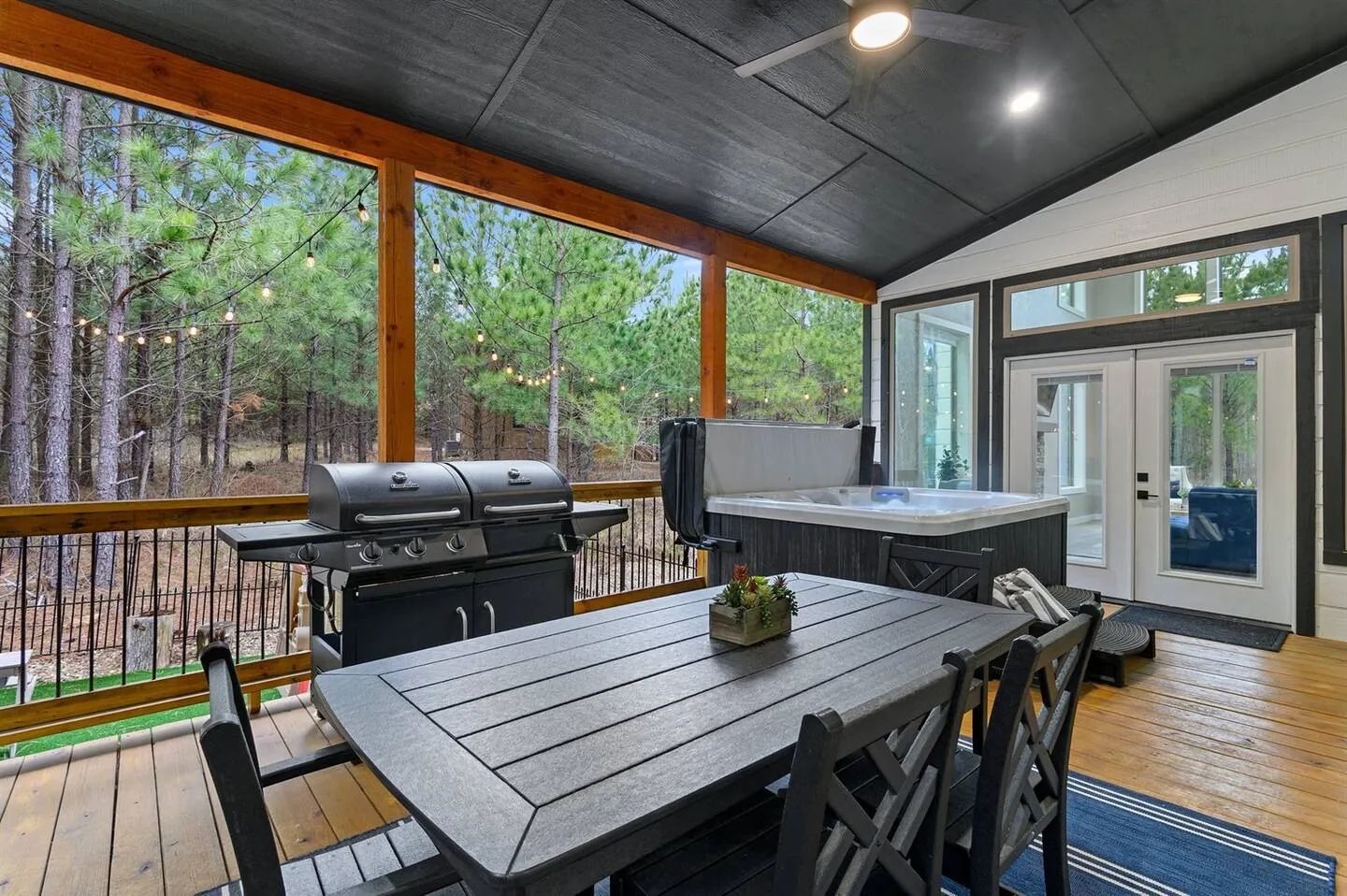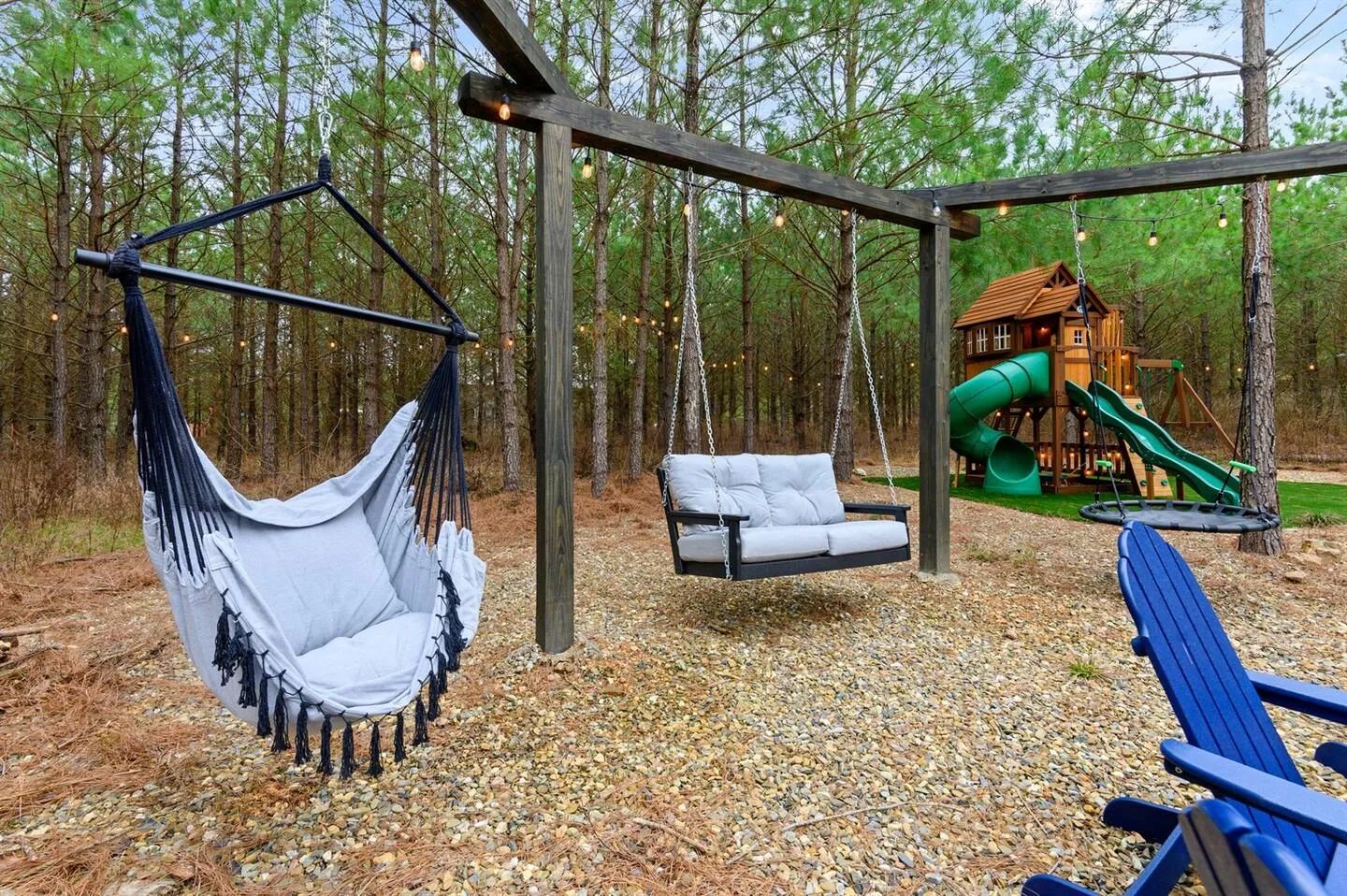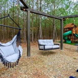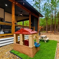 Outdoors, All Your Promises truly shines as an oasis of fun and relaxation. The covered patio features a seven-person hot tub, perfect for unwinding after hiking or exploring Hochatown’s many attractions. The outdoor fireplace casts a warm glow for evening gatherings, while the propane grill and dining area make it easy to enjoy barbecues beneath the starlit sky. Beyond the deck lies a fenced play area for younger guests with a playhouse, swings, and a slide. Adults can relax in hammocks or gather around the firepit with wine, sharing stories and roasting marshmallows as the flames dance under the clear Oklahoma sky.