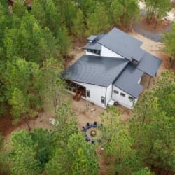 The cabin uses exterior security cameras facing away from cabin and monitoring activity approaching cabin's entrances.