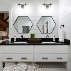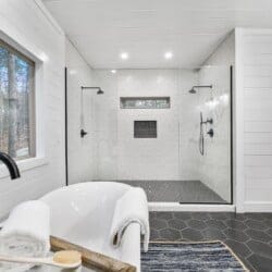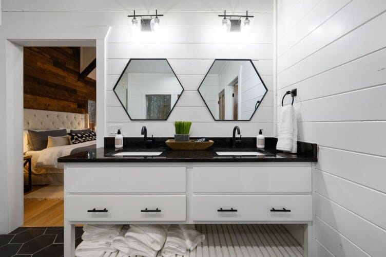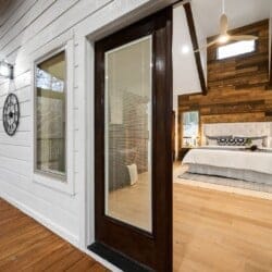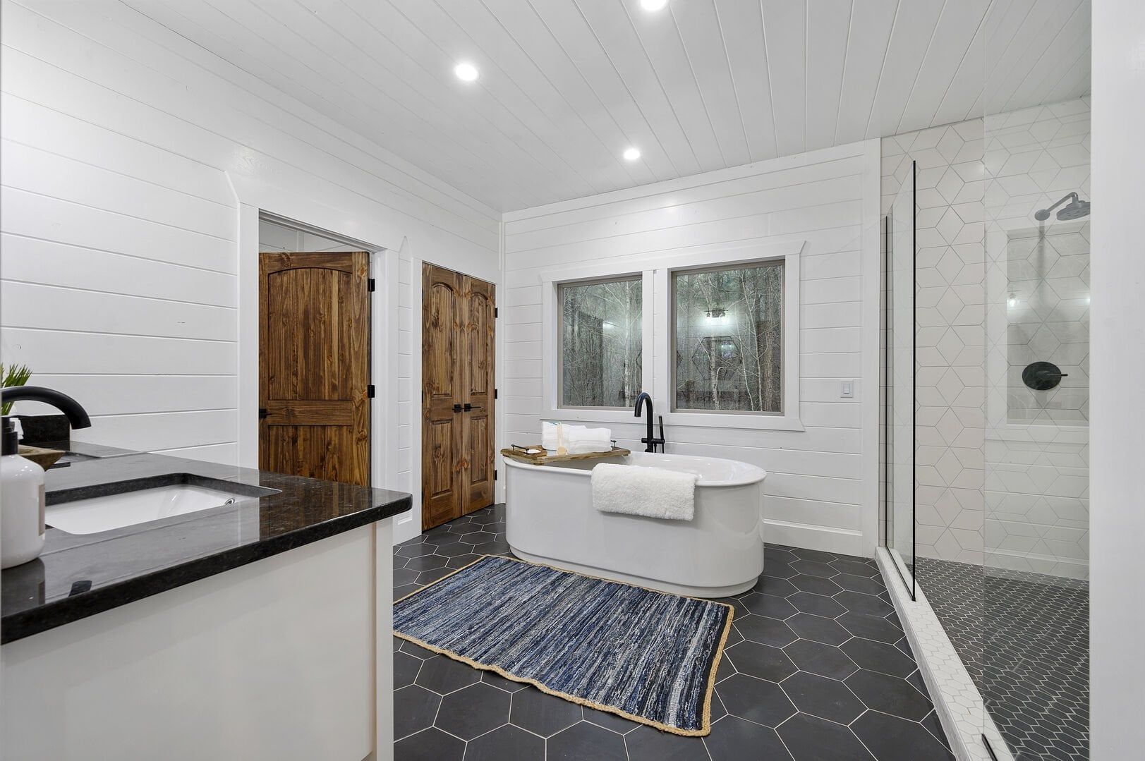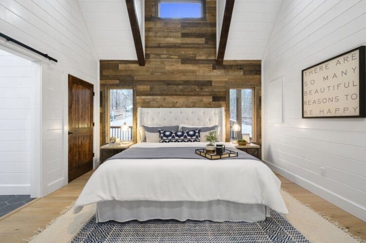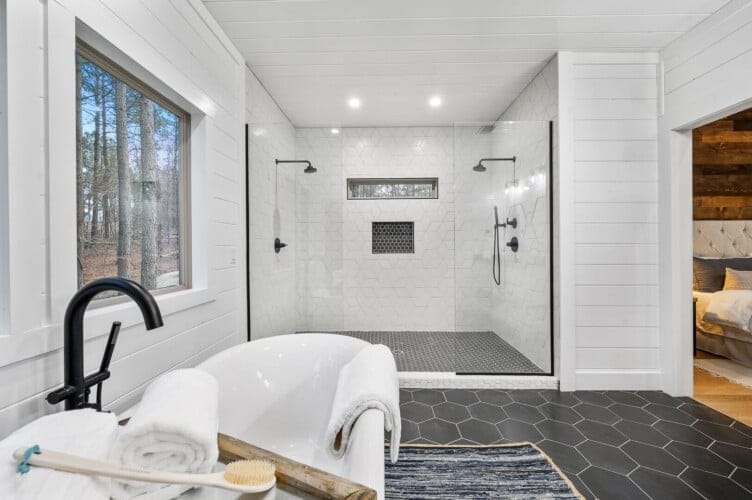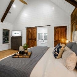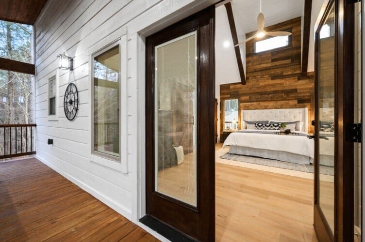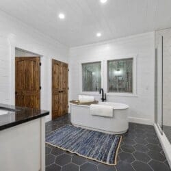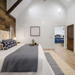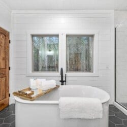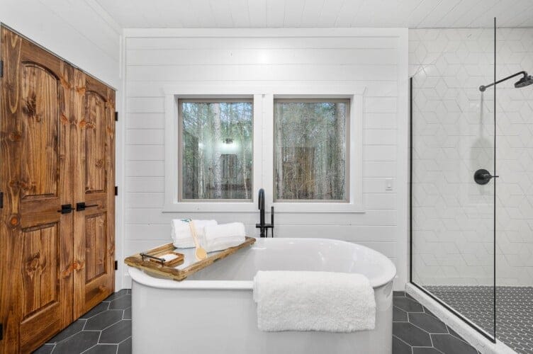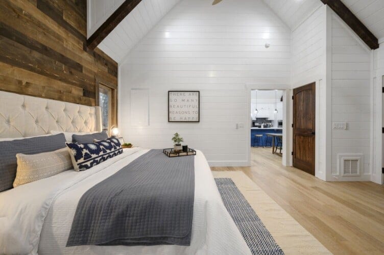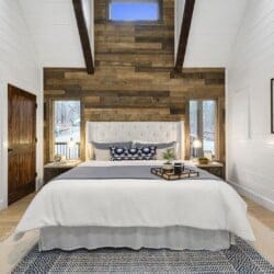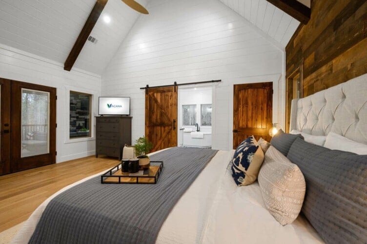 The expansive king bedroom serves as a sanctuary of comfort and relaxation. Here, guests can appreciate the warm, rustic feel, enhanced by exposed wood accents, while enjoying the wonderful views of nature through the large windows. The bedroom also features a bathroom with privacy and luxury, a soaking tub, and a stand-up shower. Guests can indulge in feeling pampered every morning, refreshed and ready for a day of adventure.