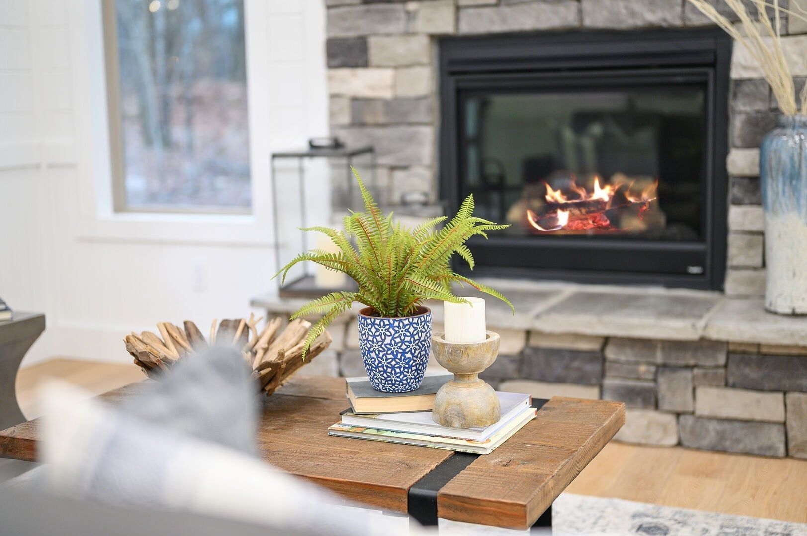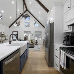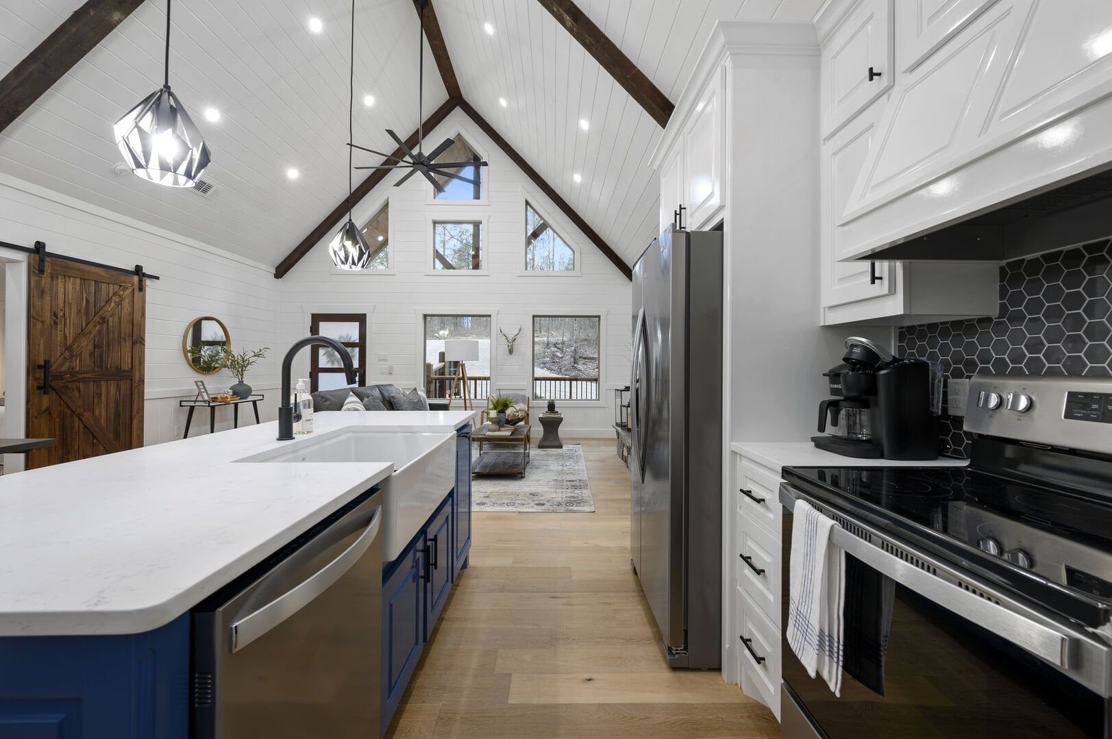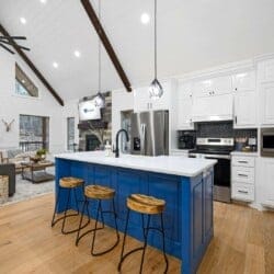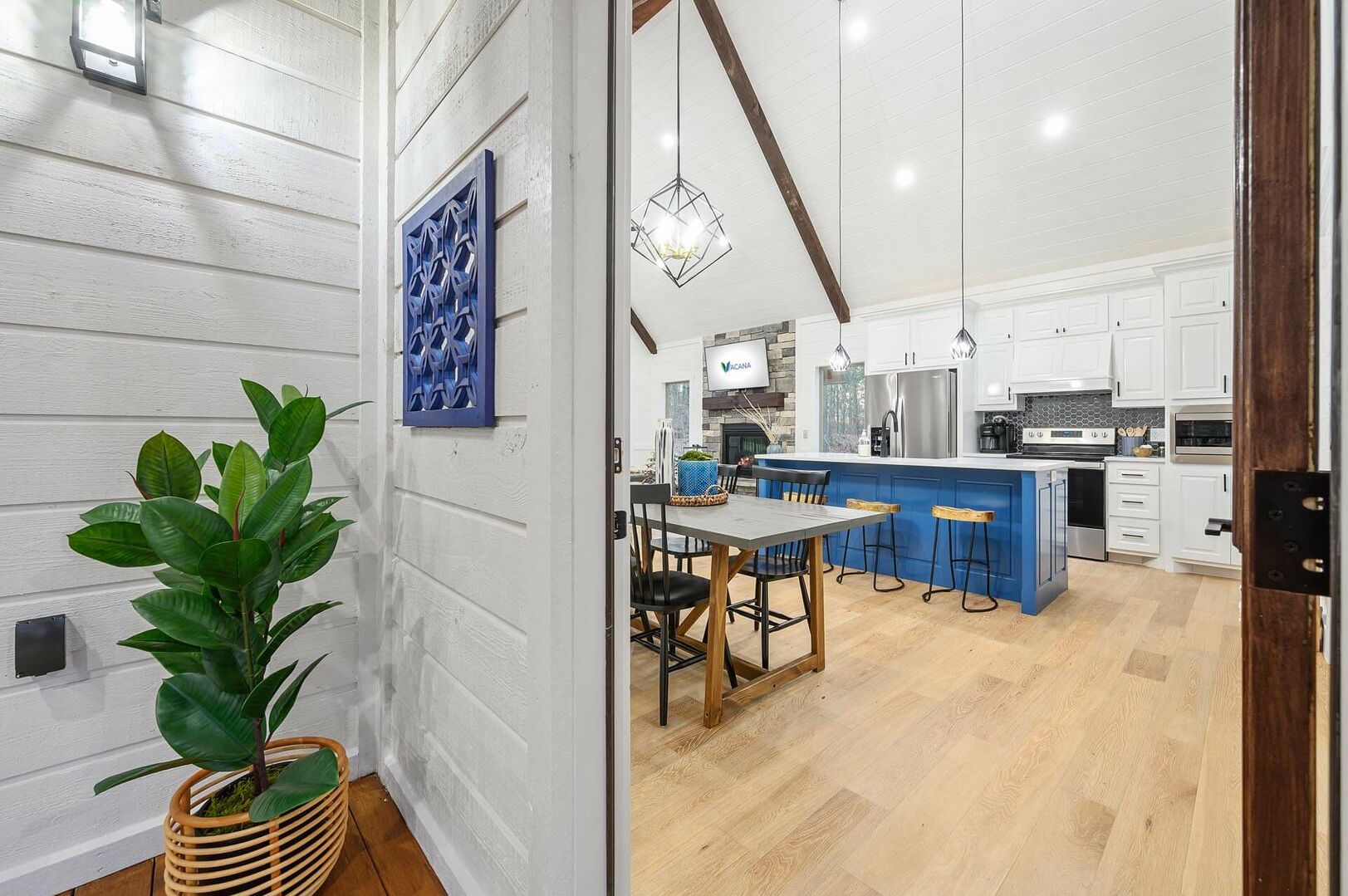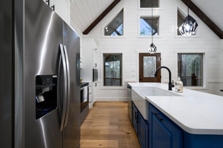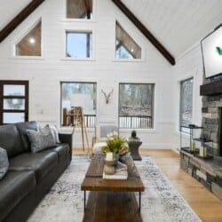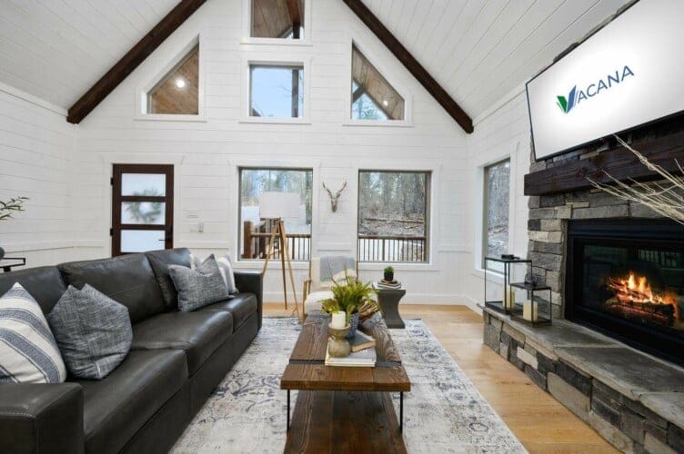 The open-concept living area complements this structure with its stunning wood floor panels stretching invitingly towards breathtaking views. The cathedral ceilings add an element of spaciousness, inviting guests to unwind as they sink into the plush leather couch. A gas fireplace radiates warmth, perfect for evening gatherings as guests gather to enjoy each other’s company or watch their favorite shows on the large flat-screen smart TV.