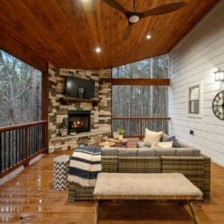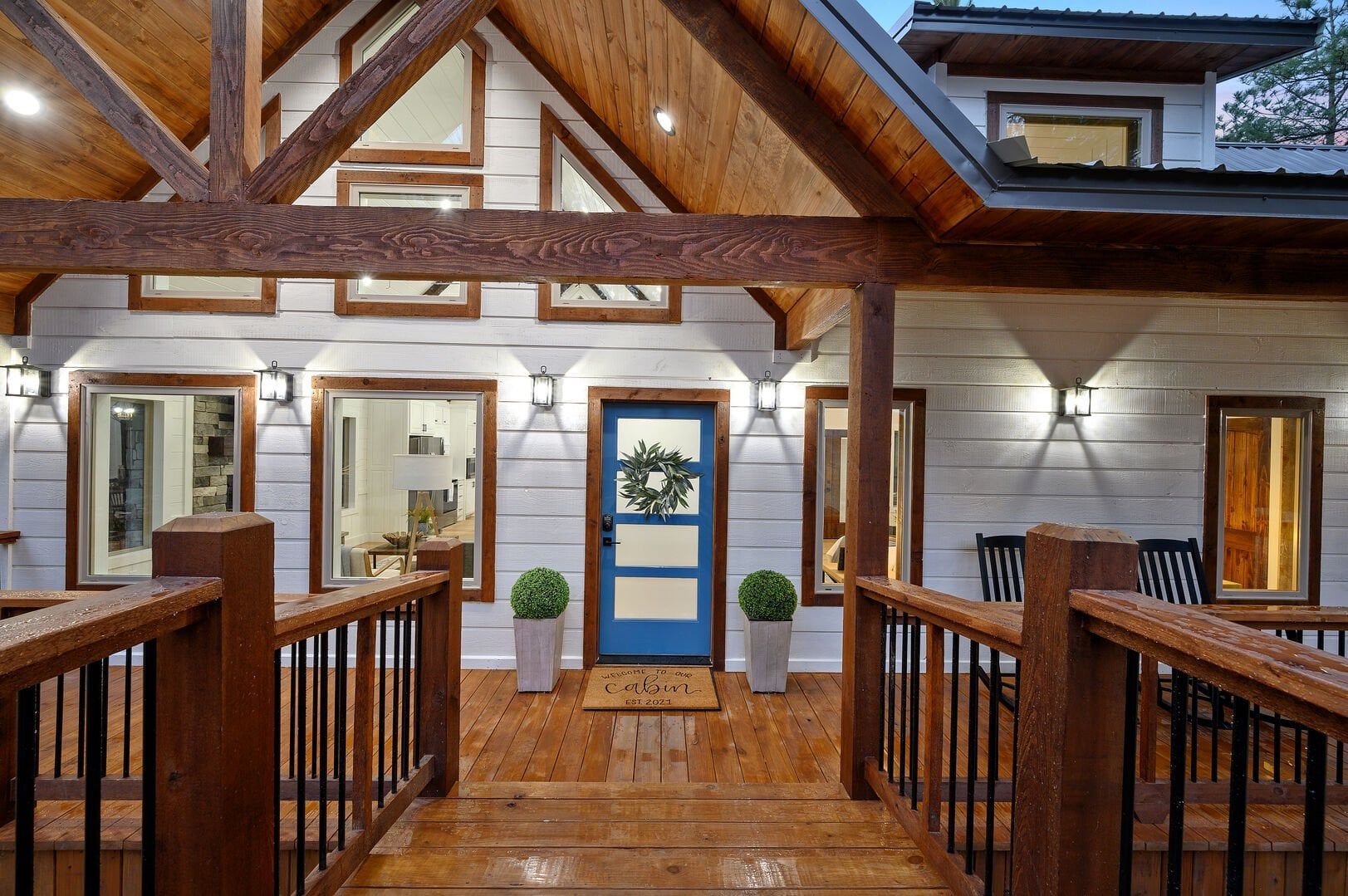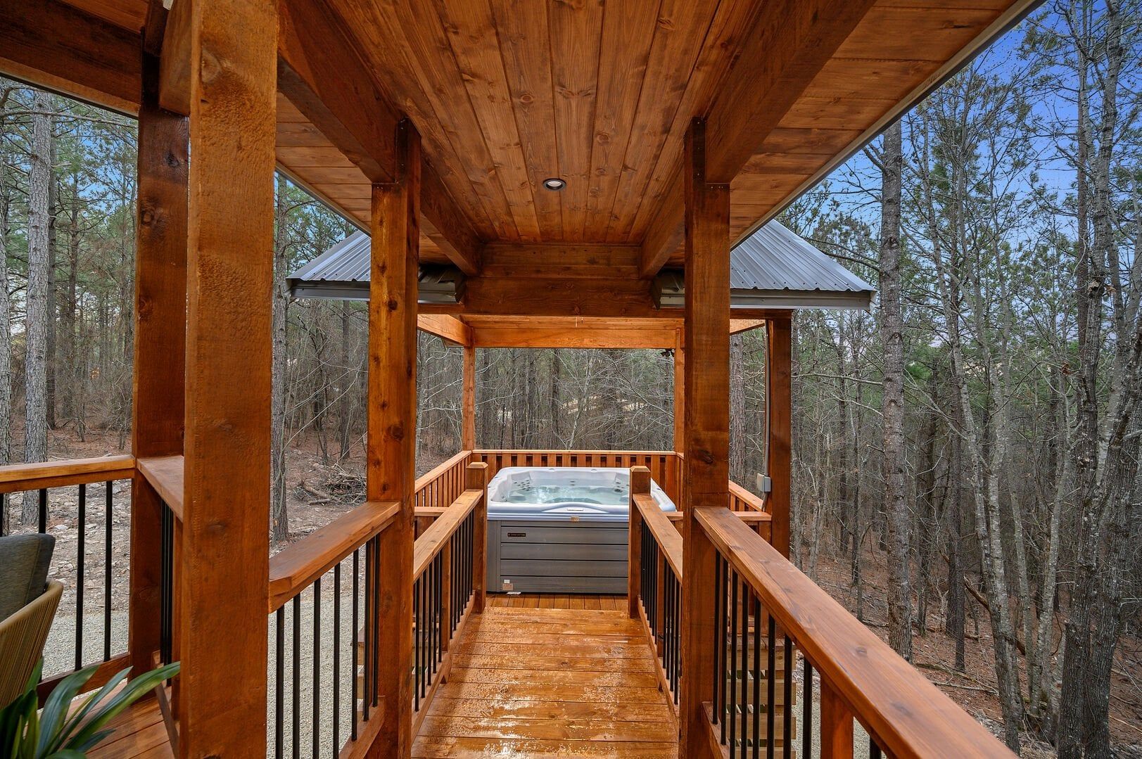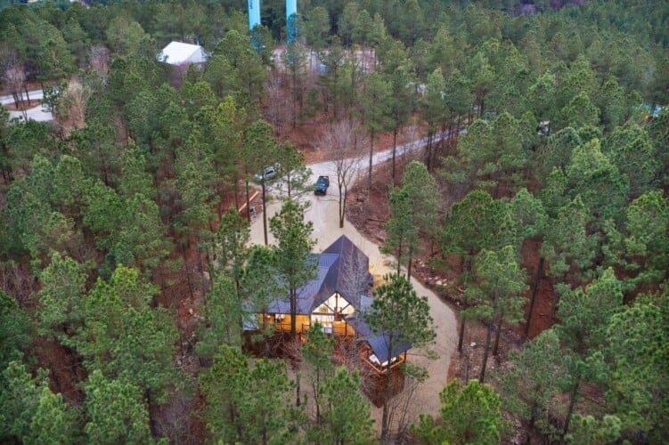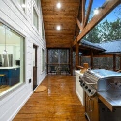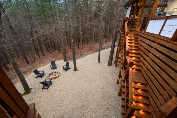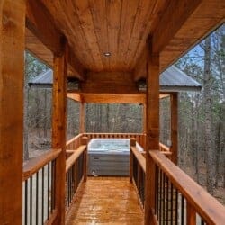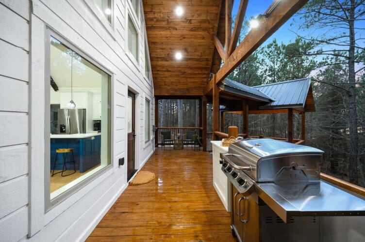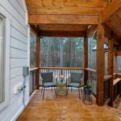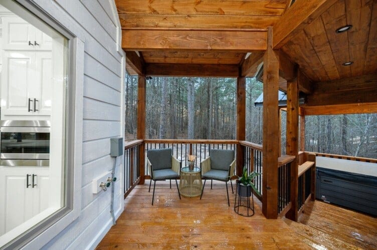 Stepping outside, visitors will be enchanted by the sprawling deck that boasts breathtaking views of tall pine trees enveloping the cabin. The outdoor space is thoughtfully designed to make the most of the serene environment. A gazebo-style hot tub enhances the experience, offering a tranquil escape under the stars with a bottle of wine, completing Allium Inn’s outdoor living experience.