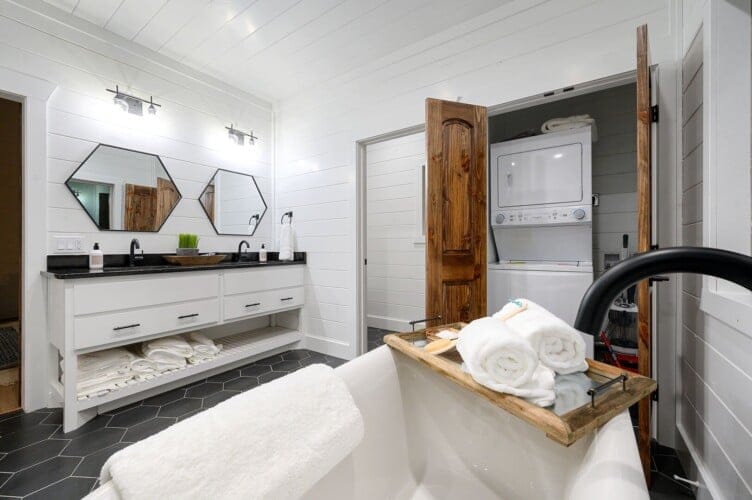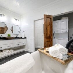 The en-suite bathroom ensures that everything needed is right at hand. Fresh towels, shampoo, conditioner, and body wash provide convenience, while a full-sized washer and dryer keep belongings clean and fresh throughout the stay.