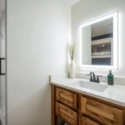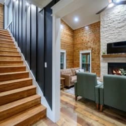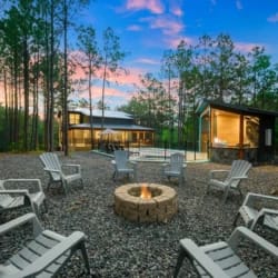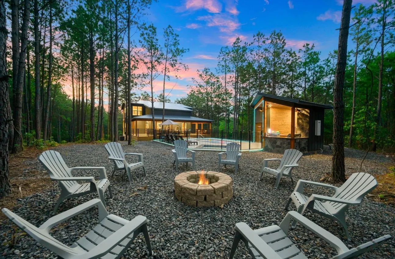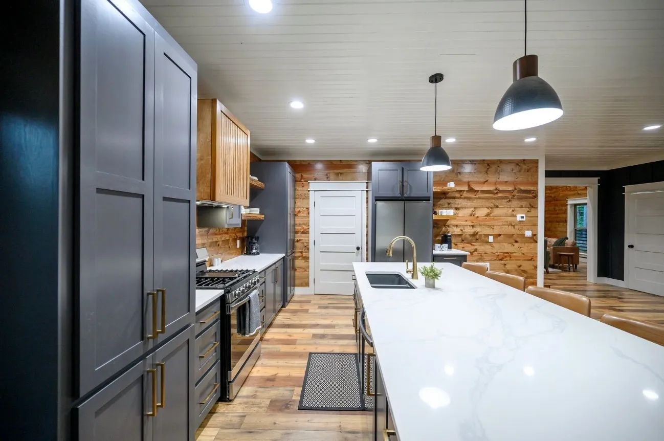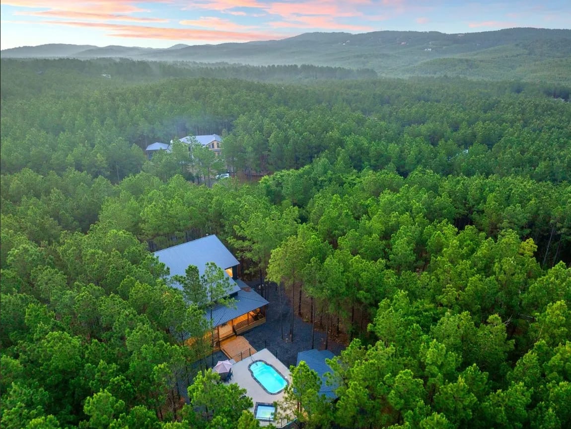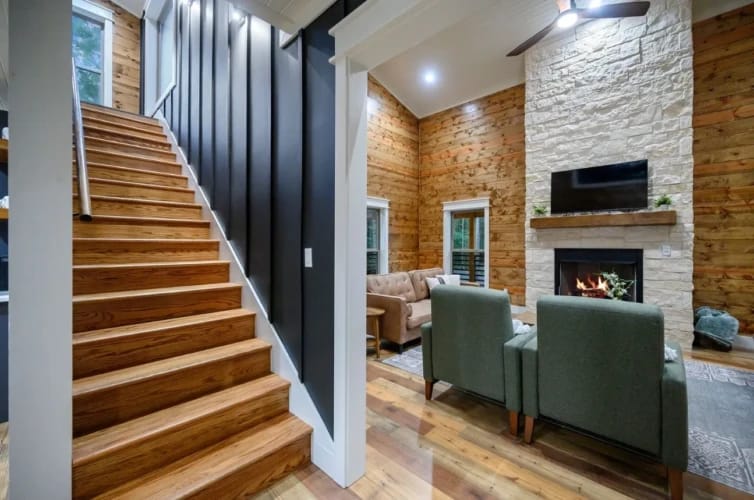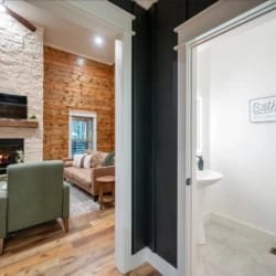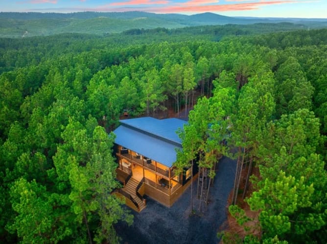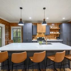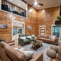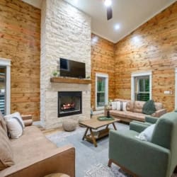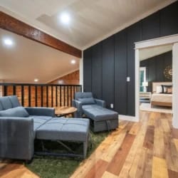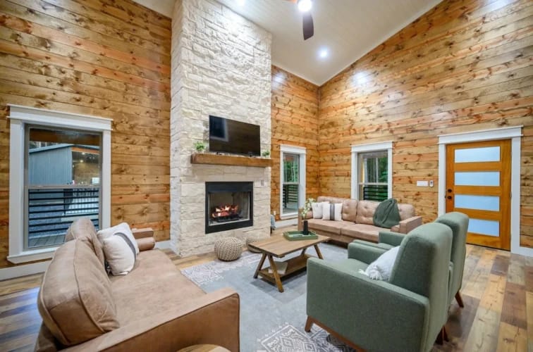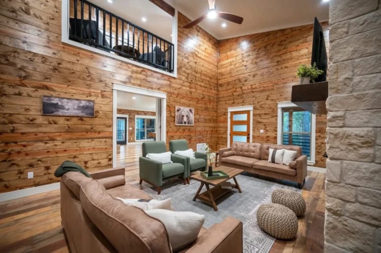 Bearfoot and Bougie is a peaceful and stylish cabin nestled in the heart of Broken Bow. With three spacious bedrooms and three and a half modern bathrooms, Bearfoot and Bougie are ideal for up to eight guests. As soon as you arrive, you’ll notice the thoughtful design and warm atmosphere that makes this place feel like home—only better. The cabin features an open-concept layout, welcoming you into a cozy living area complete with two leather couches, two soft accent chairs, a gas fireplace, and a big-screen TV. Whether you’re catching up on your favorite show or simply enjoying the warmth of the fire, this space is designed for moments of connection.