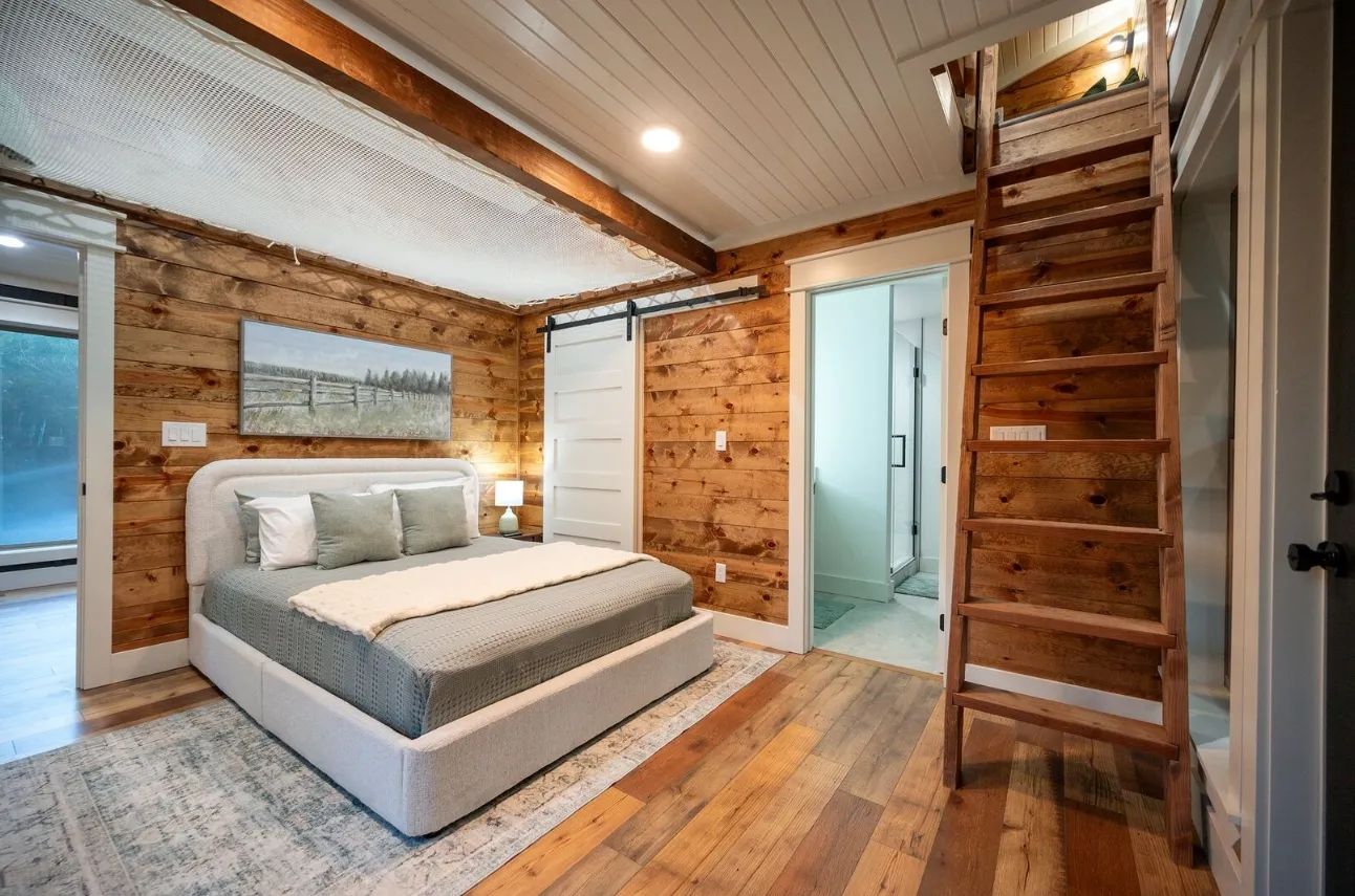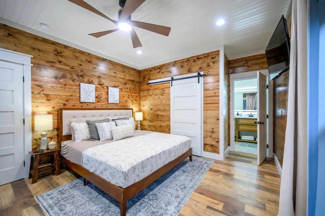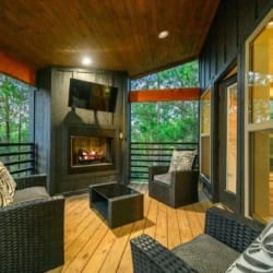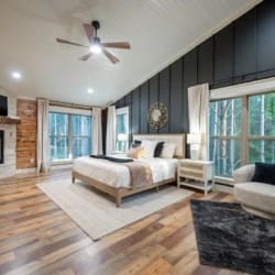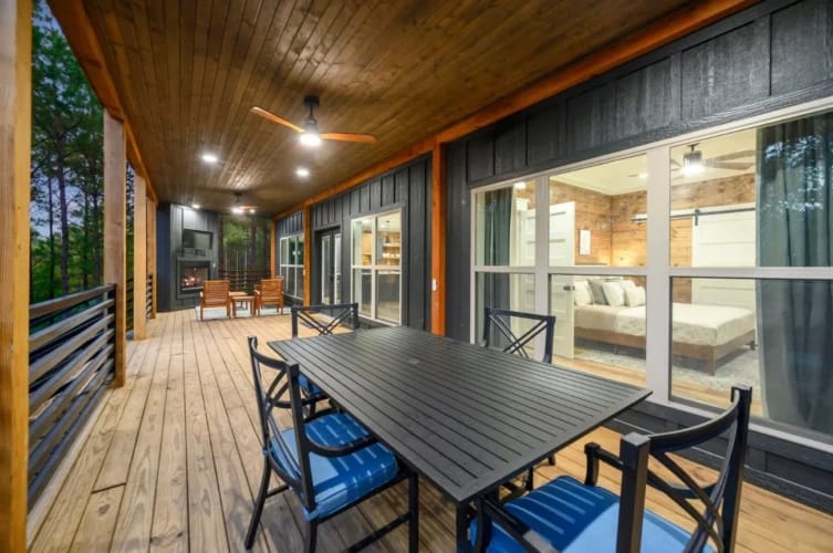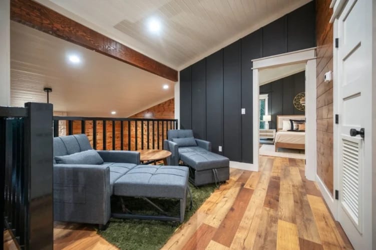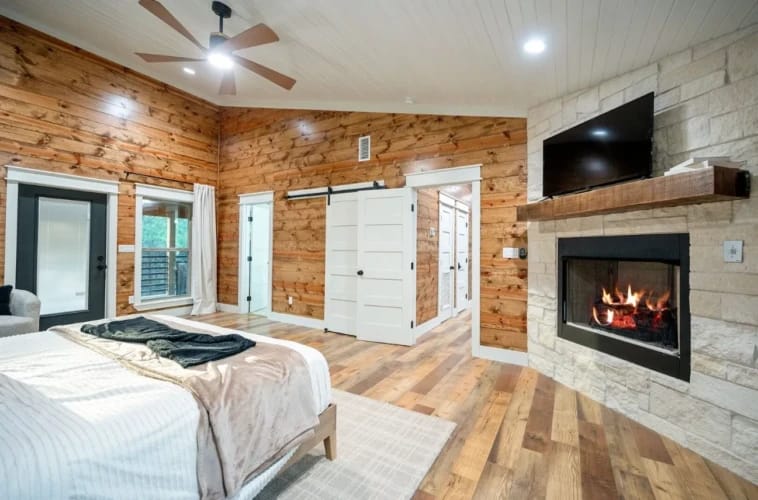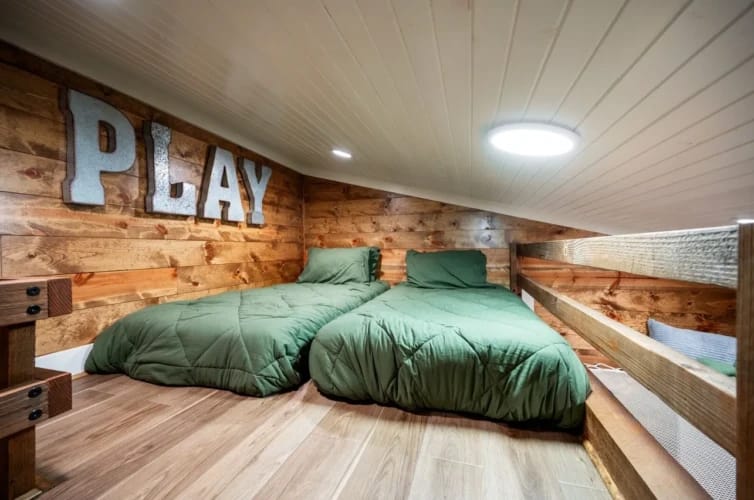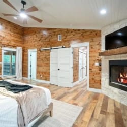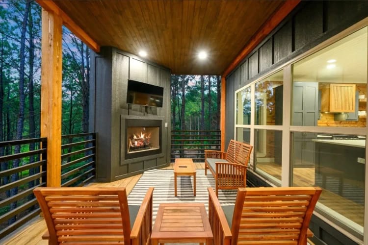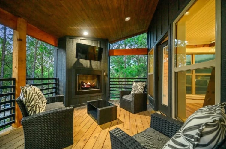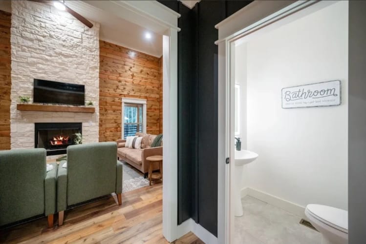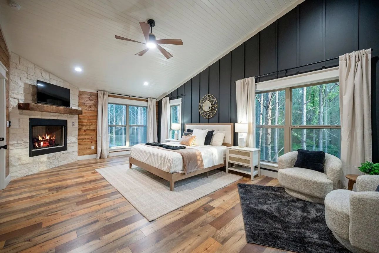 Each of the bedrooms at Bearfoot and Bougie is designed with comfort in mind. The main floor king suite has a luxurious bed and a bathroom with a double vanity and walk-in shower. Upstairs, the second king suite offers not just a fireplace but also direct access to a private balcony where you’ll find another fireplace and a mounted TV—perfect for a quiet morning coffee or late-night movie under the stars. The third bedroom is a bunk-style space that’s perfect for kids or a group of friends, with a queen bed and three twin beds . Each bedroom in Bearfoot and Bougie has its bathroom, so everyone has their own space and privacy.