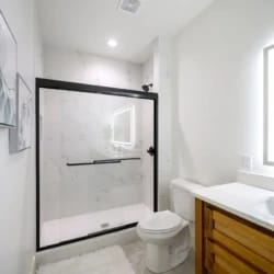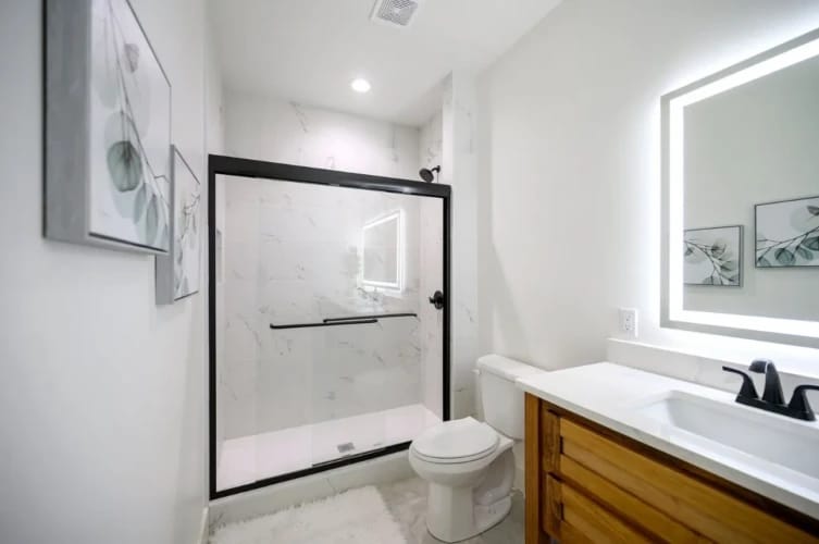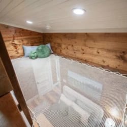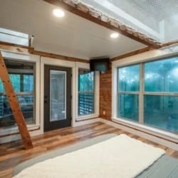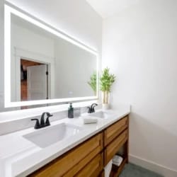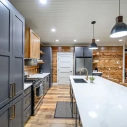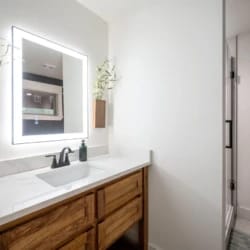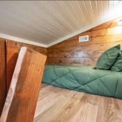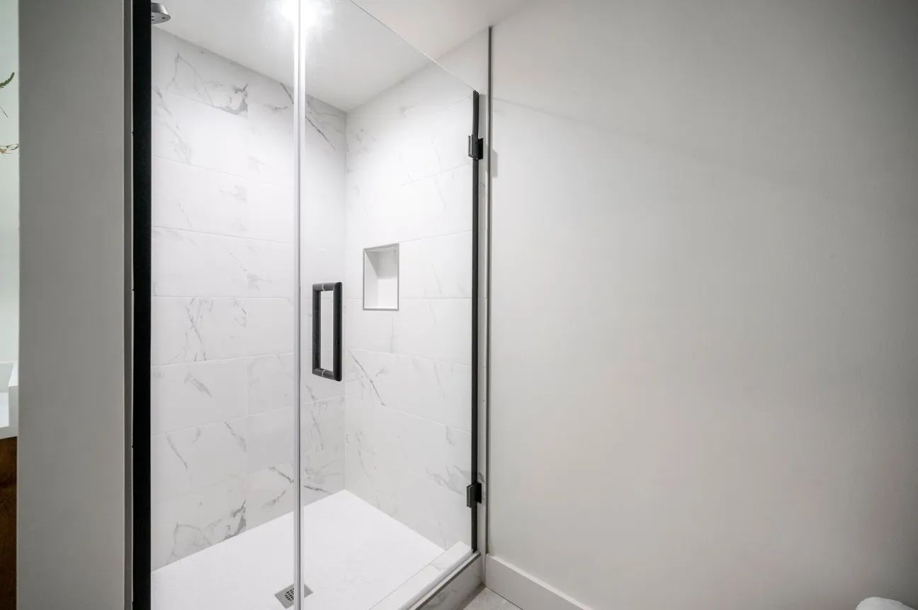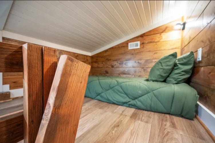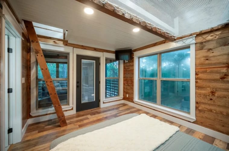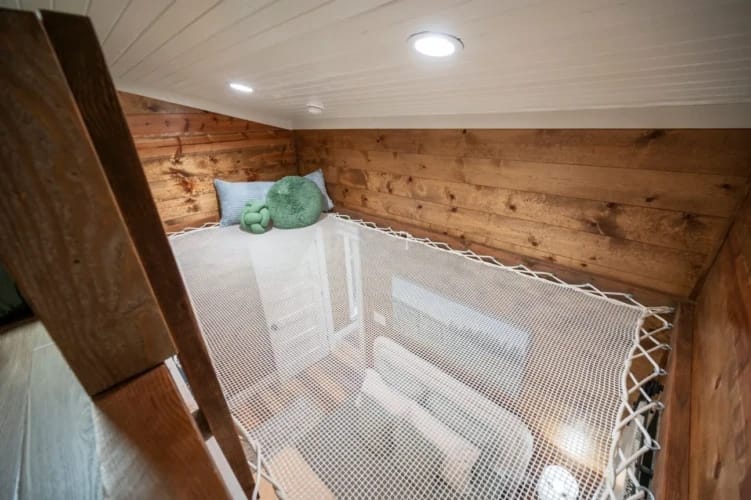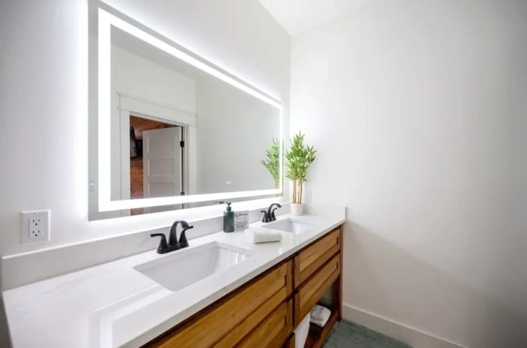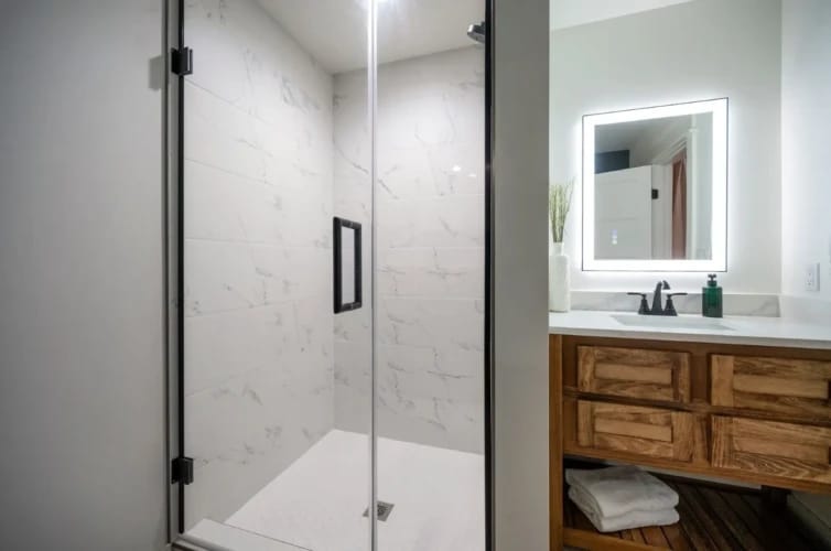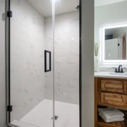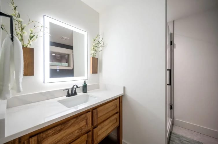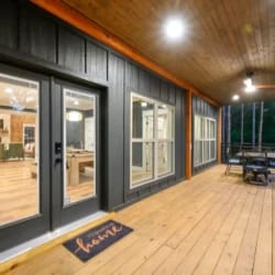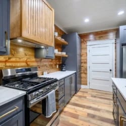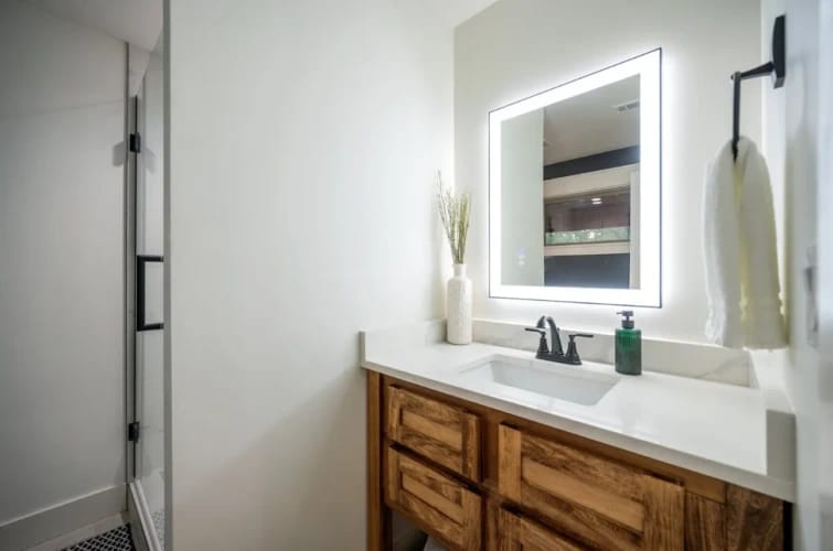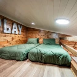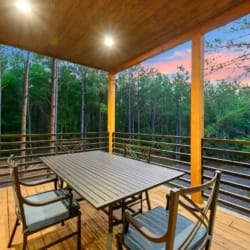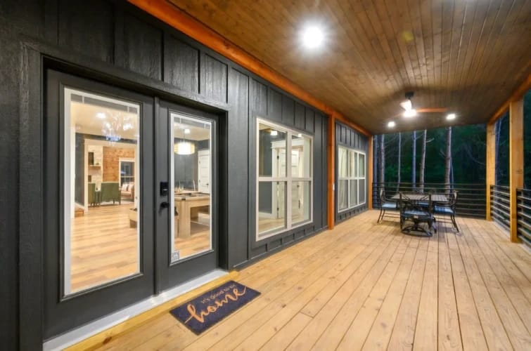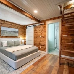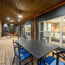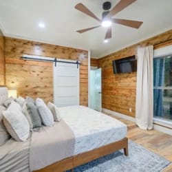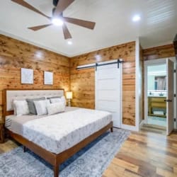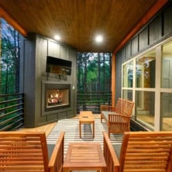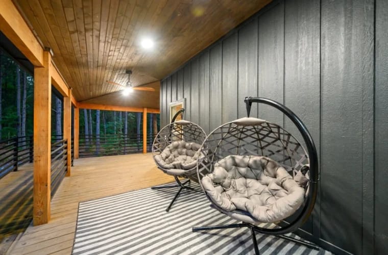Each of the bedrooms at Bearfoot and Bougie is designed with comfort in mind. The main floor king suite has a luxurious bed and a bathroom with a double vanity and walk-in shower. Upstairs, the second king suite offers not just a fireplace but also direct access to a private balcony where you’ll find another fireplace and a mounted TV—perfect for a quiet morning coffee or late-night movie under the stars. The third bedroom is a bunk-style space that’s perfect for kids or a group of friends, with a queen bed and three twin beds . Each bedroom in Bearfoot and Bougie has its bathroom, so everyone has their own space and privacy.