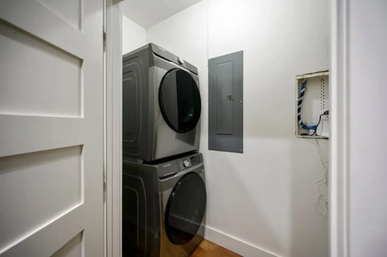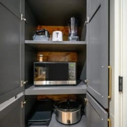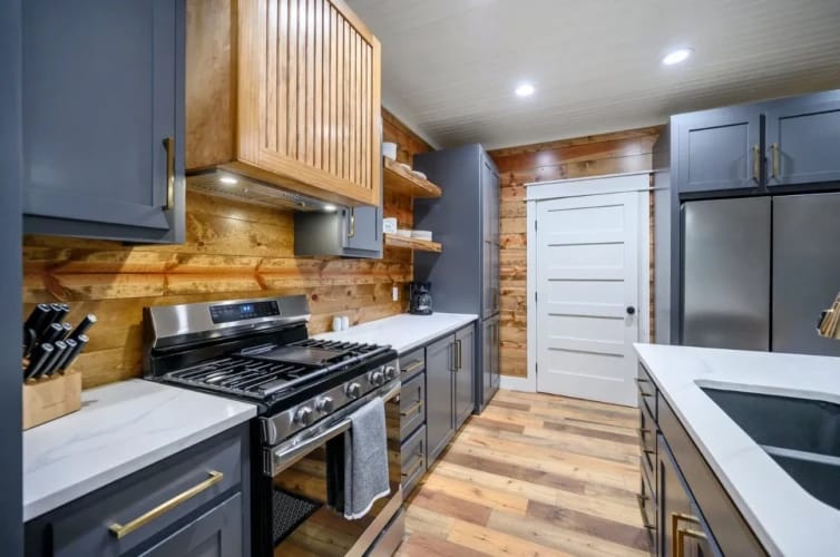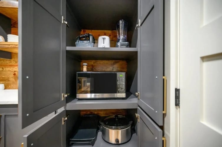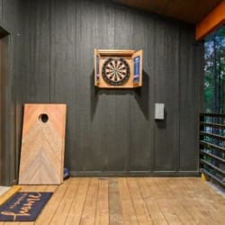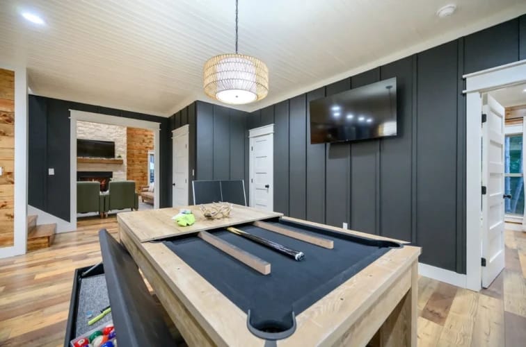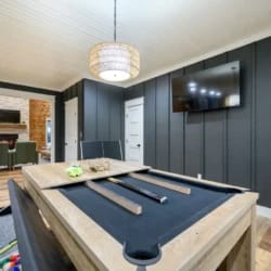 In Bearfoot and Bougie, the kitchen truly feels like the heart of the home. Fully stocked with everything you need to cook a great meal, it comes with both a regular coffee maker and a Keurig, so everyone gets their morning fix just right. There’s a large island with seating for five and a dining table that seats eight—but here’s the twist: that same table doubles as a pool table, making it a fun gathering spot for both meals and games. Right off the dining room is a convenient half bath, and there’s even a full laundry room with a washer and dryer.