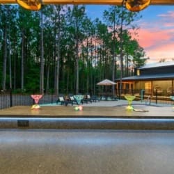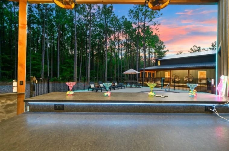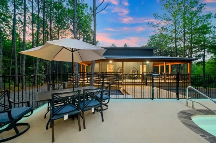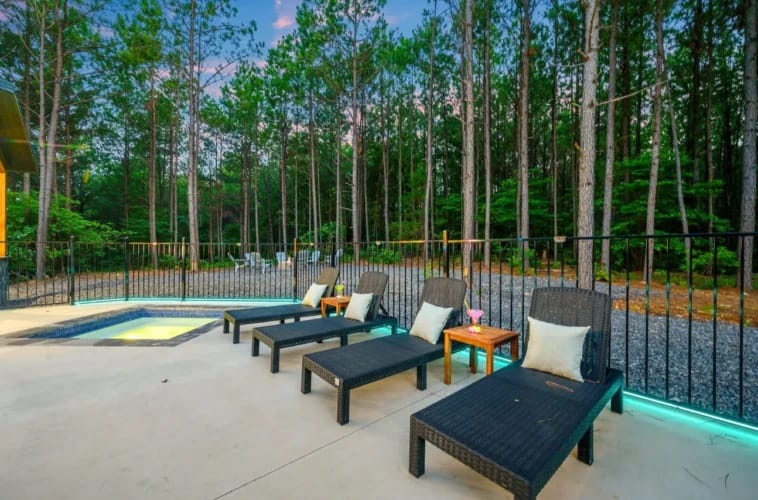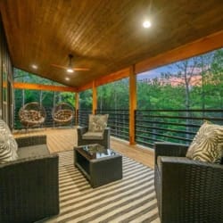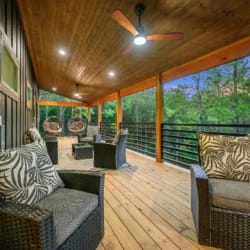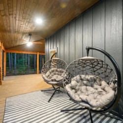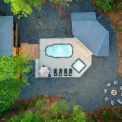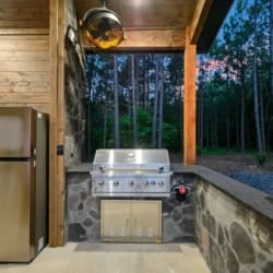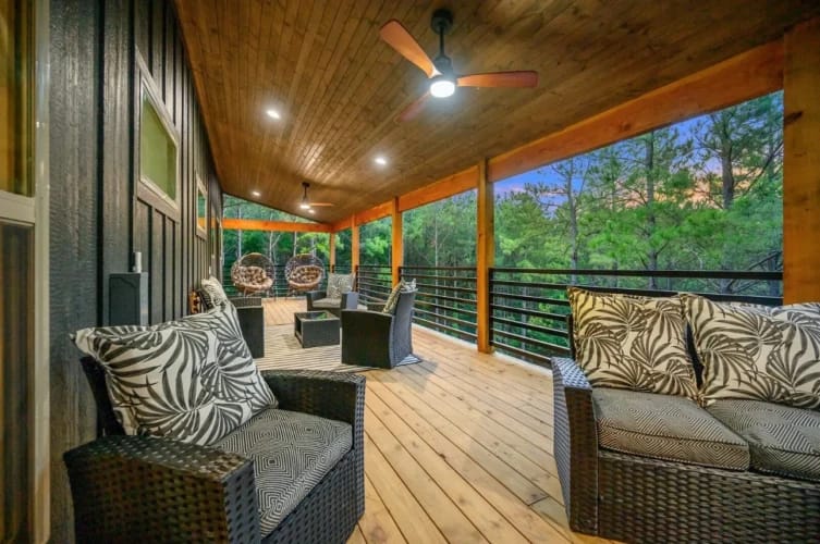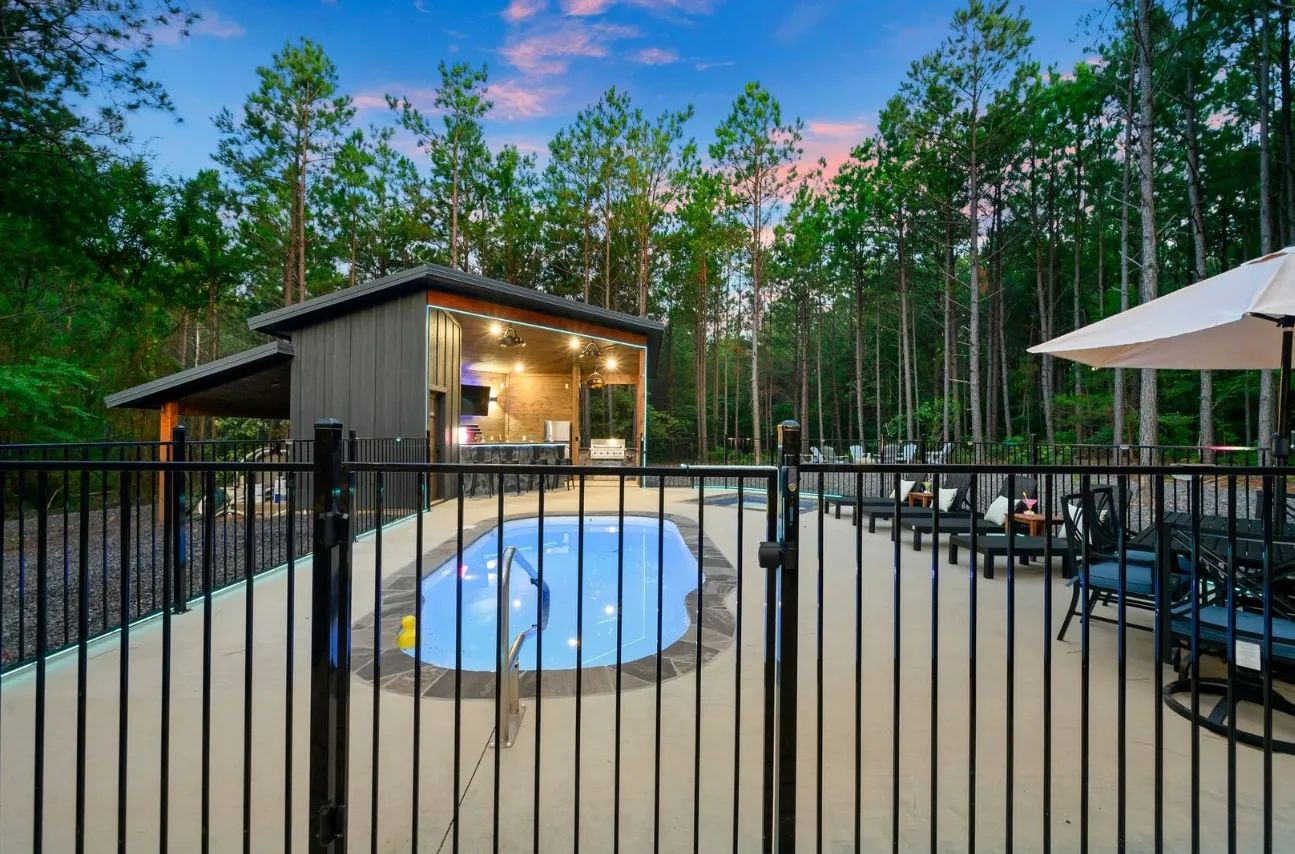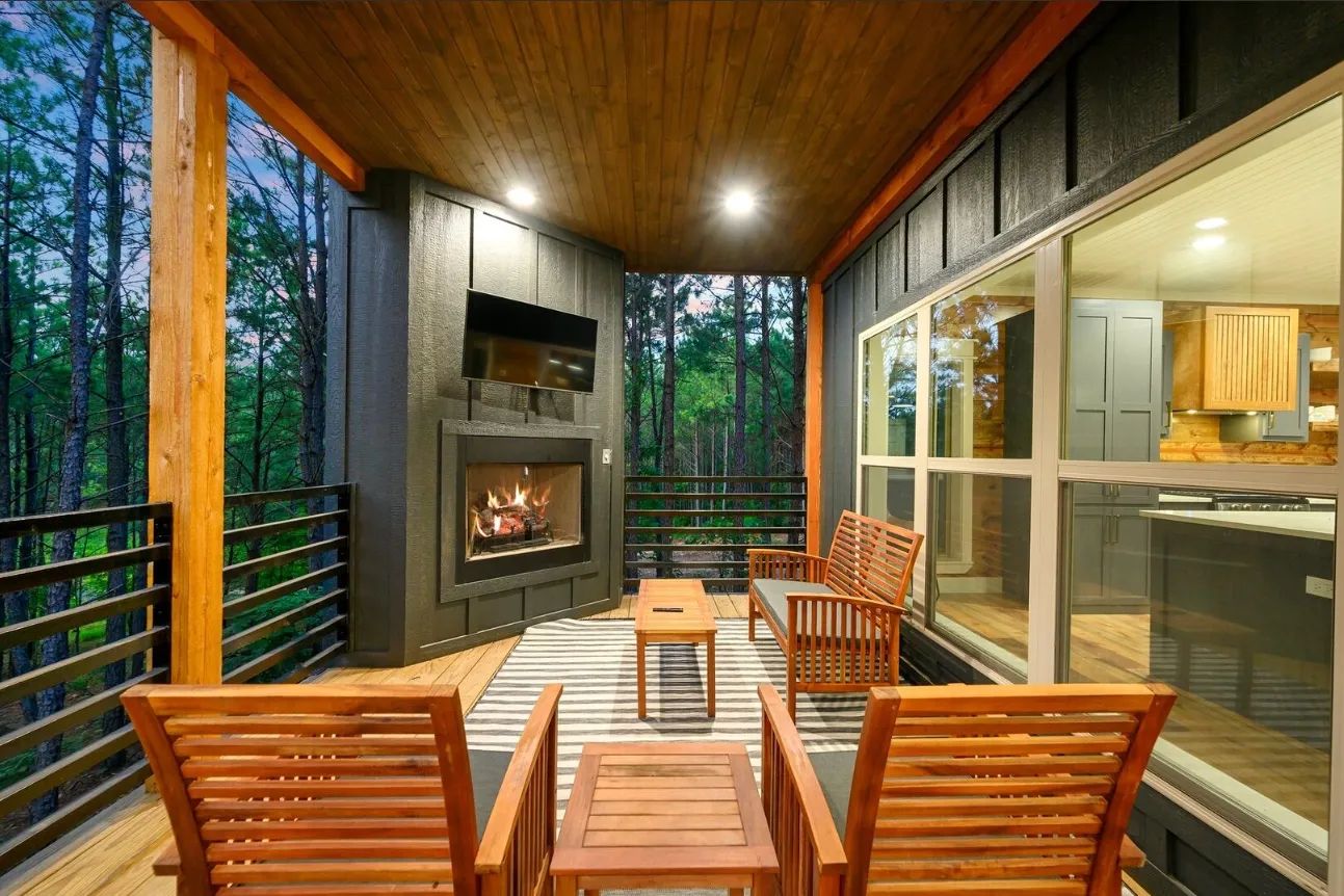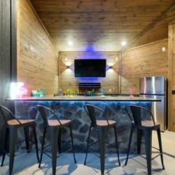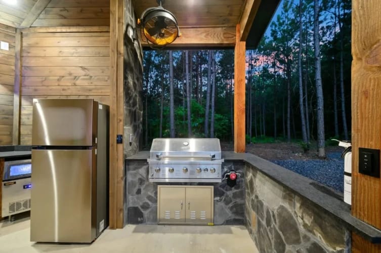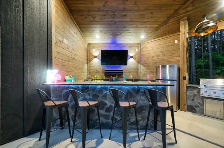 Step outside at Bearfoot and Bougie, and the real magic begins. The covered patio invites you to relax by the gas fireplace while watching TV or enjoying a meal at the outdoor dining table. The fenced-in pool and hot tub offer a perfect way to cool off during warm afternoons or soak under the stars at night. The outdoor kitchen is fully loaded with a gas grill, a full-size fridge, bar seating, and another large TV—ideal for game days or summer cookouts. The front porch has even more seating and space to enjoy the fresh air and peaceful surroundings.