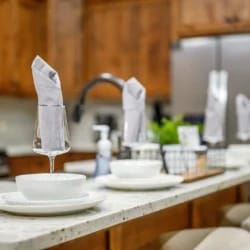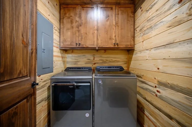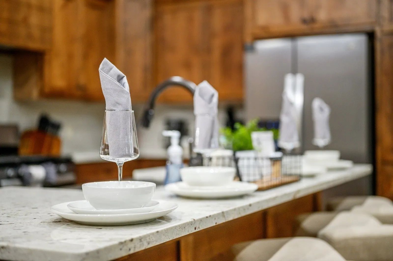 Preparing meals and sharing them becomes a highlight of the stay at Blue Horizon, where the fully stocked kitchen offers everything needed for breakfasts, family-style dinners, and snacks between swims. With modern appliances, generous counter space, and all necessary cookware, the kitchen at Blue Horizon is designed to make cooking enjoyable rather than a chore. The dining table provides comfortable seating for six, creating a natural place for conversations to unfold, while the kitchen island offers extra room for guests to snack, sip, or help prepare a meal. With a laundry room adjacent to the kitchen, Blue Horizon ensures convenience is always within reach, especially for more extended stays or families traveling with children.