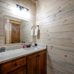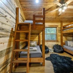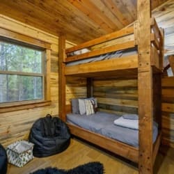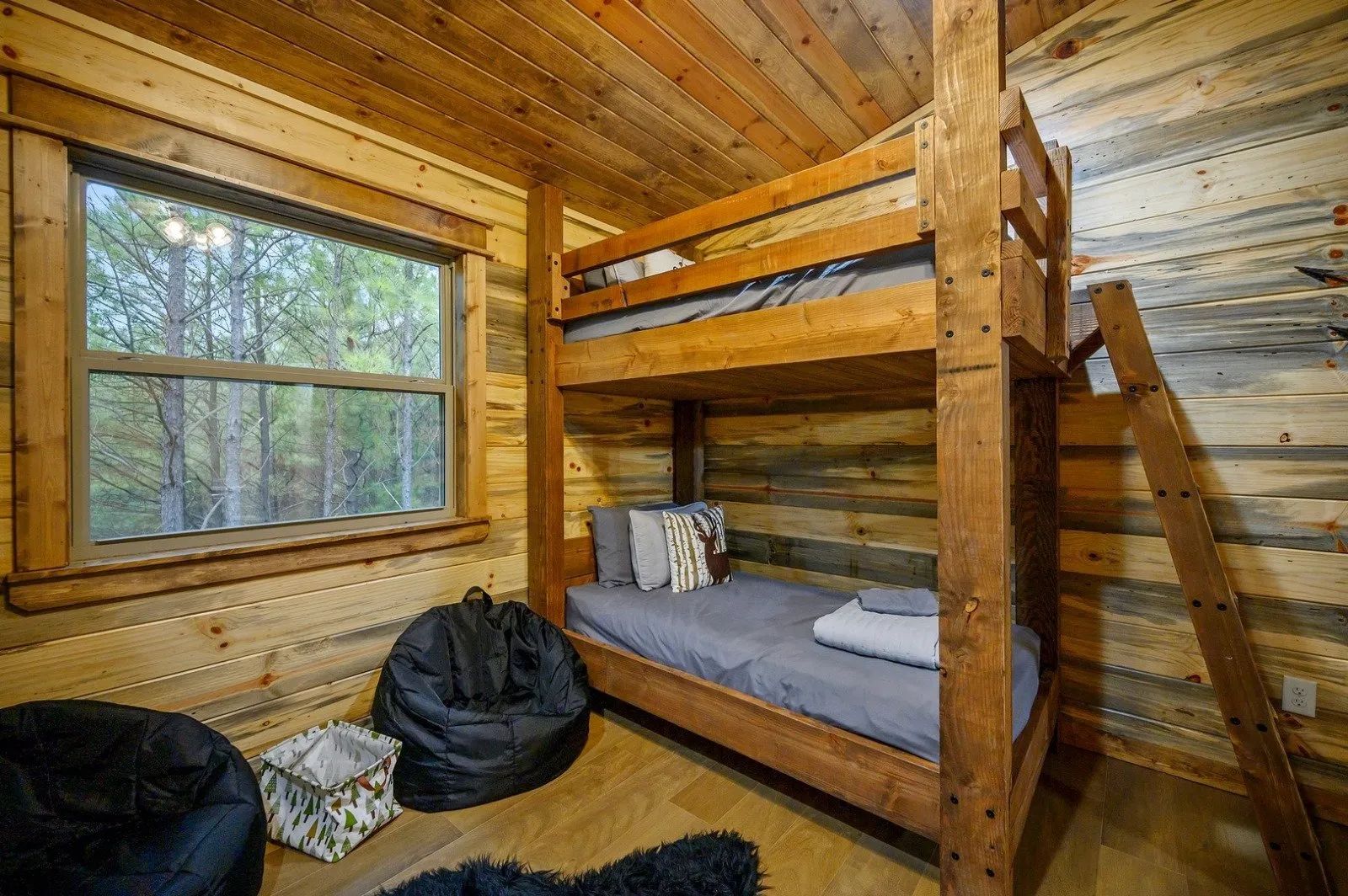 The bedrooms at Blue Horizon offer peaceful retreats tailored for deep rest after days spent exploring the area or enjoying the amenities. The main floor king suite at Blue Horizon is a favorite among guests, thanks to its direct patio access and spa-like ensuite bathroom featuring a double vanity and a spacious walk-in shower. Upstairs, the Queen Suite at Blue Horizon provides a quiet and comfortable escape, featuring soft bedding, warm lighting, and a private en-suite for added convenience. The second-floor bunk room brings out the playful side of travel, providing a bright and welcoming space equipped with double-stacked bunks, a TV, and its own bathroom so kids and teens have their own comfortable corner of Blue Horizon to enjoy.