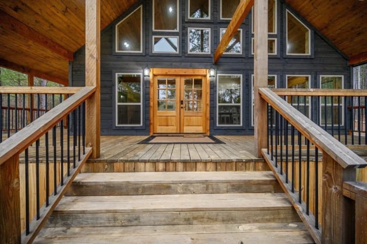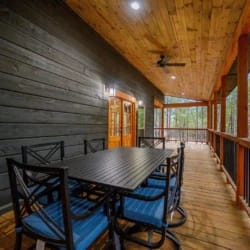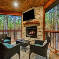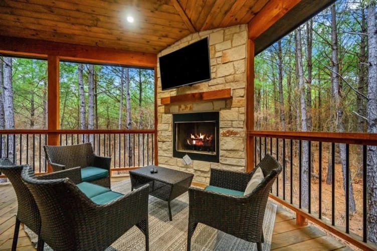 Beyond the interior comforts, the outdoor living experience at Blue Horizon is what truly elevates a getaway into a whole vacation. The covered patio offers a perfect gathering spot, complete with a gas fireplace and mounted TV, allowing guests to unwind outside regardless of the weather while enjoying the calming surroundings of Blue Horizon. The outdoor dining table creates the opportunity for alfresco meals that feel relaxed and refreshing, whether it’s a casual lunch or a candlelit dinner beneath the night sky. With a gas grill ready for cookouts, Blue Horizon encourages guests to slow down, savor their time together, and enjoy the crisp, pine-scented air.