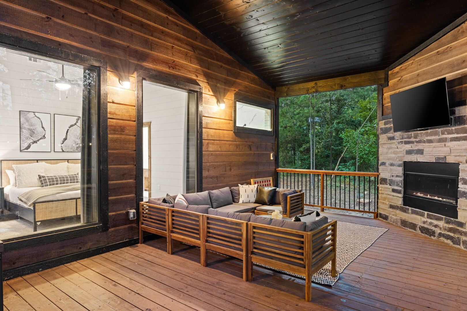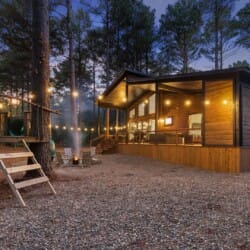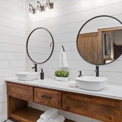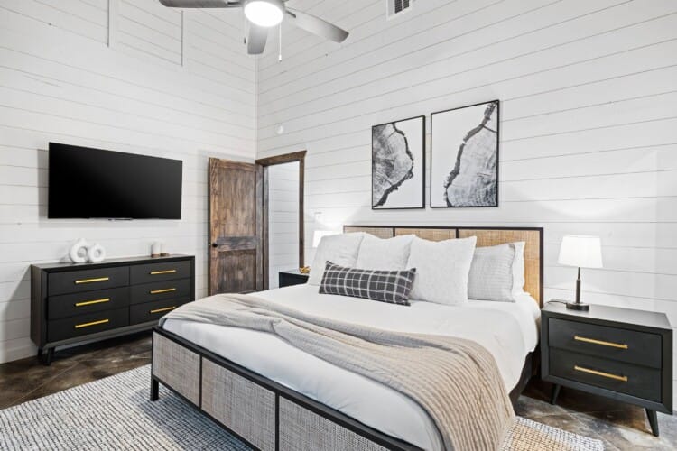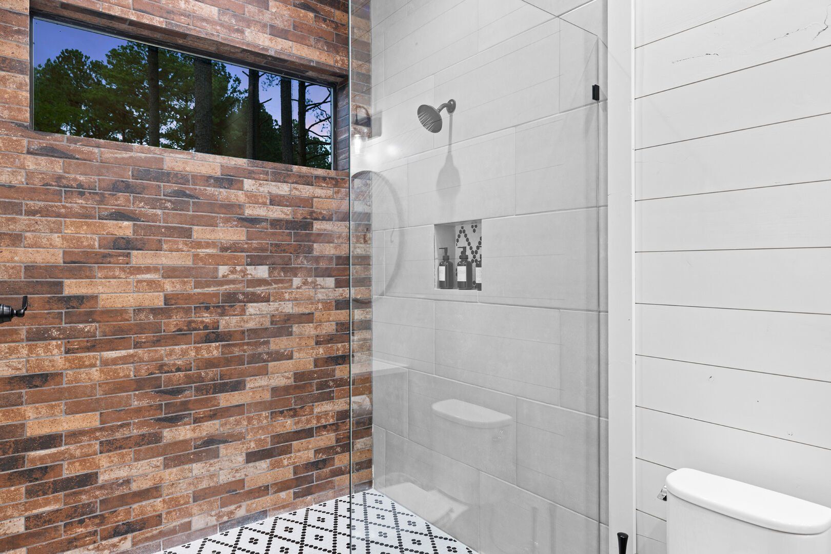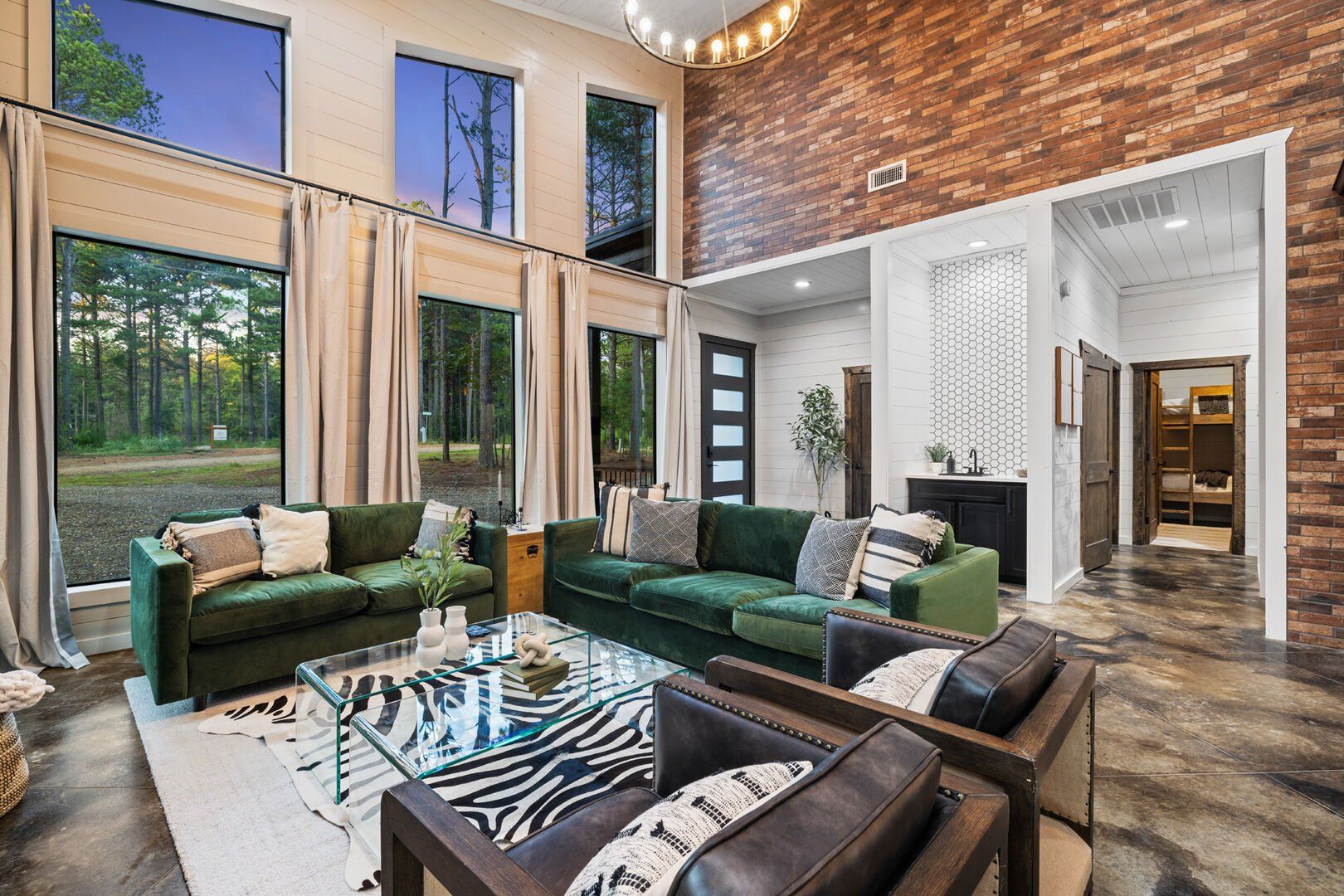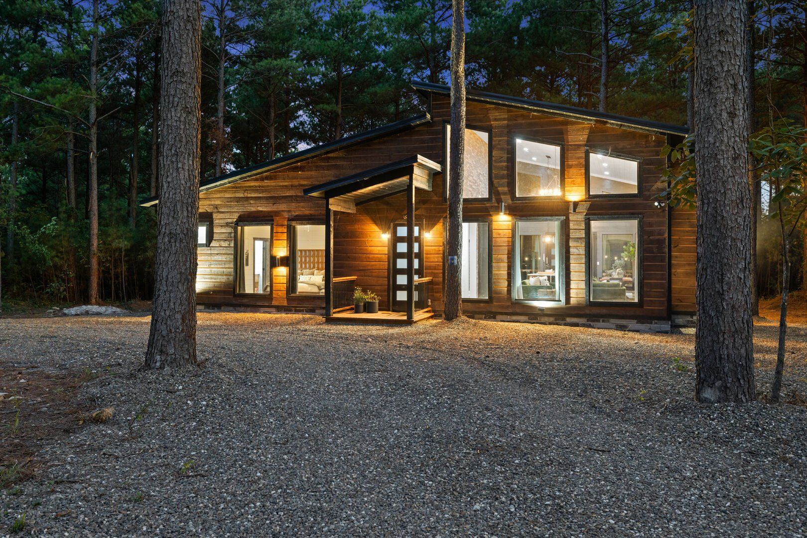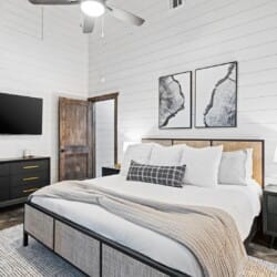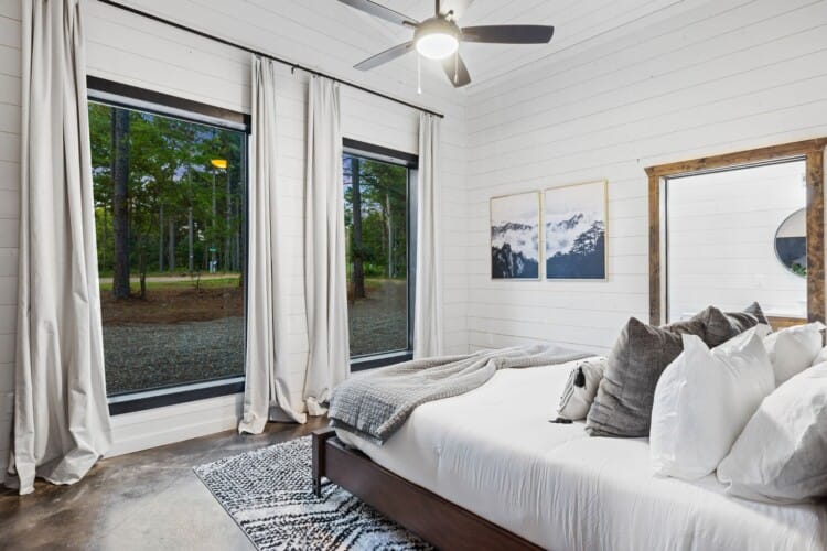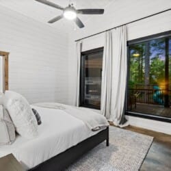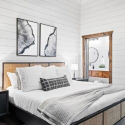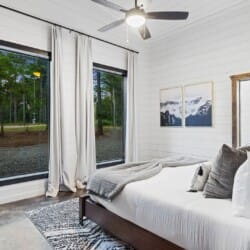 Coopers Corner features two beautifully designed king bedrooms, each offering cozy bedding, warm lighting, and views of the outdoors. The large windows let in soft, natural light during the day, and the peaceful woods outside provide a calming backdrop to every morning and night. Both bedrooms feature private bathrooms with spacious walk-in showers and dual sinks, providing a quiet space to freshen up or unwind after a long day of adventure. With thoughtful touches throughout, each room at Coopers Corner feels like a private retreat.