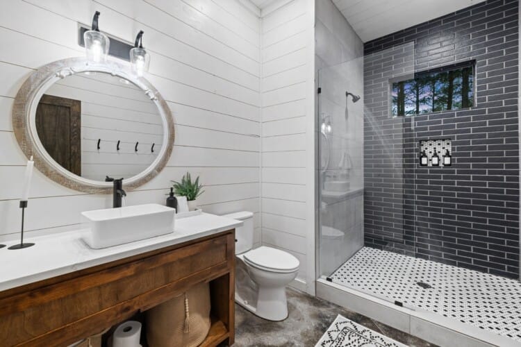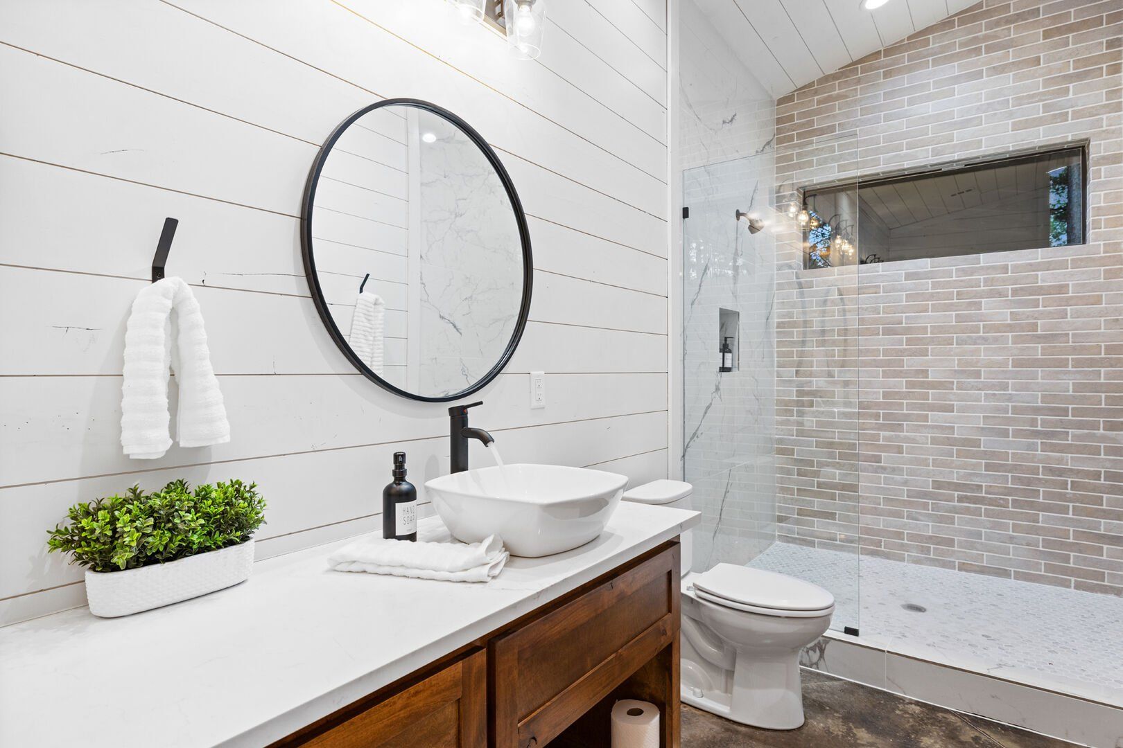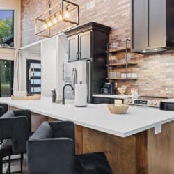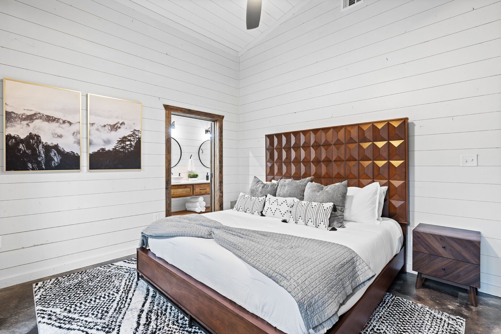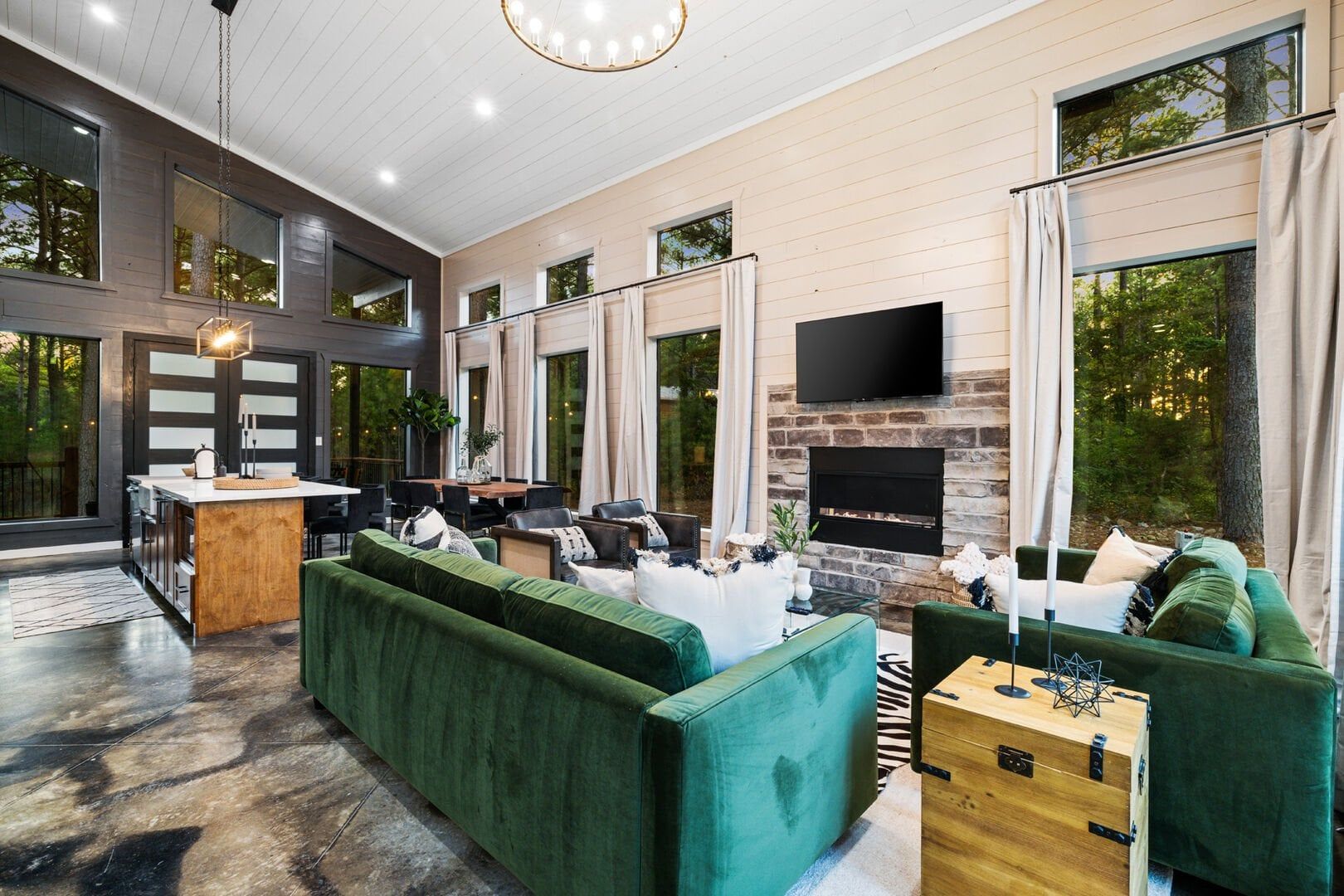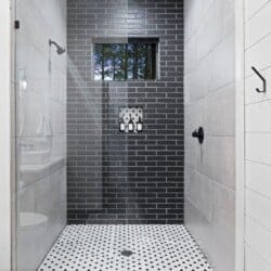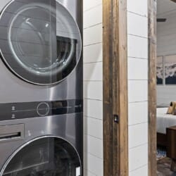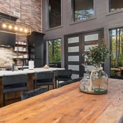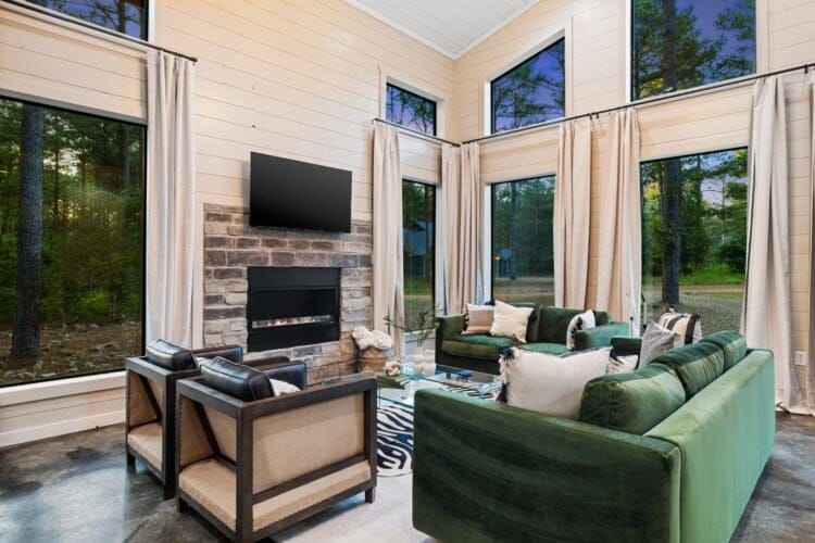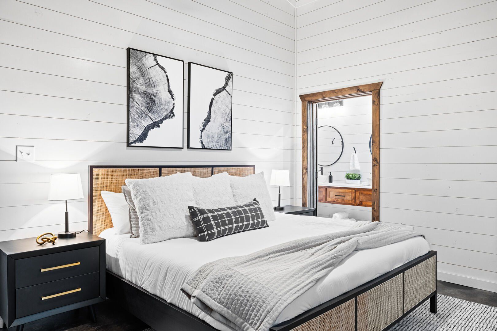Coopers Corner features two beautifully designed king bedrooms, each offering cozy bedding, warm lighting, and views of the outdoors. The large windows let in soft, natural light during the day, and the peaceful woods outside provide a calming backdrop to every morning and night. Both bedrooms feature private bathrooms with spacious walk-in showers and dual sinks, providing a quiet space to freshen up or unwind after a long day of adventure. With thoughtful touches throughout, each room at Coopers Corner feels like a private retreat.