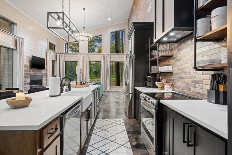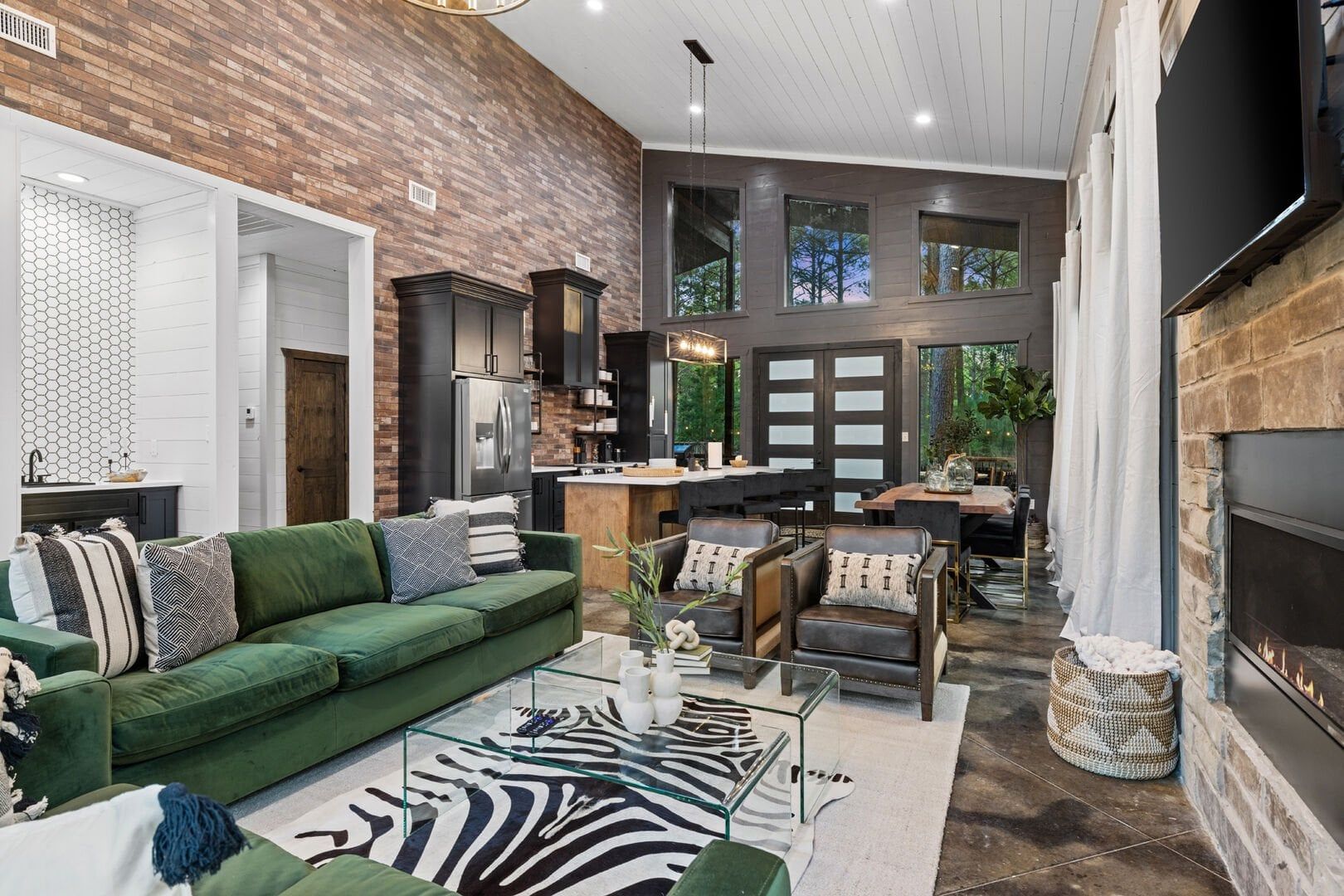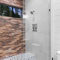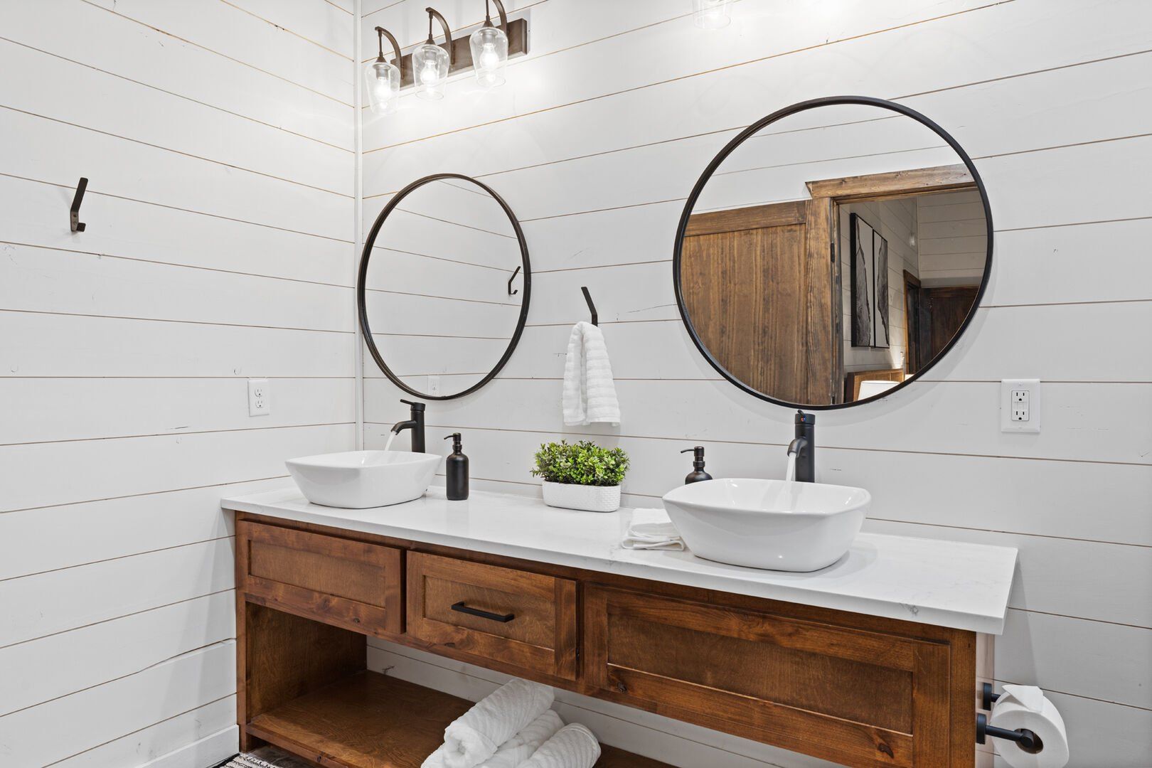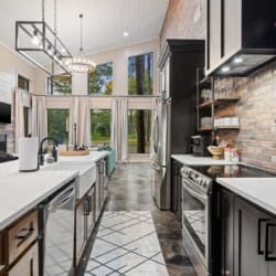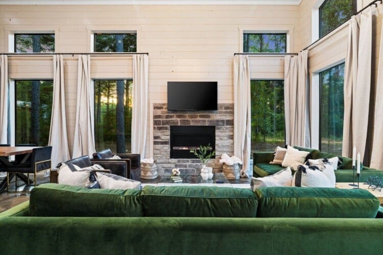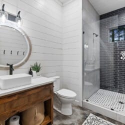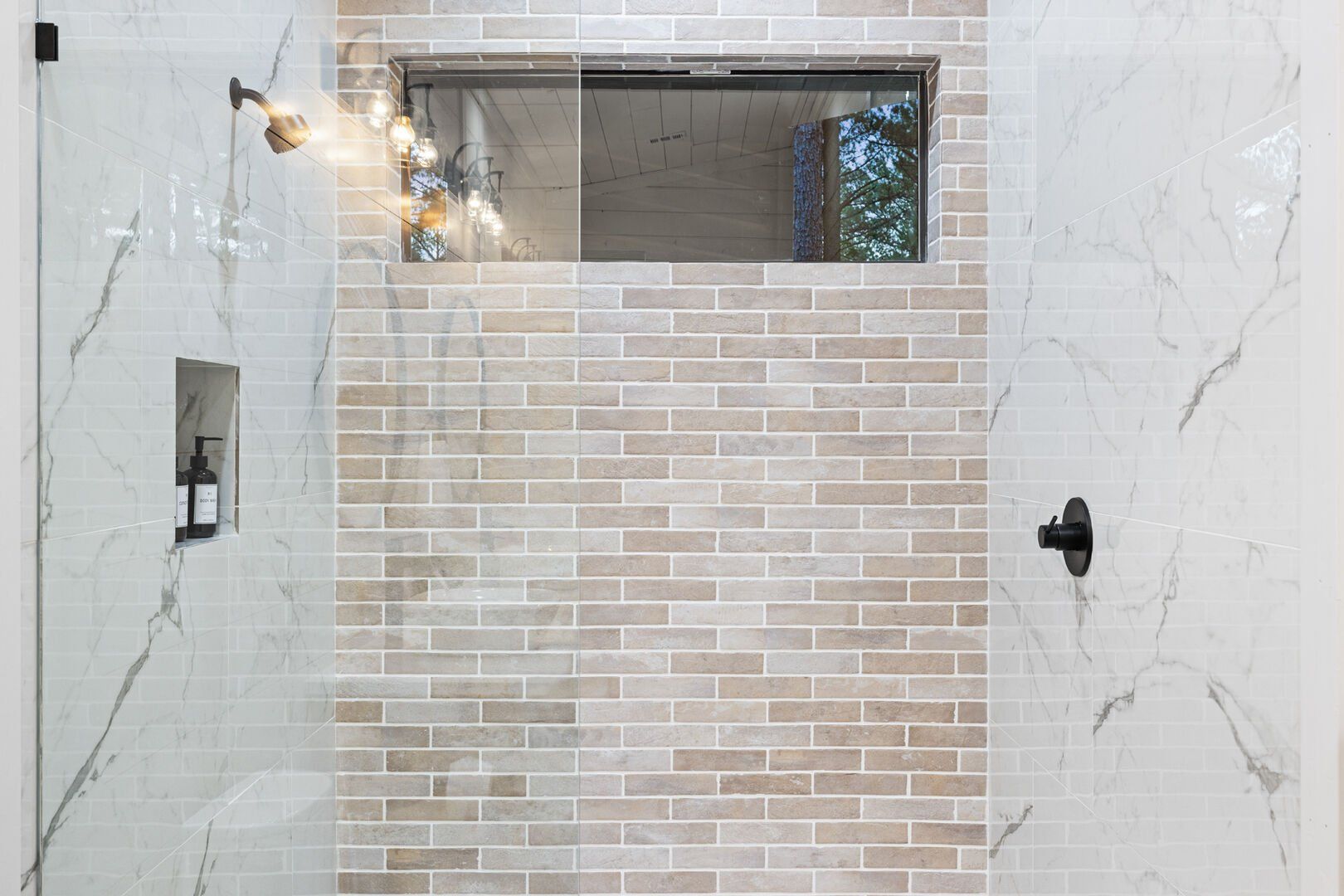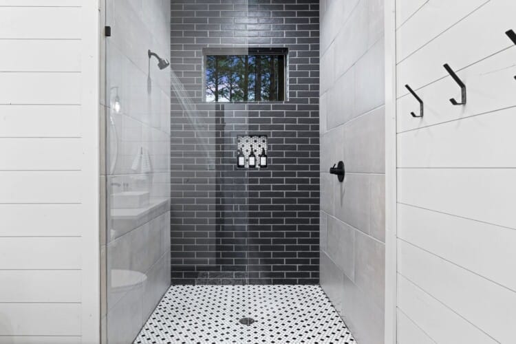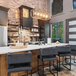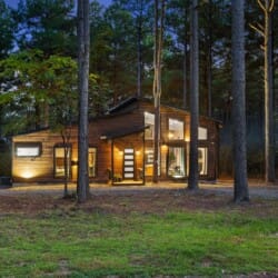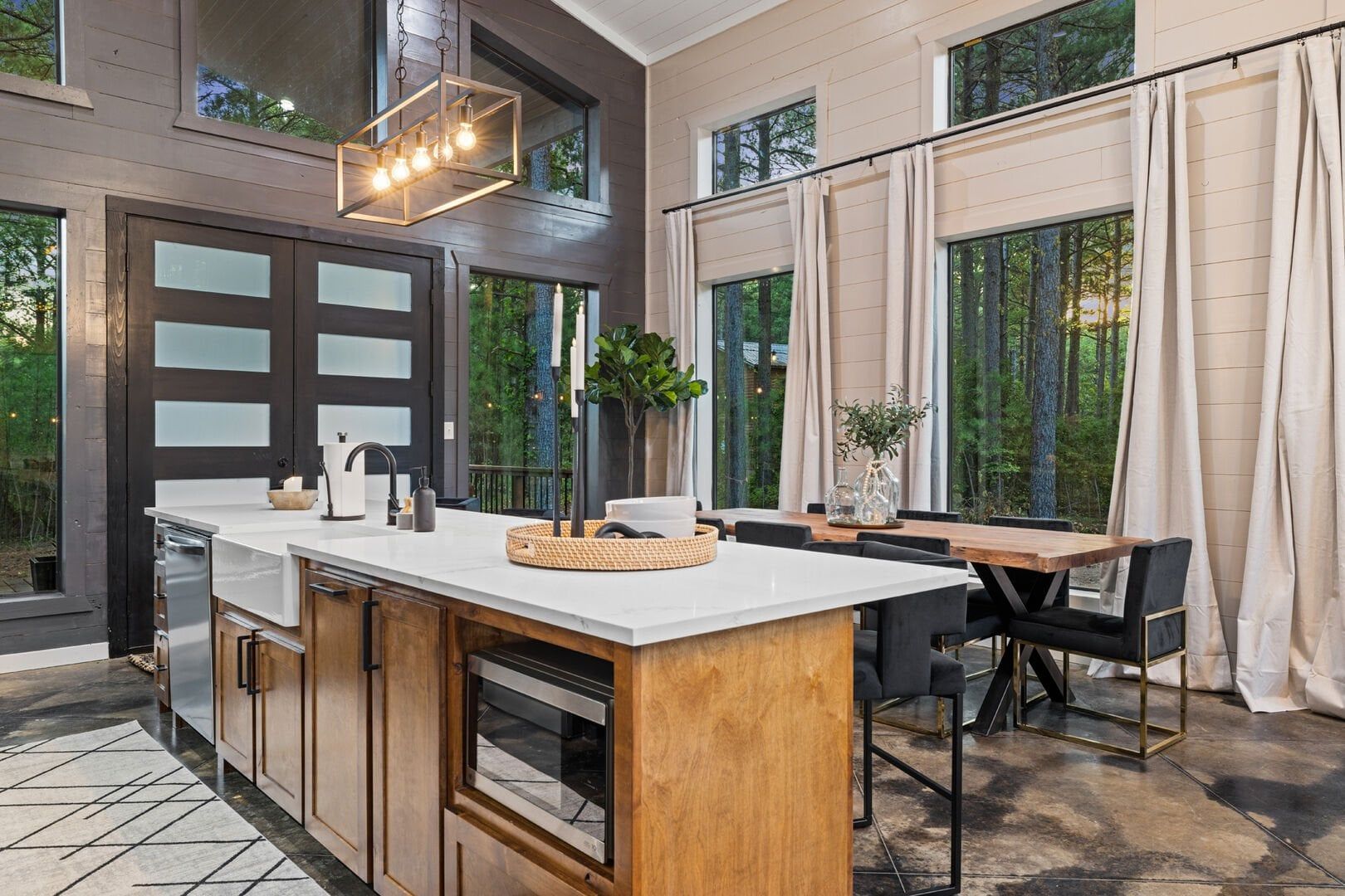 Coopers Corner features two beautifully designed king bedrooms, each offering cozy bedding, warm lighting, and views of the outdoors. The large windows let in soft, natural light during the day, and the peaceful woods outside provide a calming backdrop to every morning and night. Both bedrooms feature private bathrooms with spacious walk-in showers and dual sinks, providing a quiet space to freshen up or unwind after a long day of adventure. With thoughtful touches throughout, each room at Coopers Corner feels like a private retreat.