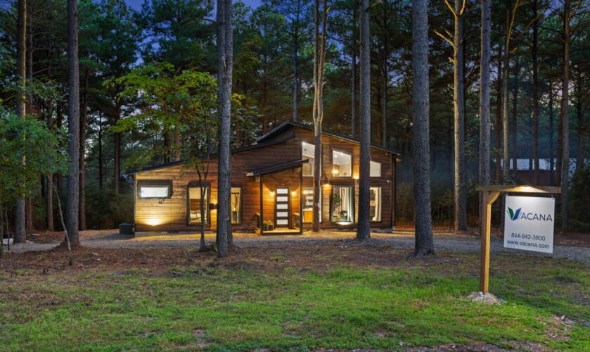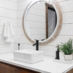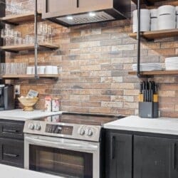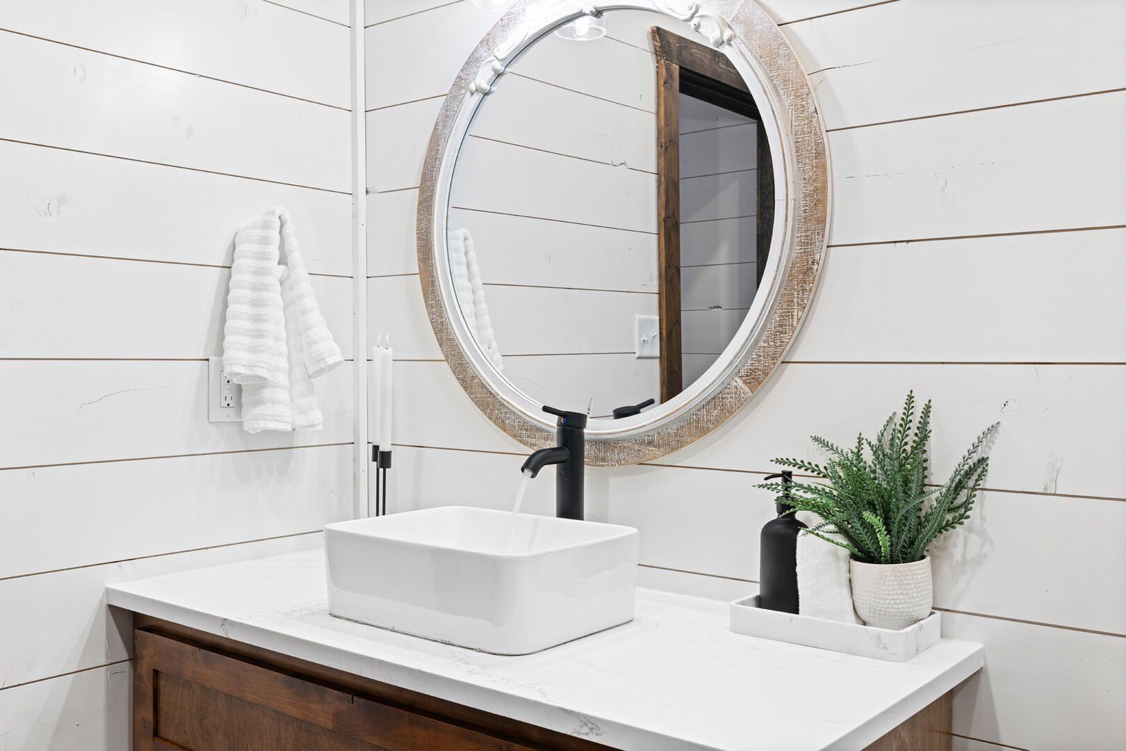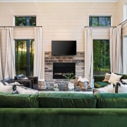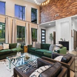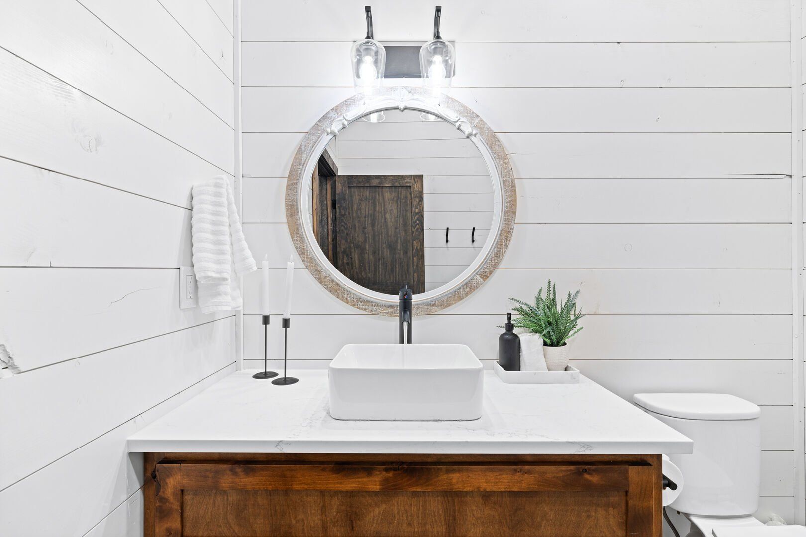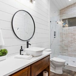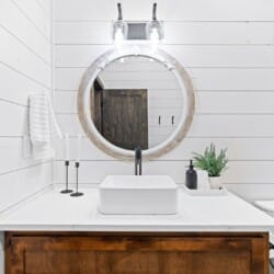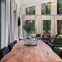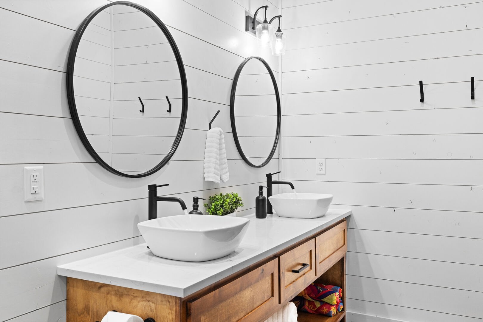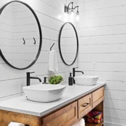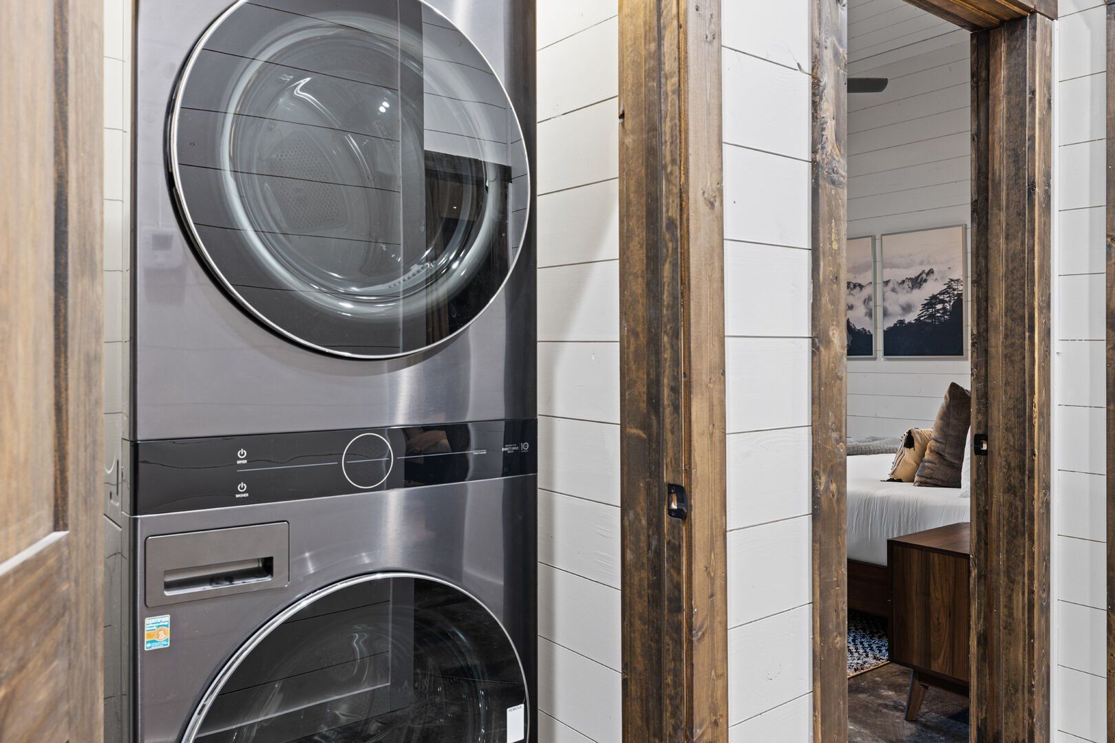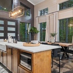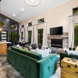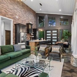 Coopers Corner features two beautifully designed king bedrooms, each offering cozy bedding, warm lighting, and views of the outdoors. The large windows let in soft, natural light during the day, and the peaceful woods outside provide a calming backdrop to every morning and night. Both bedrooms feature private bathrooms with spacious walk-in showers and dual sinks, providing a quiet space to freshen up or unwind after a long day of adventure. With thoughtful touches throughout, each room at Coopers Corner feels like a private retreat.