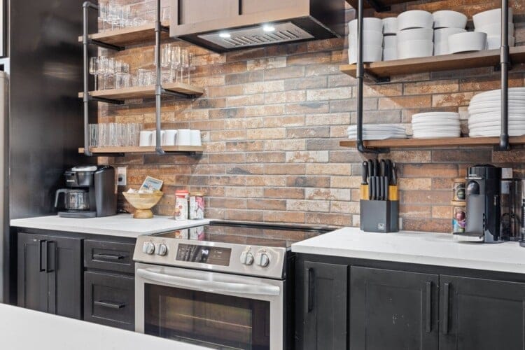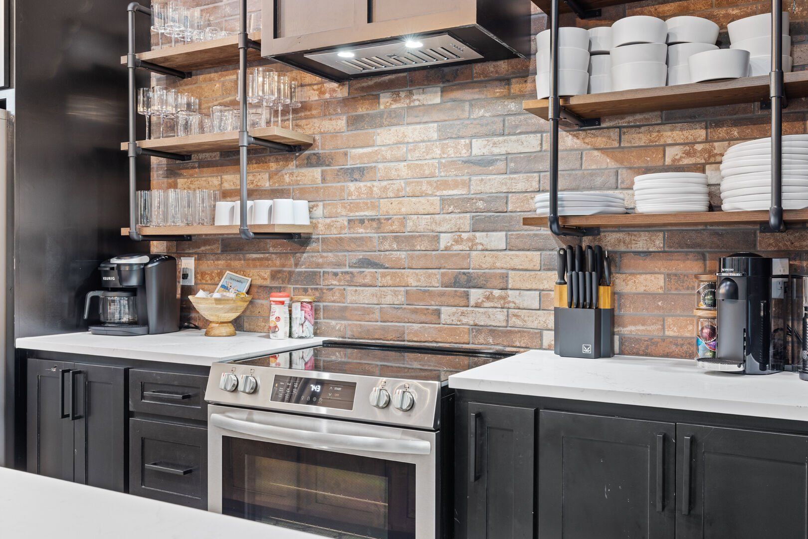 The kitchen at Coopers Corner is fully equipped and ready for anything from quick snacks to full meals. Its wood cabinets, stone countertops, and shiny modern appliances make it both attractive and functional. Whether guests are cooking a family dinner or brewing coffee to enjoy on the deck, the kitchen has everything needed.