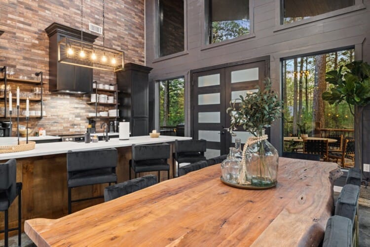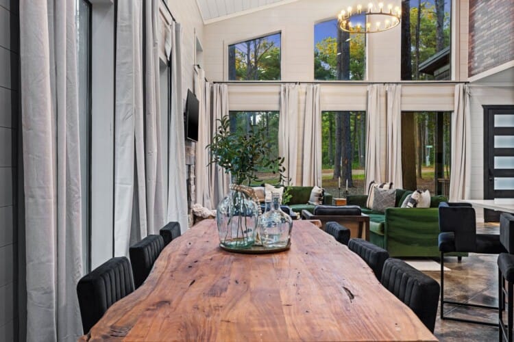 The living room at Coopers Corner is a favorite gathering space thanks to its open layout, gas fireplace, and cozy furniture. Guests can unwind on the couch, enjoy a movie or a book, and be surrounded by wooden accents, taking in views of the forest. The large windows frame the natural beauty outside, reminding guests that they’ve escaped the hustle and bustle of everyday life.