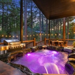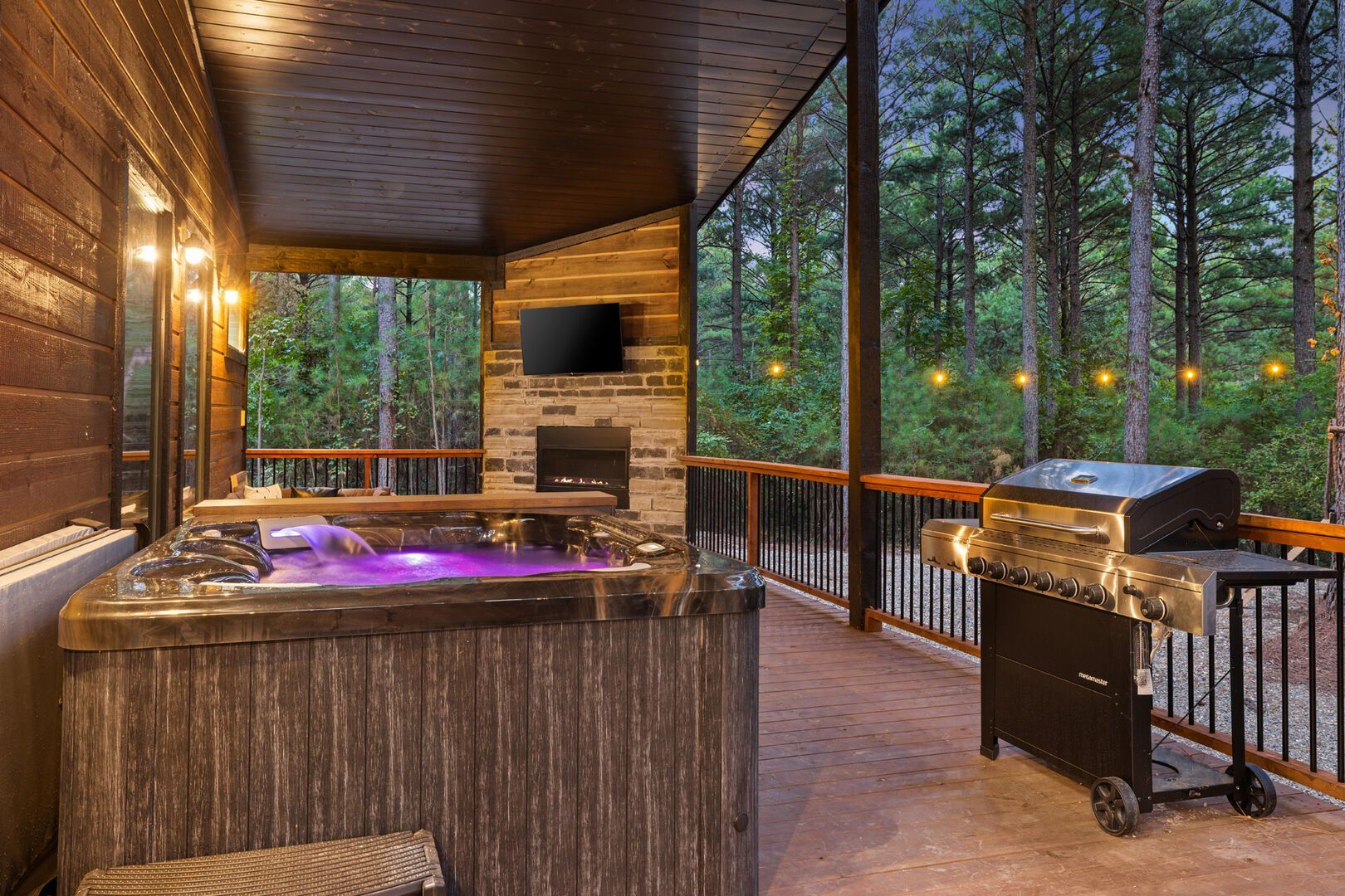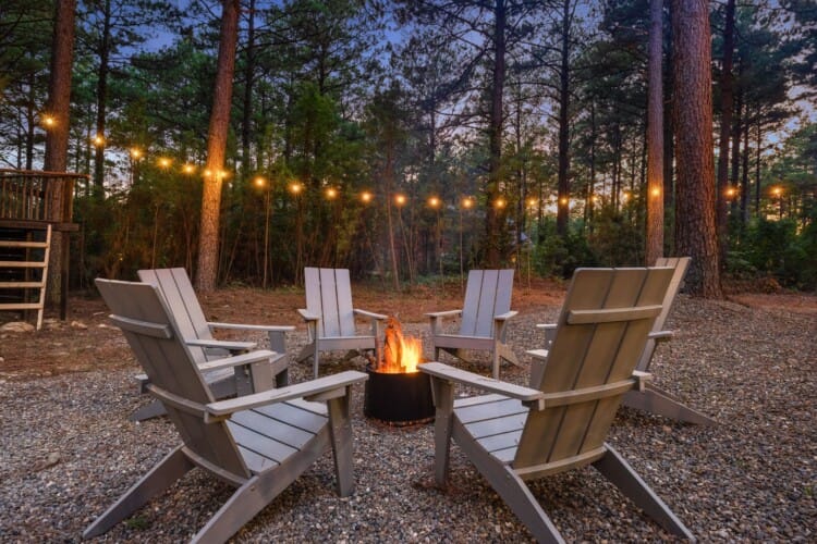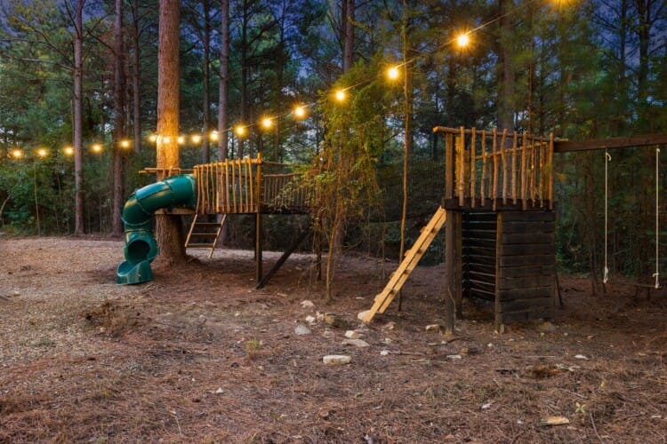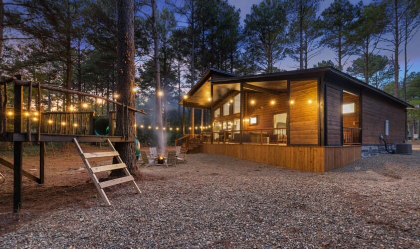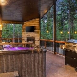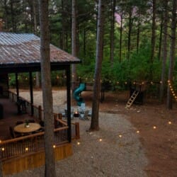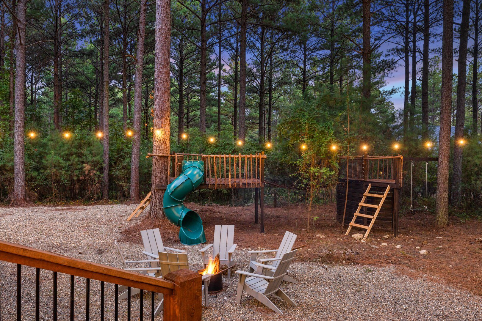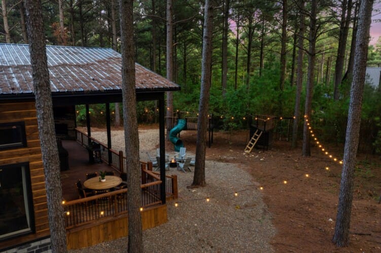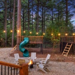 Coopers Corner shines in its outdoor areas. The back deck stretches across the cabin, offering space to eat, lounge, and take in the view. The gazebo-covered hot tub provides guests with the opportunity to unwind while surrounded by nature. A fire pit nearby, complete with string lights and comfortable seating, becomes the perfect spot for roasting marshmallows and enjoying quiet nights under the stars. Kids love the outdoor playset, which features swings and climbing elements, all positioned safely within view of the fire pit area. The overall setup encourages families to spend more time together outside.