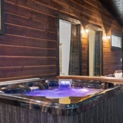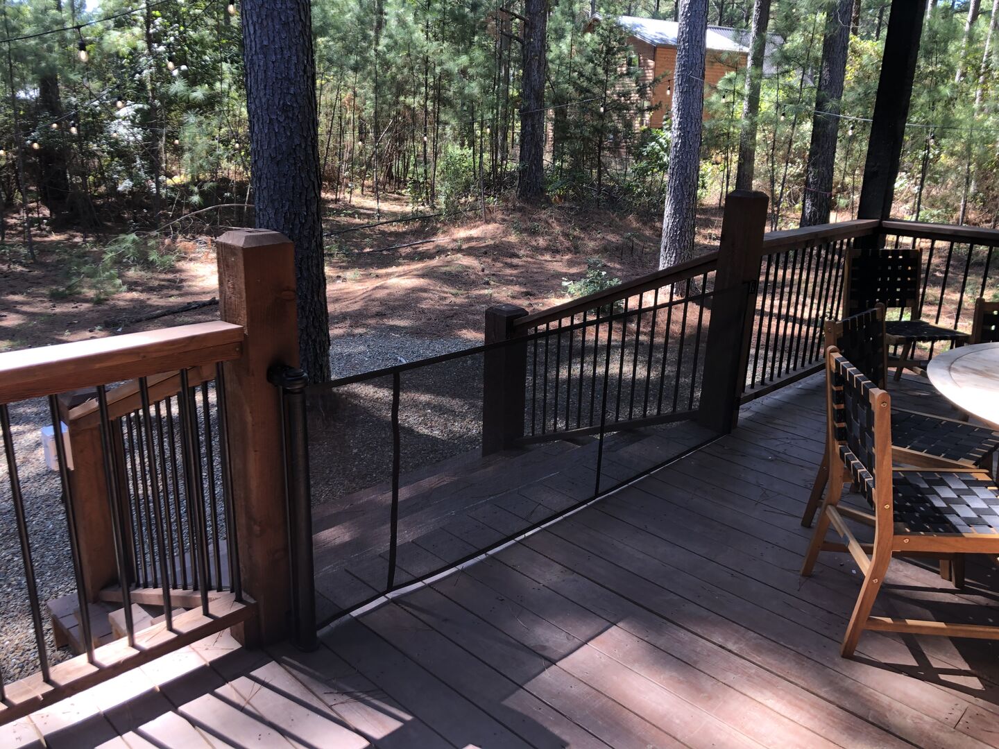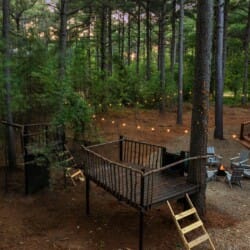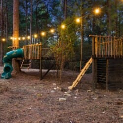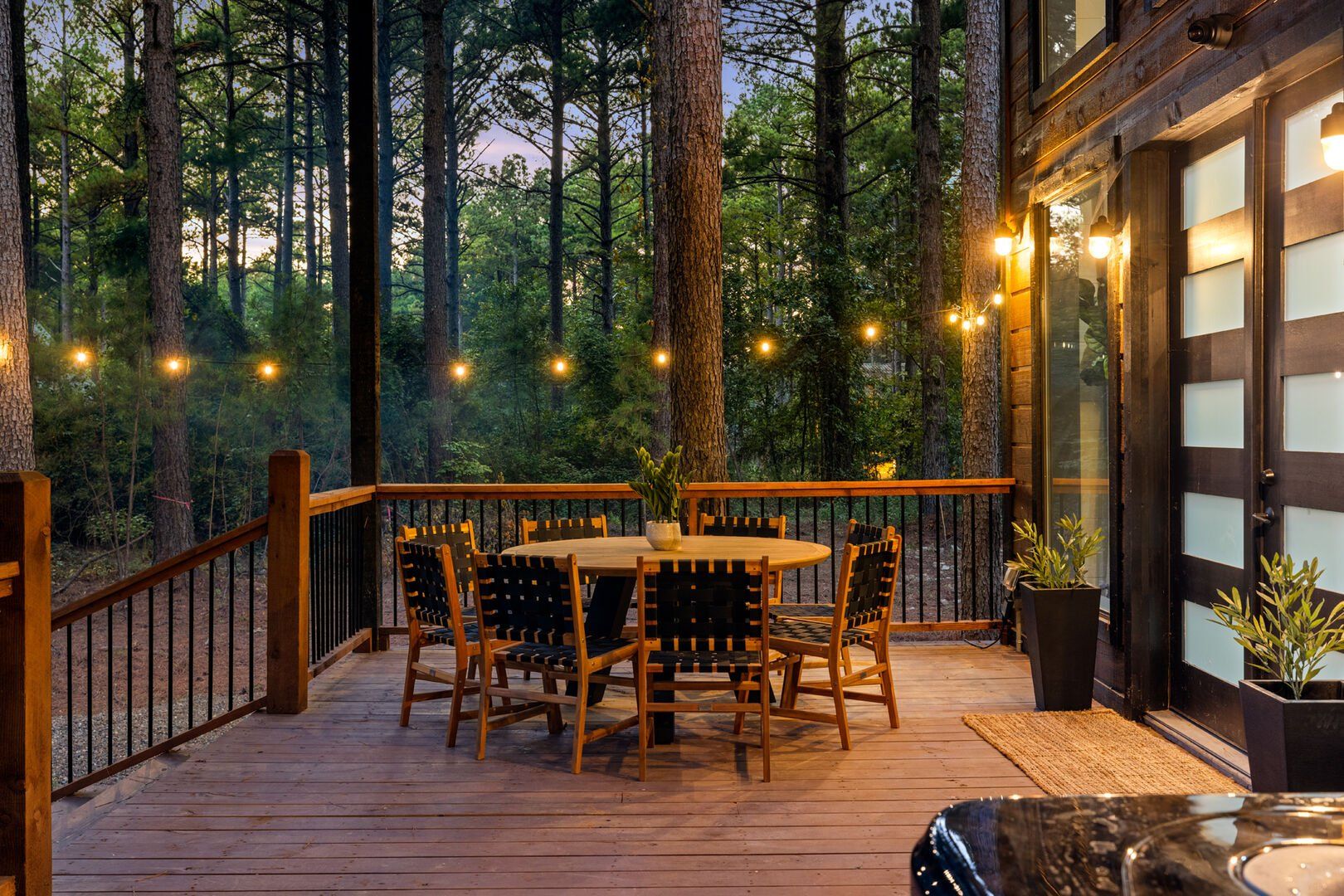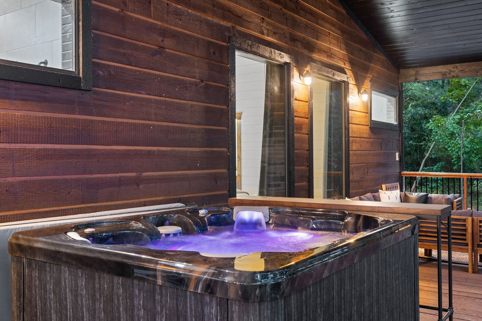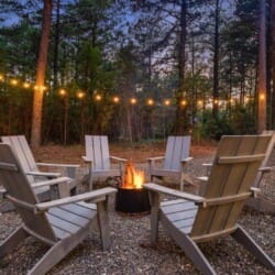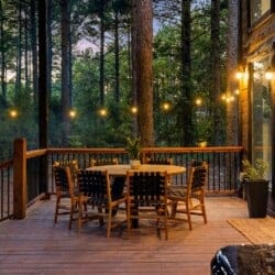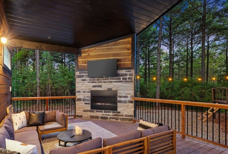 Coopers Corner shines in its outdoor areas. The back deck stretches across the cabin, offering space to eat, lounge, and take in the view. The gazebo-covered hot tub provides guests with the opportunity to unwind while surrounded by nature. A fire pit nearby, complete with string lights and comfortable seating, becomes the perfect spot for roasting marshmallows and enjoying quiet nights under the stars. Kids love the outdoor playset, which features swings and climbing elements, all positioned safely within view of the fire pit area. The overall setup encourages families to spend more time together outside.