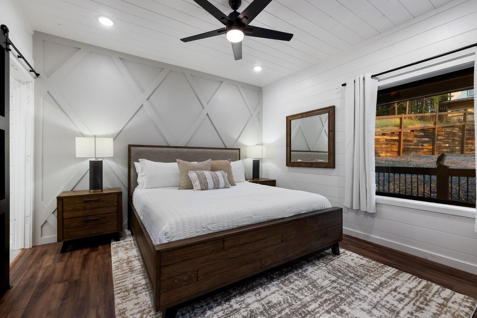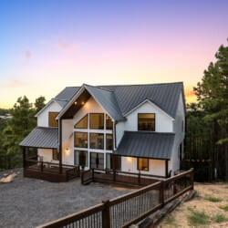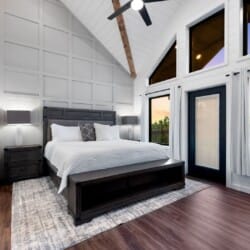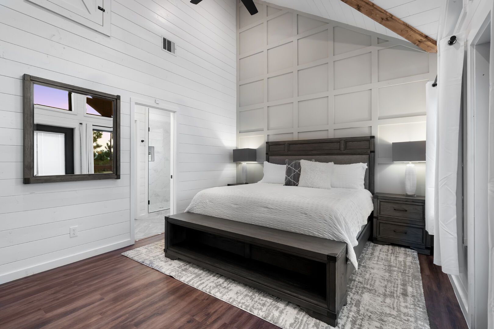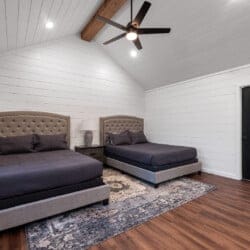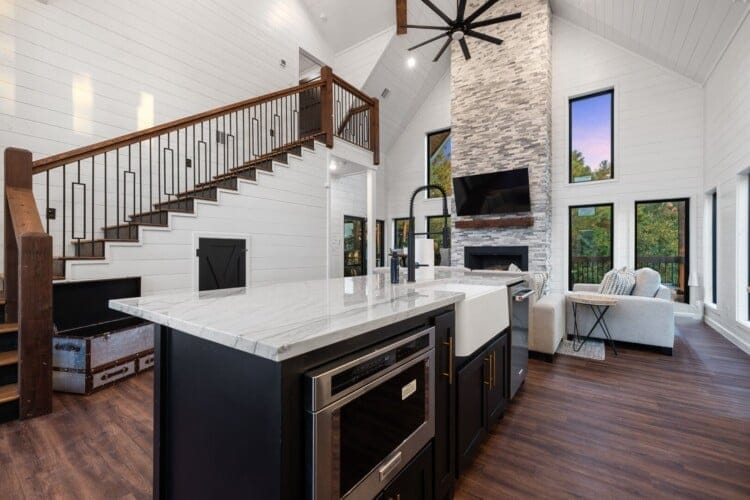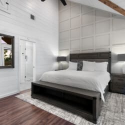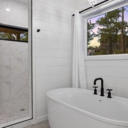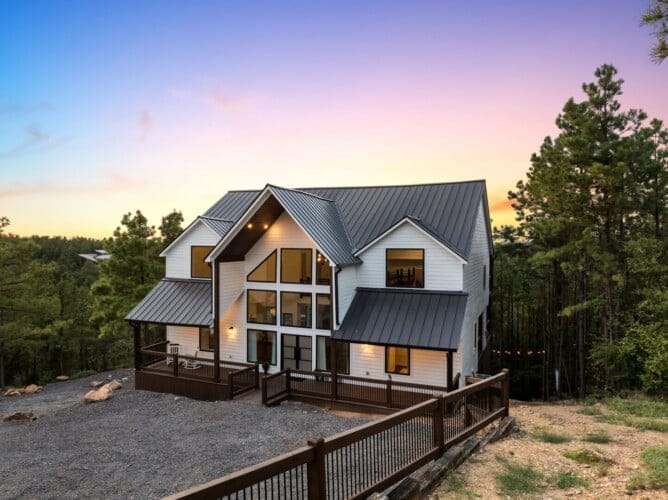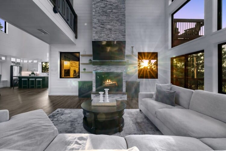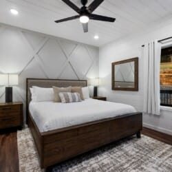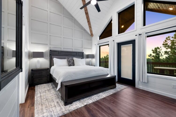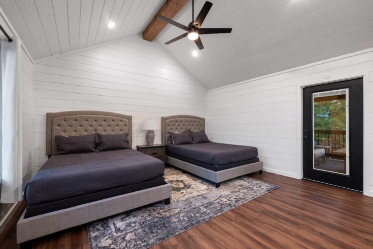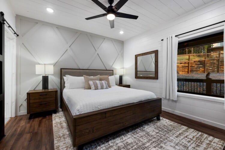 Cozy & Lazy Bear Retreat also includes a Cozy Bear Cabin steps across the way. Cozy Bear offers a luxurious king suite downstairs and a spacious upstairs bedroom with two queen beds, perfect for another family or group of friends. Each bedroom has its full bathroom, and the master bathroom features a soaking tub in addition to a walk-in shower. The living room and kitchen at Cozy Bear share the same bright, open style as Lazy Bear, featuring high ceilings and large windows that let in ample natural light. Whether you’re relaxing in front of the indoor fireplace or sharing stories on the covered deck, every corner of Cozy Bear is built for comfort.