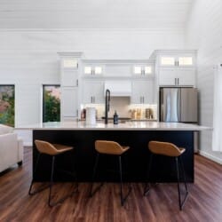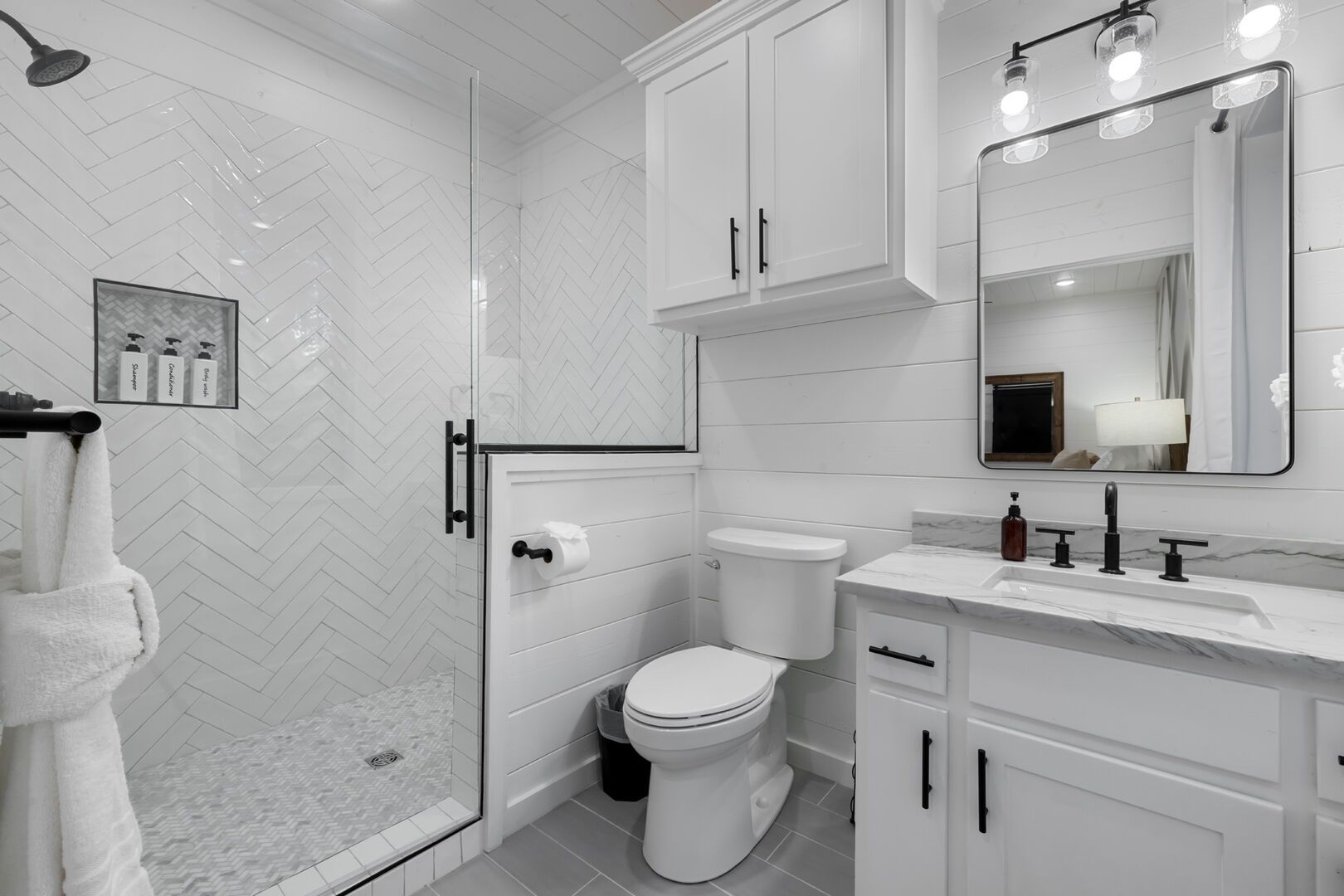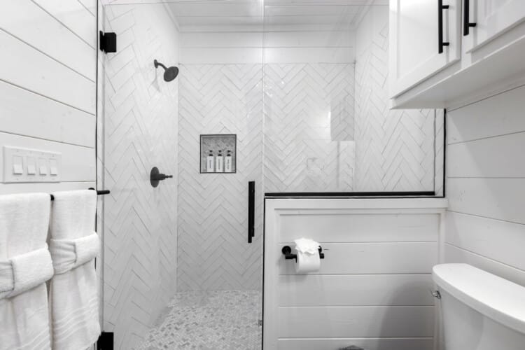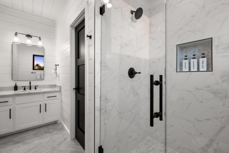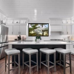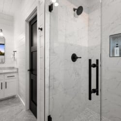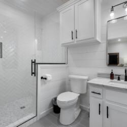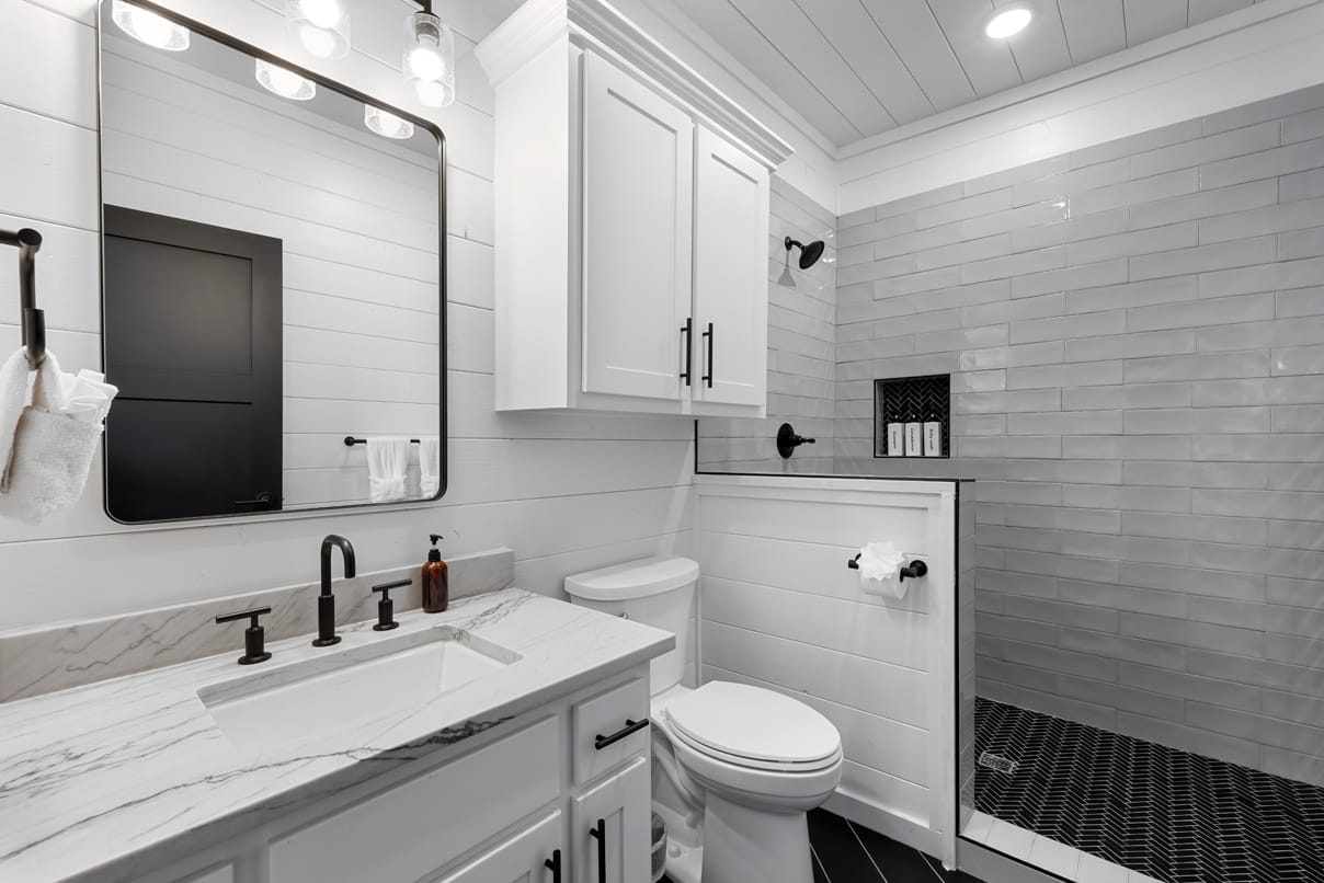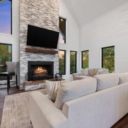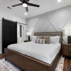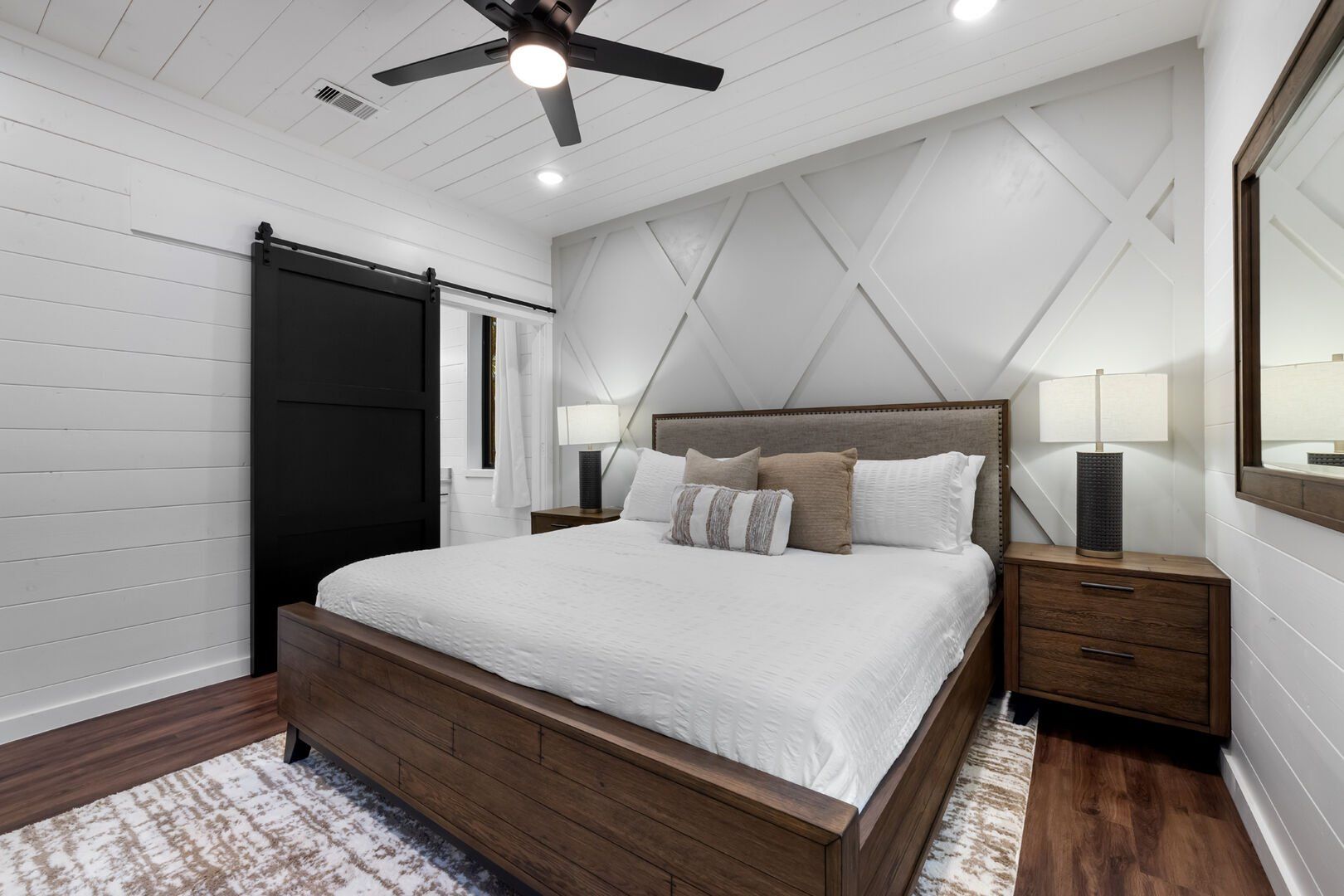 Cozy & Lazy Bear Retreat also includes a Cozy Bear Cabin steps across the way. Cozy Bear offers a luxurious king suite downstairs and a spacious upstairs bedroom with two queen beds, perfect for another family or group of friends. Each bedroom has its full bathroom, and the master bathroom features a soaking tub in addition to a walk-in shower. The living room and kitchen at Cozy Bear share the same bright, open style as Lazy Bear, featuring high ceilings and large windows that let in ample natural light. Whether you’re relaxing in front of the indoor fireplace or sharing stories on the covered deck, every corner of Cozy Bear is built for comfort.