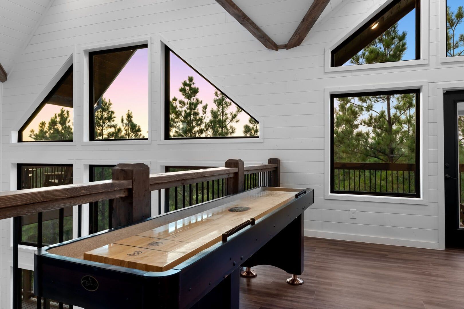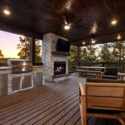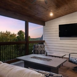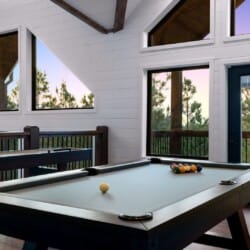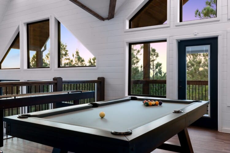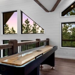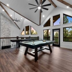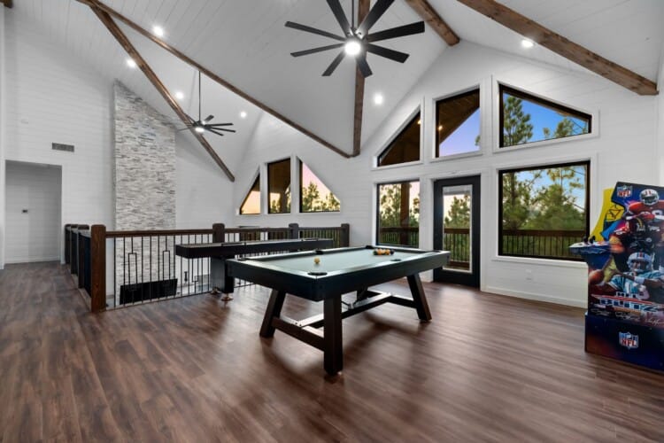 Cozy & Lazy Bear Retreat combines comfort and fun in equal measure. At Lazy Bear, you’ll find two spacious king bedrooms, each with its private bathroom, as well as a large bunk room upstairs that sleeps six. The bunk room also features a bathroom, ensuring everyone has ample space and privacy. Upstairs, the game room is packed with entertainment for all ages, including a pool table, shuffleboard, and arcade games. It’s the kind of setup where kids and adults can both unwind and make memories without needing to leave the cabin. The open kitchen is fully equipped and ideal for preparing meals together, featuring a spacious dining area inside and an additional outdoor dining area on the large deck.