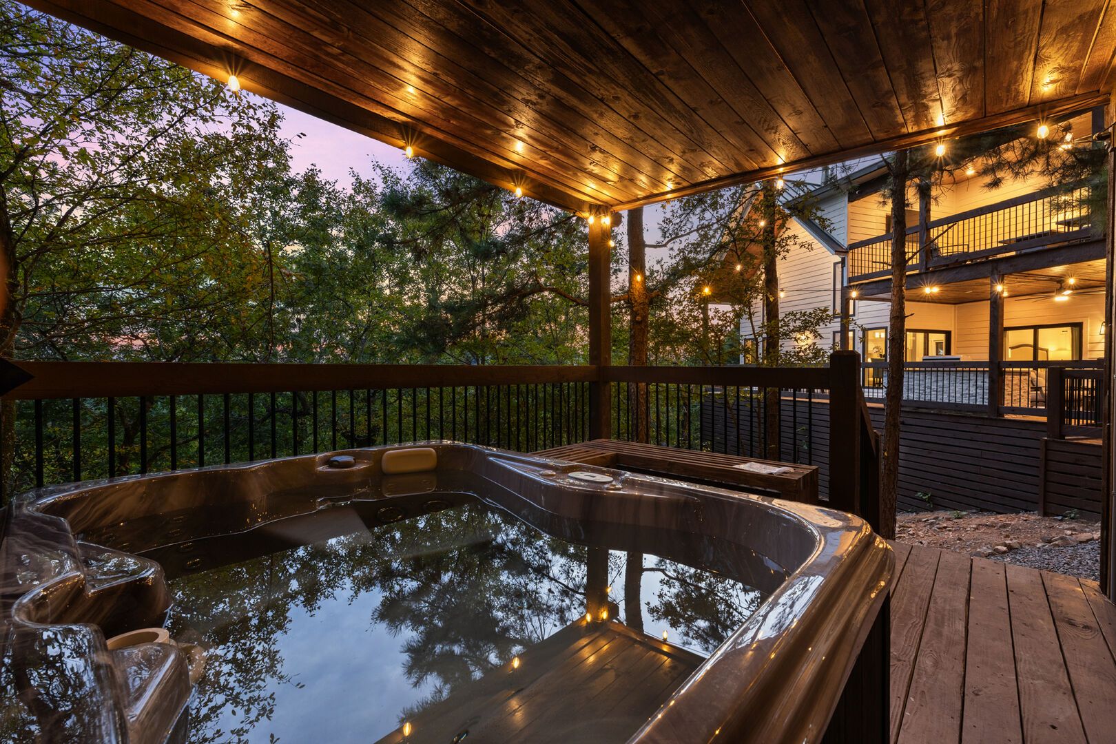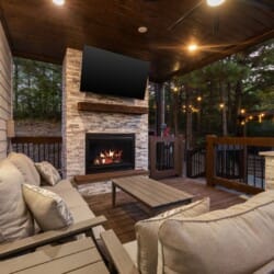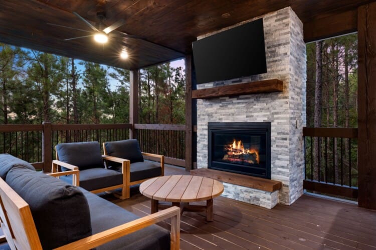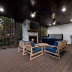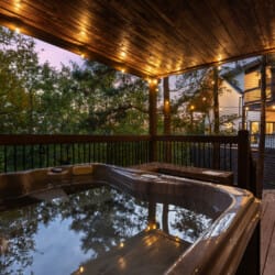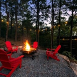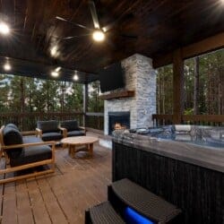 Cozy & Lazy Bear Retreat makes the most of its outdoor spaces. Both cabins have their gazebo-style hot tubs, perfect for relaxing under the stars after a day spent hiking or sightseeing. The fire pits are set up beneath string lights and surrounded by seating, creating the ideal setting for roasting marshmallows and chatting late into the night. Whether it’s game night indoors or a glass of wine out on the porch, these cabins were designed to help guests slow down and reconnect with each other.