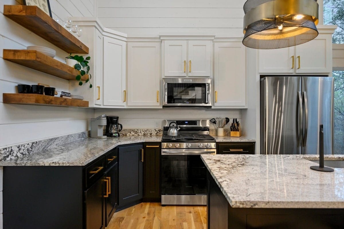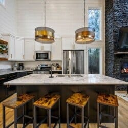 The fully stocked kitchen of Ctrl Alt Del has everything needed to prepare and enjoy meals together. Guests will find a gas stovetop, oven, toaster, blender, cookware, drip coffee pot, and Keurig for their morning brew. The kitchen island has seating for four, and the nearby dining table seats four more, creating a perfect spot to share meals and conversation.