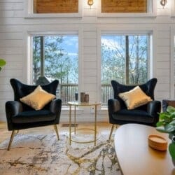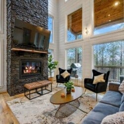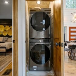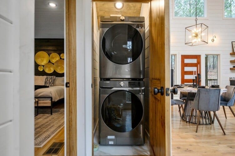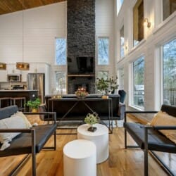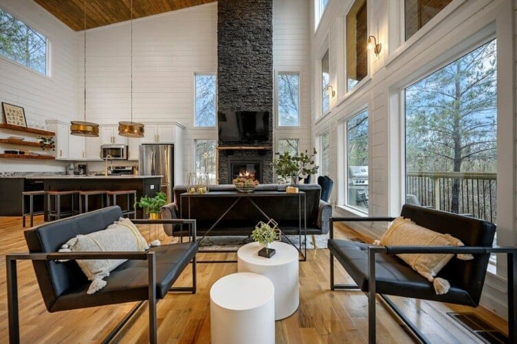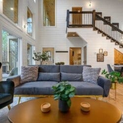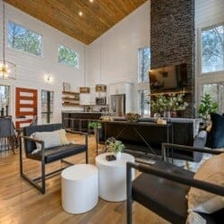 As guests step inside, they are welcomed by an open living space filled with warm light and cozy details. The living room includes a gas fireplace, a large sofa, and two armchairs. There is also an extra seating area with oversized chairs and a Smart HDTV for movie nights or quiet afternoons. The nearby laundry closet adds extra convenience for longer stays.