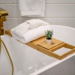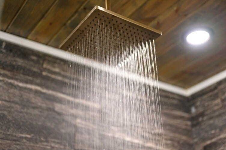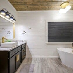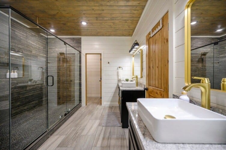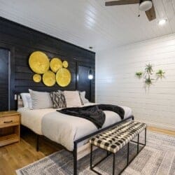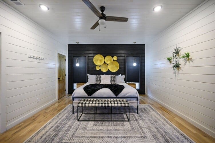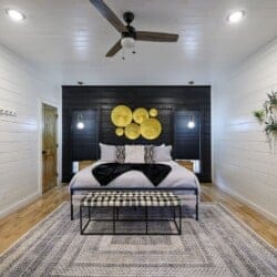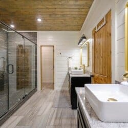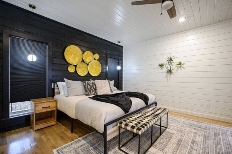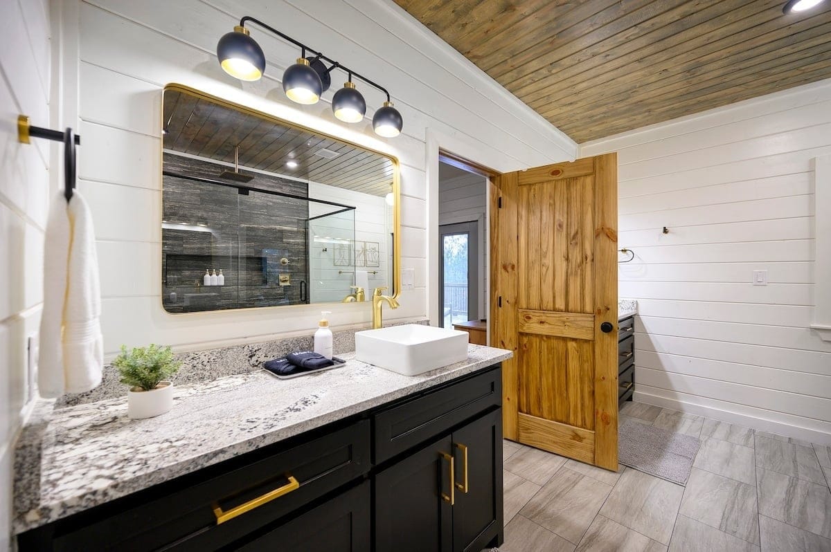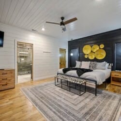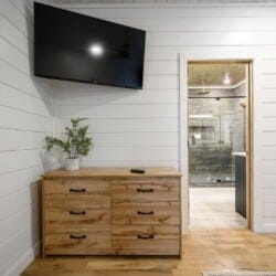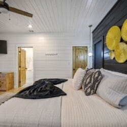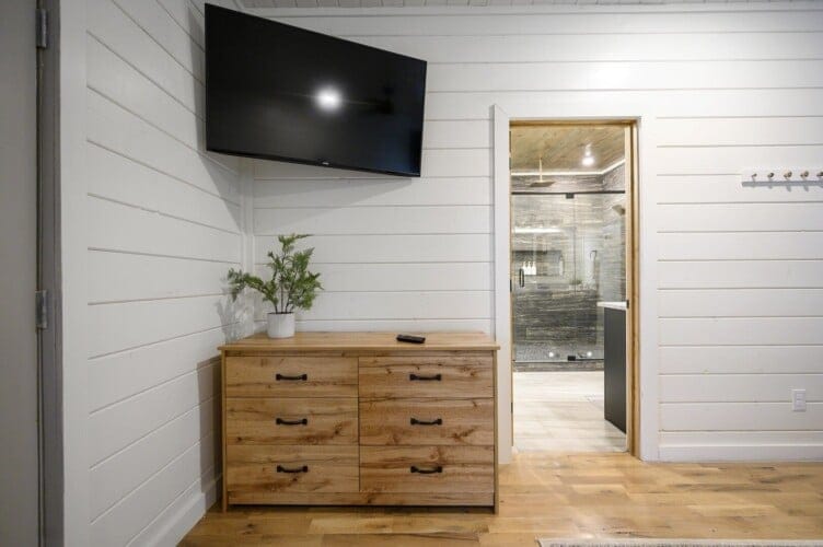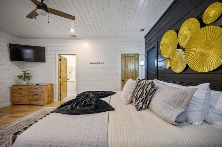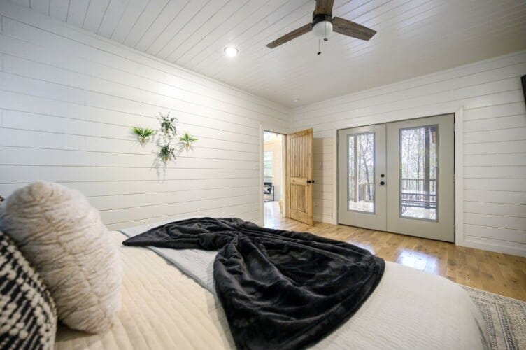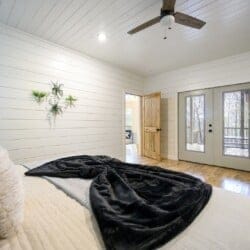 The downstairs master suite of Ctrl Alt Del offers peaceful rest with a plush king-sized bed, Smart HDTV, and stylish furniture, including nightstands and a bench. The en suite bathroom has a double vanity, soaking tub, and a rainfall shower. French doors lead from the bedroom to the lower deck, offering a peaceful spot for morning coffee or evening breezes.
