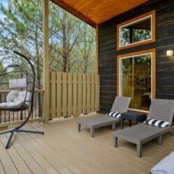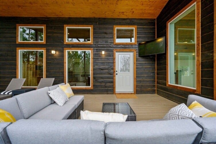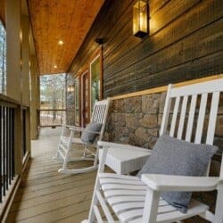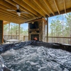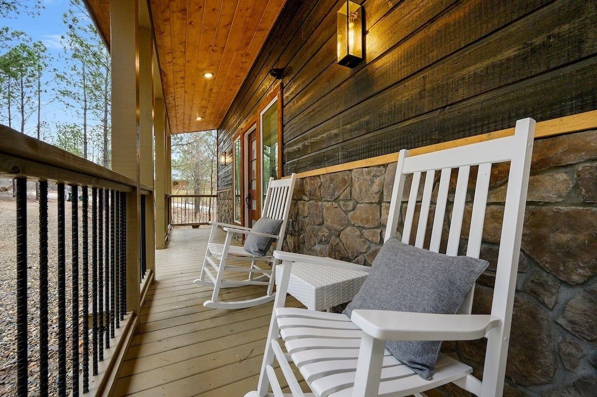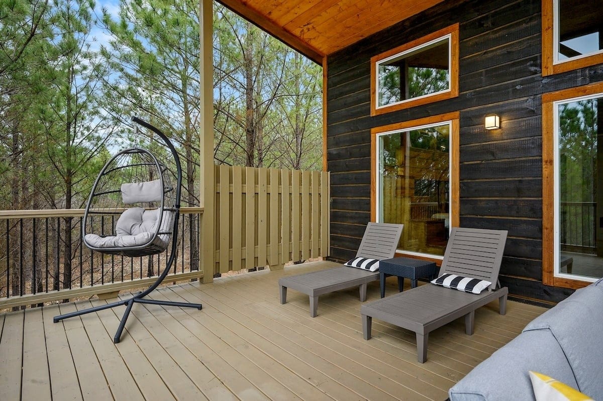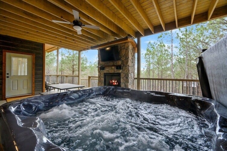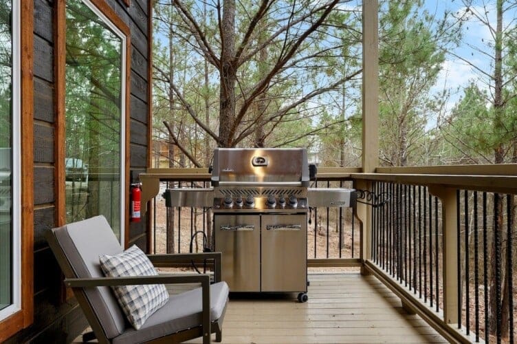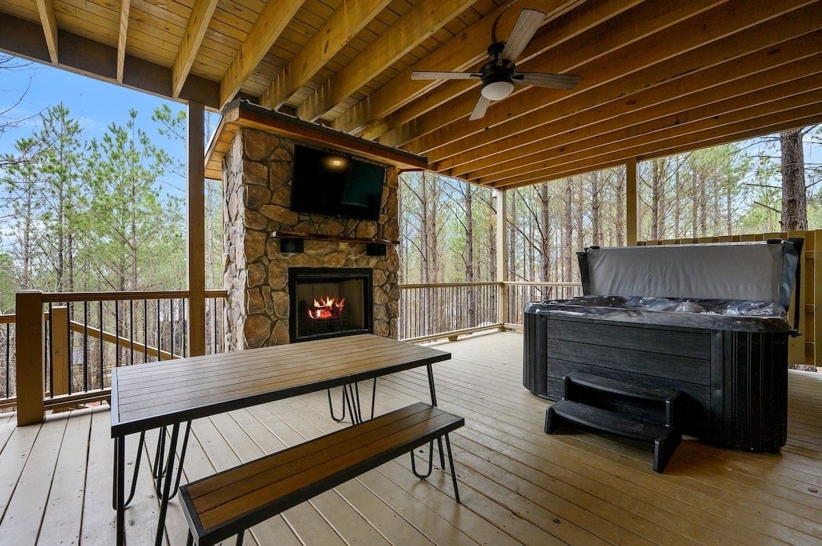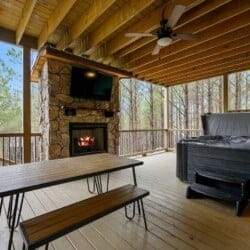 Outside, the Ctrl Alt Del cabin continues to impress. The front porch has classic rocking chairs, perfect for enjoying a slow morning or sunset. The lower back deck includes a cozy seating area around a seasonal gas fireplace, a Smart HDTV, a large dining table, a gas grill, and a hot tub. The upper back deck features lounge seating and another Smart HDTV, giving guests more space to spread out and enjoy the forest views. Down a short path, the fire pit seating for six is the perfect place to gather under the stars and roast marshmallows.
