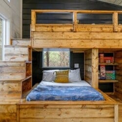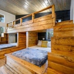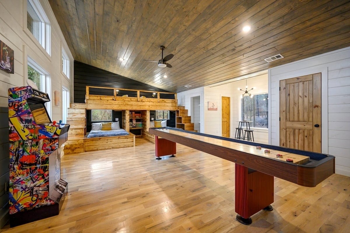 Upstairs, guests will find a large bunk and game room designed with fun in mind. The space includes two sets of twin-over-full bunk beds, a shuffleboard table, a retro arcade game, a bar-height table, and a built-in desk. It also features a Smart HDTV and an en suite bathroom with a walk-in shower.