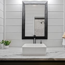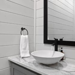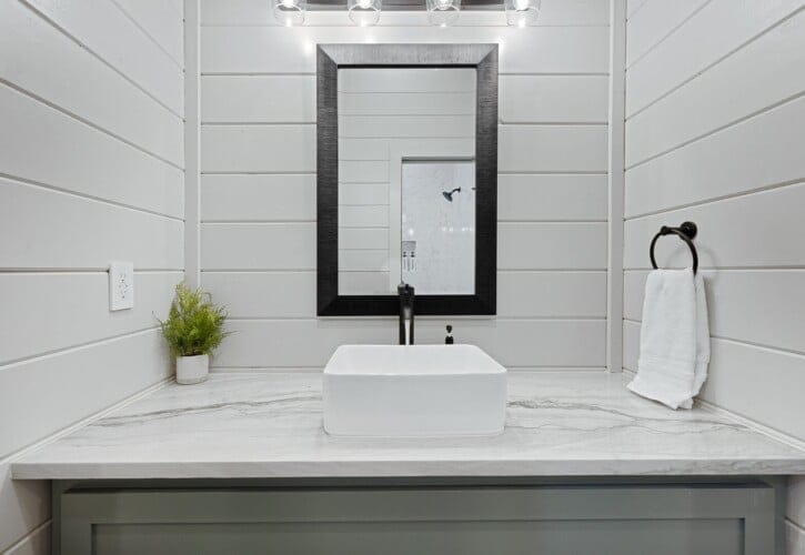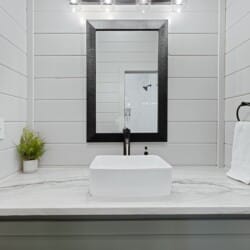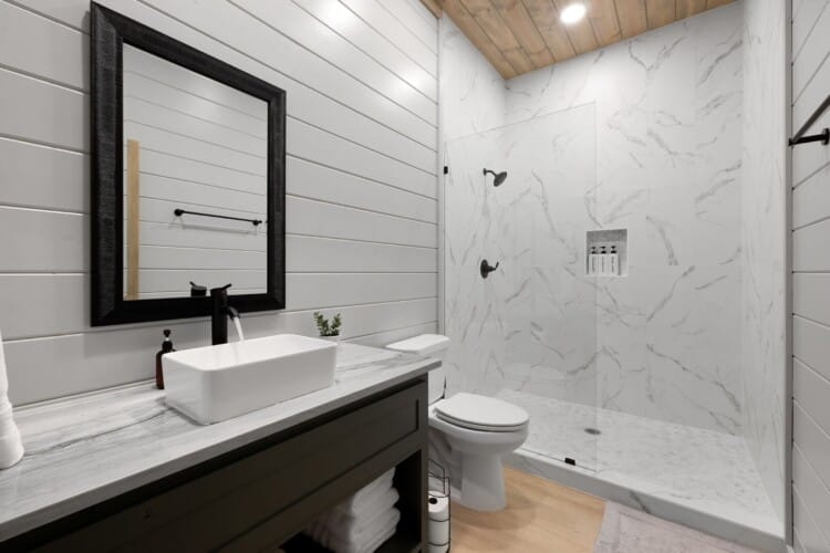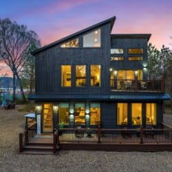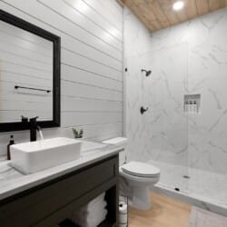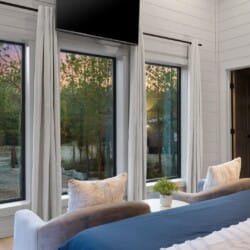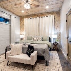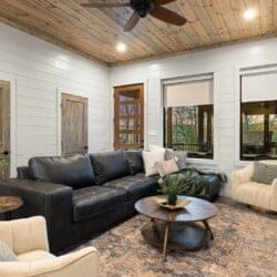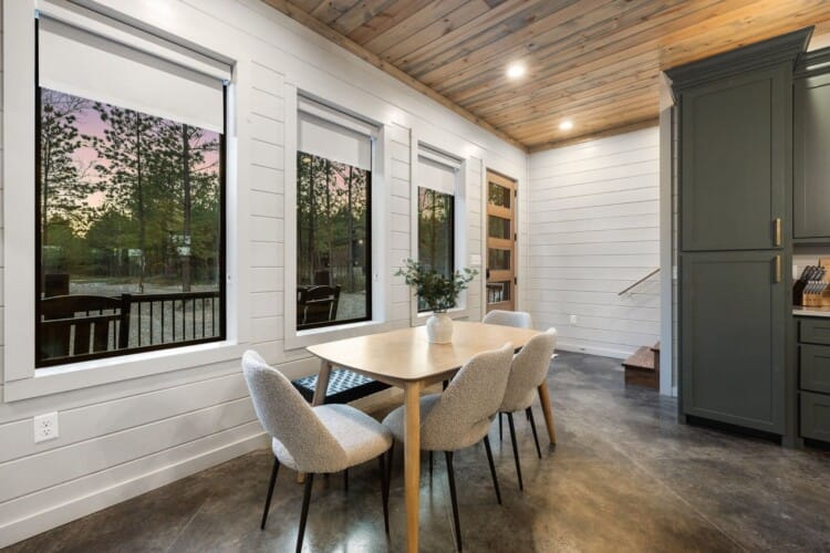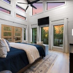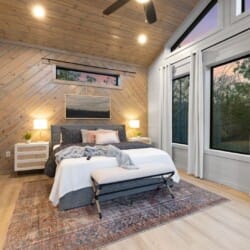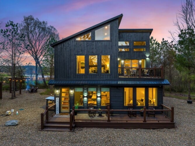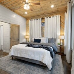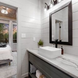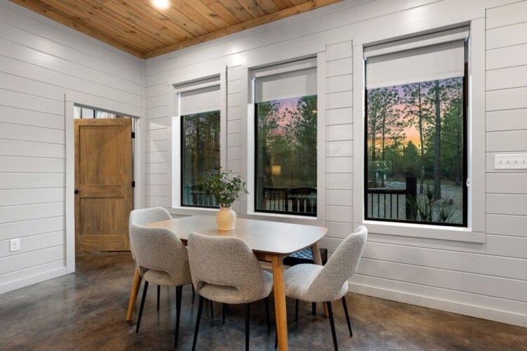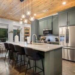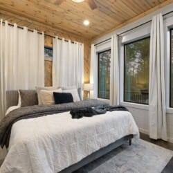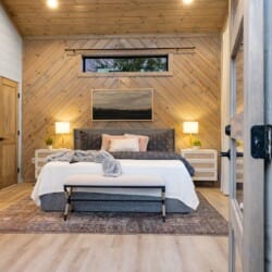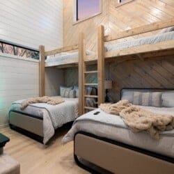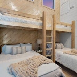 The cabin features four large bedrooms with king-sized beds and private or shared bathrooms, and an upstairs bunk room with two twin-over-queen beds that sleep up to six more guests. This layout makes it ideal for multi-generational families or groups of friends traveling together. Large windows let in natural light and provide relaxing views of the tall pine trees surrounding the property. The design blends clean modern lines with rustic charm, creating a calm atmosphere when guests walk through the front door.