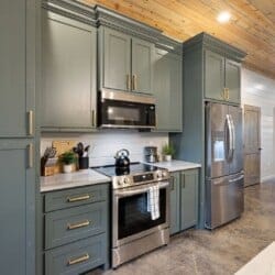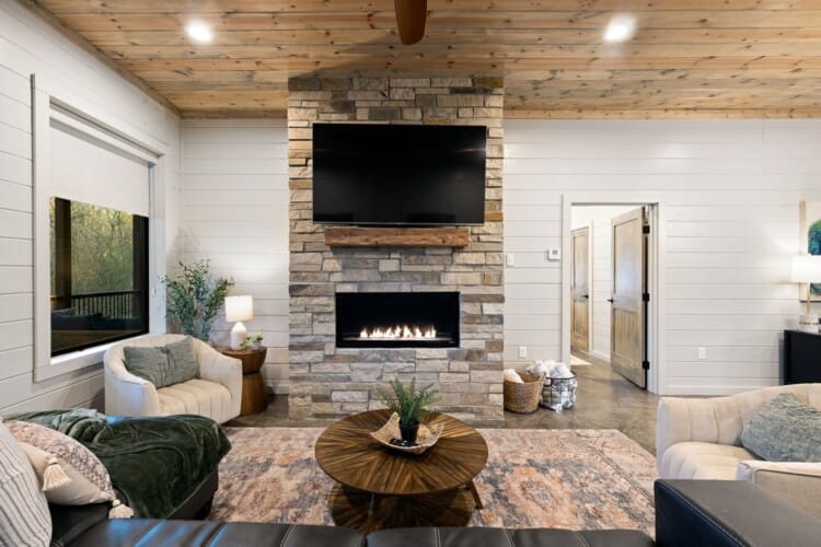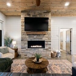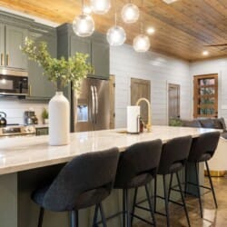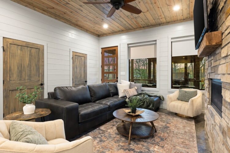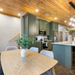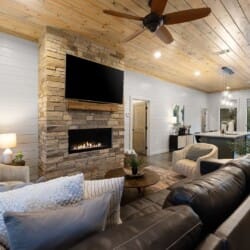 The open-concept living area brings everyone together. Rich wood floors run beneath cozy couches and plush poufs that circle a gas fireplace. A large flat-screen HDTV provides entertainment, and the open space ensures that everyone feels connected, from kids in the bunk room to adults in the kitchen. Vaulted ceilings and warm natural textures make the living space airy and inviting. Whether it’s watching a movie or enjoying a quiet morning coffee, this room becomes the heart of the cabin.