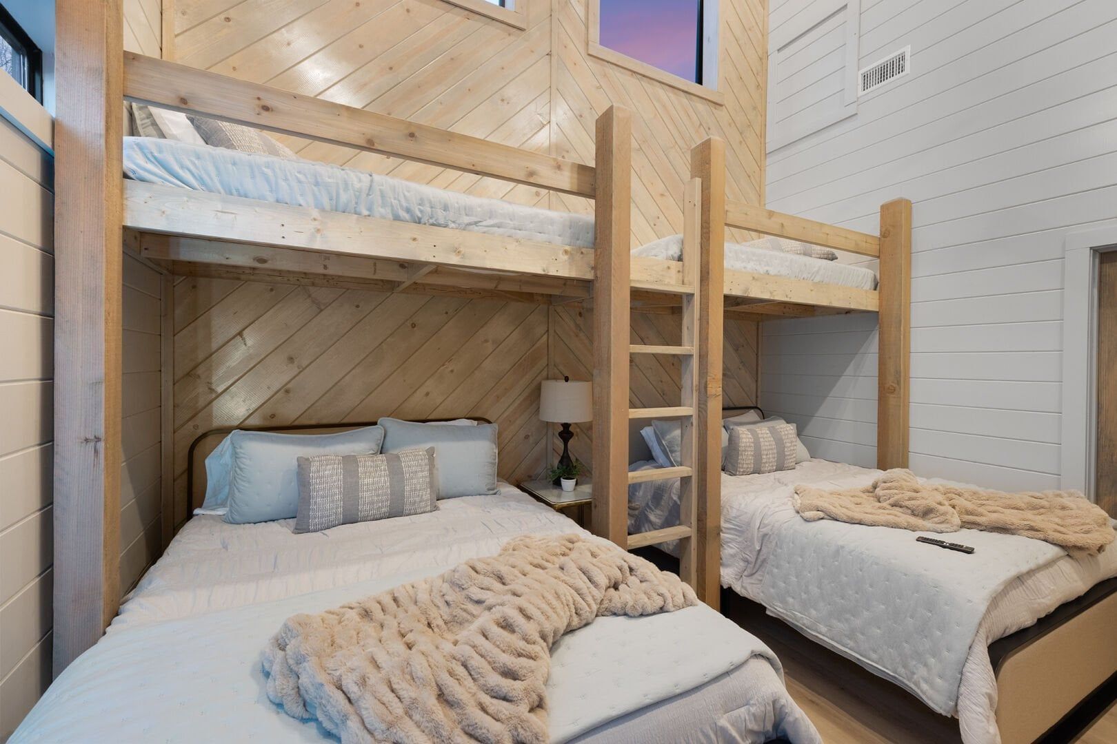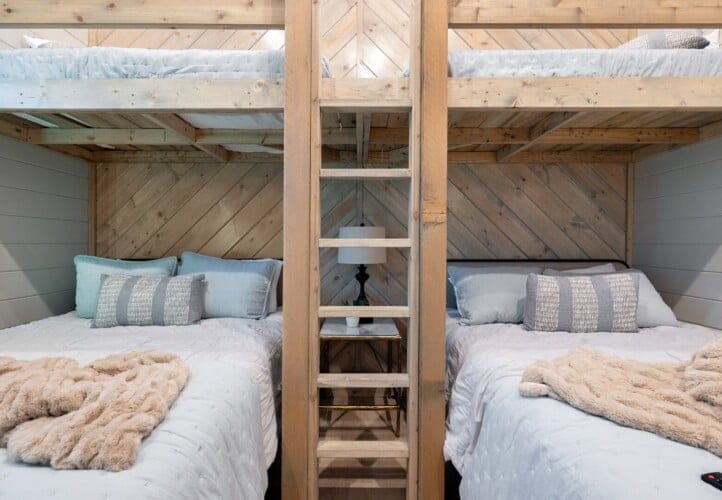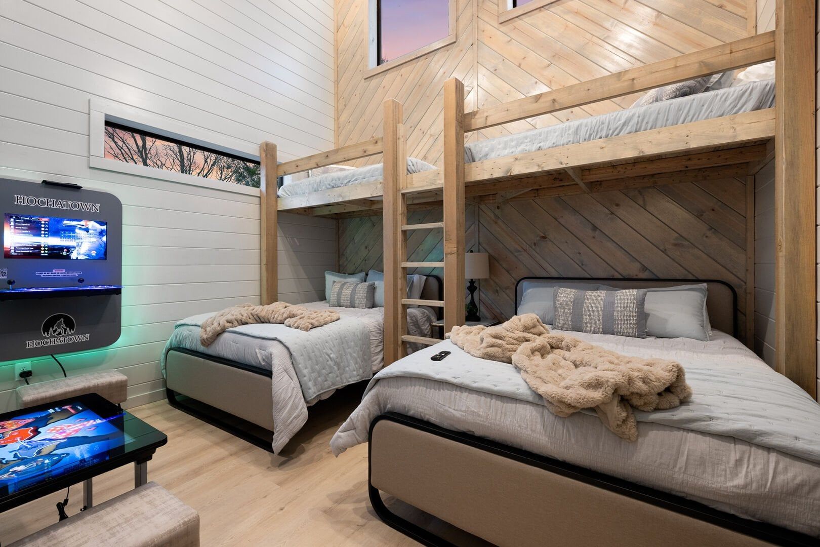 The bunk room upstairs adds extra entertainment with two arcade games that keep the fun going rain or shine. This room becomes a favorite spot for younger guests, giving them their own space to play while parents unwind downstairs or outside.
