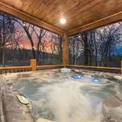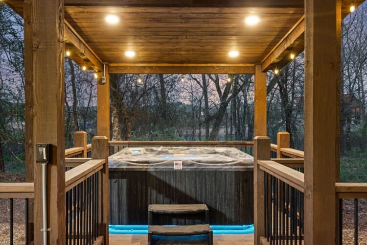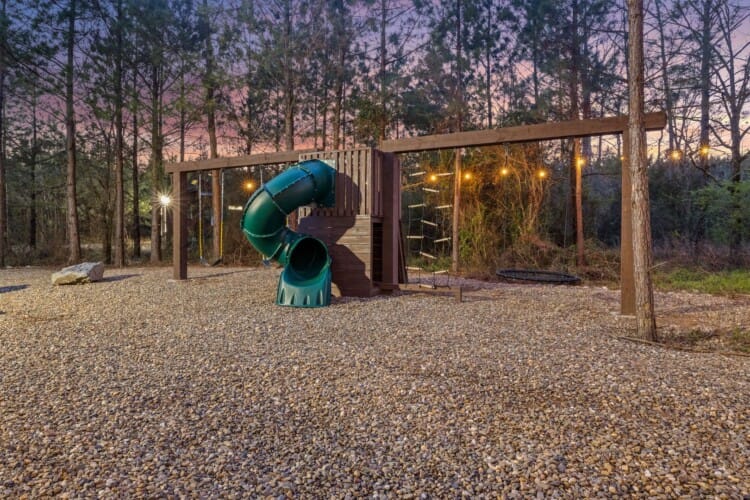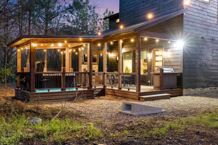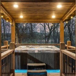 Outside, the cabin offers fun and relaxation that keeps guests returning. There’s a gazebo-covered hot tub with lighting for evening soaks and a fire pit with comfortable seating for roasting marshmallows and late-night chats. A swing set and slide entertain the kids while custom corn hole boards invite a little friendly competition. The upper and lower decks give guests plenty of space to sit and enjoy the beauty of nature, while the built-in outdoor grill offers everything needed for a cookout under the sky.