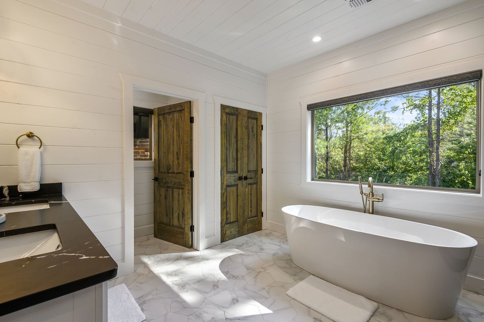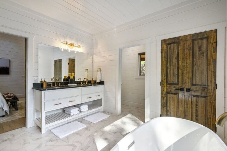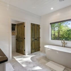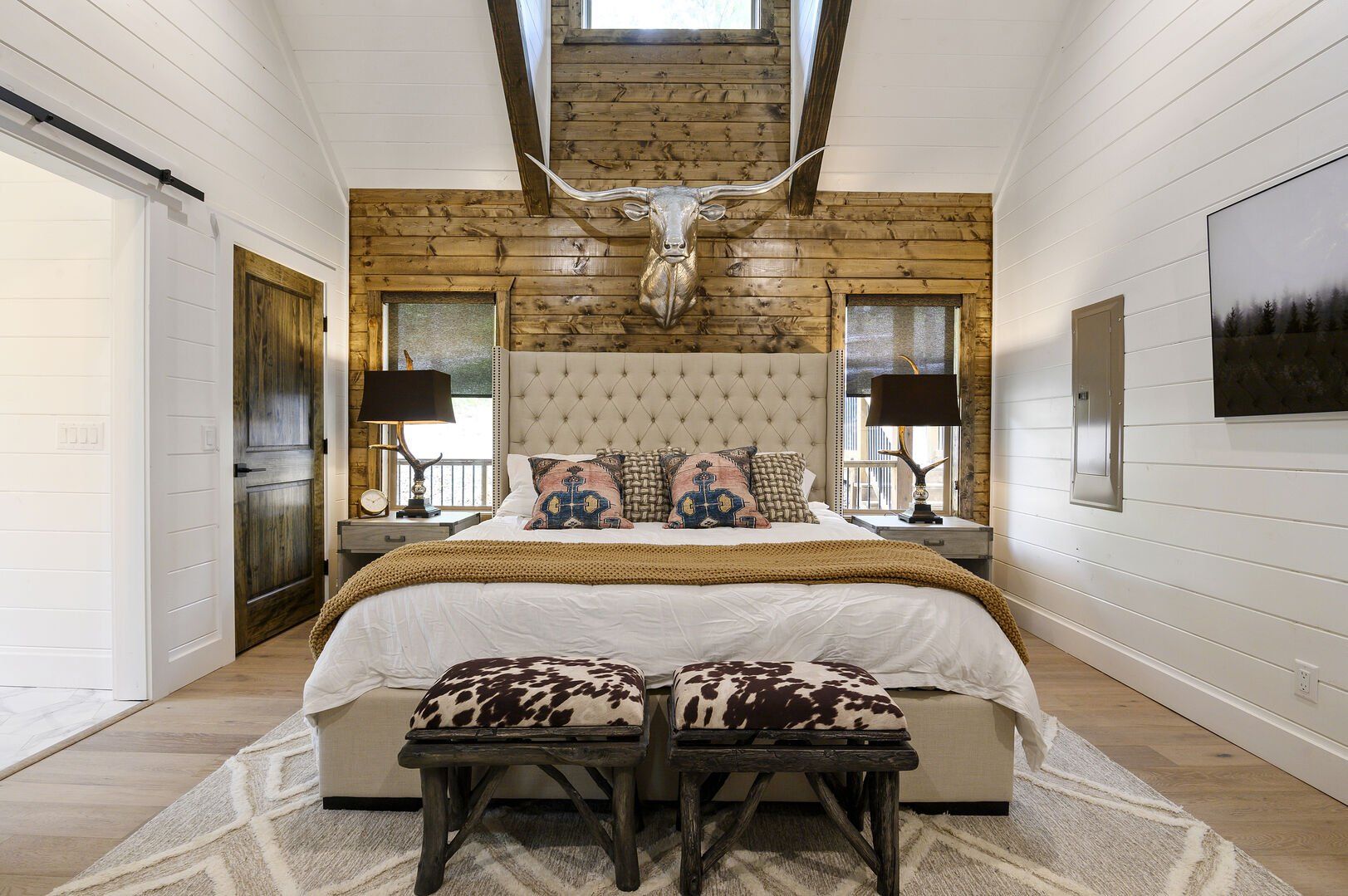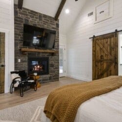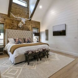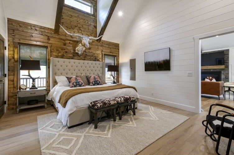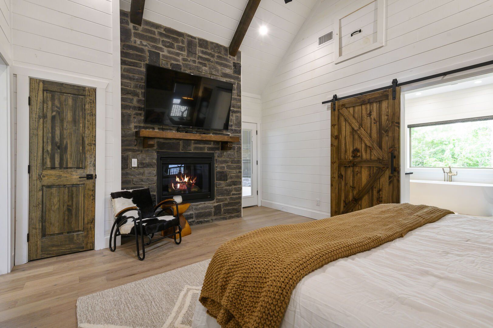 Do Not Disturb features a spacious king bedroom where style meets serenity. The room is designed with comfort in mind, featuring a large window that brings the outdoors inside. The natural pine details blend seamlessly with modern touches, creating a bedroom that is both cozy and elegant. The attached bathroom enhances the experience with a soaking tub and walk-in shower, allowing guests to relax completely after a day spent exploring the area.