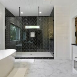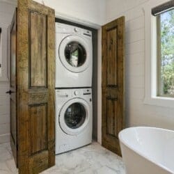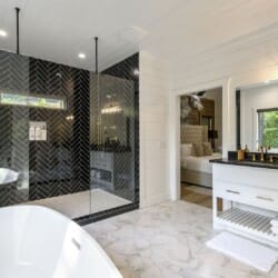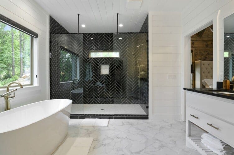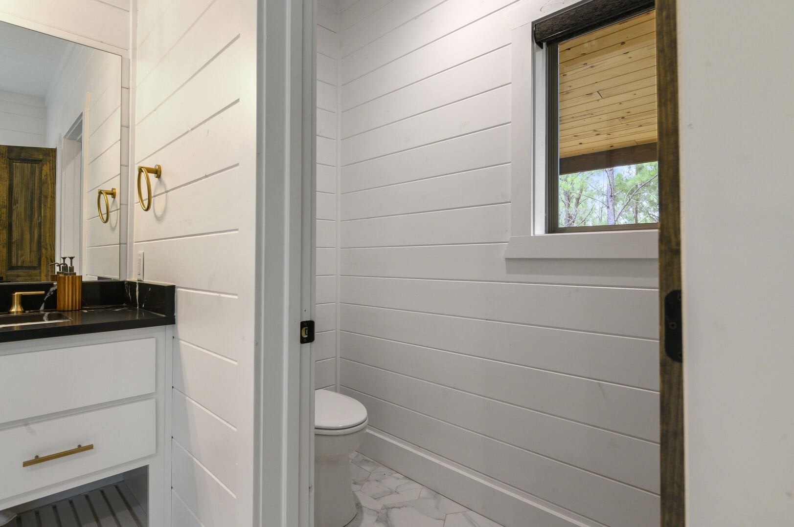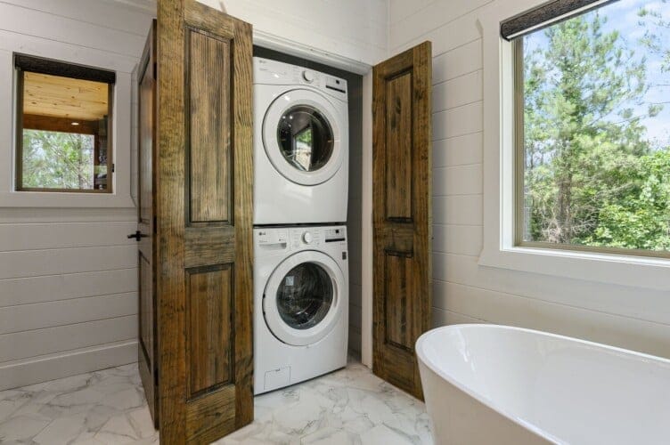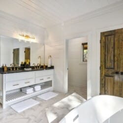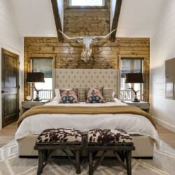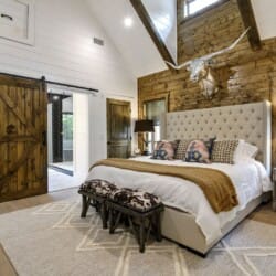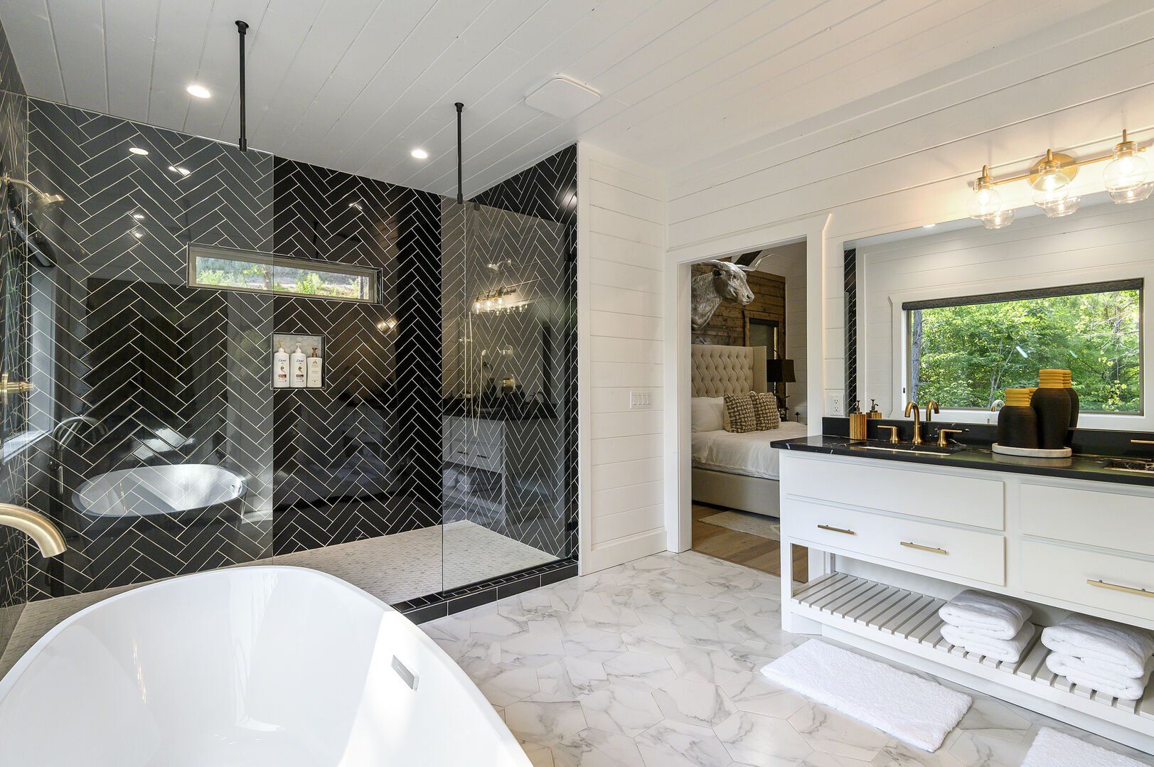 Do Not Disturb features a spacious king bedroom where style meets serenity. The room is designed with comfort in mind, featuring a large window that brings the outdoors inside. The natural pine details blend seamlessly with modern touches, creating a bedroom that is both cozy and elegant. The attached bathroom enhances the experience with a soaking tub and walk-in shower, allowing guests to relax completely after a day spent exploring the area.