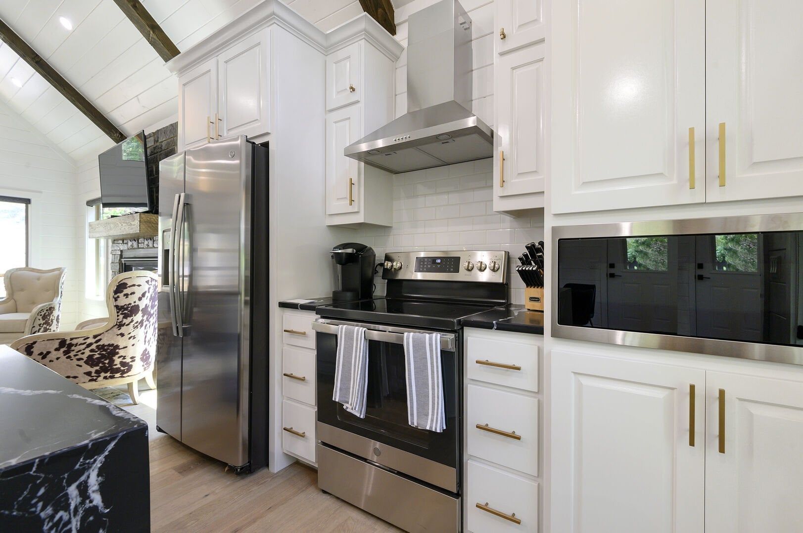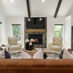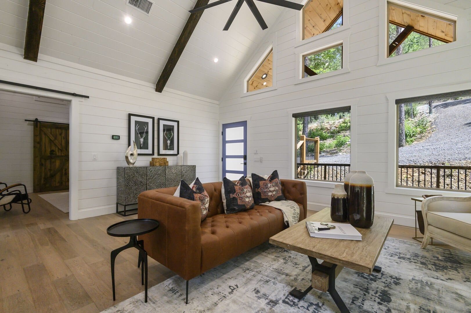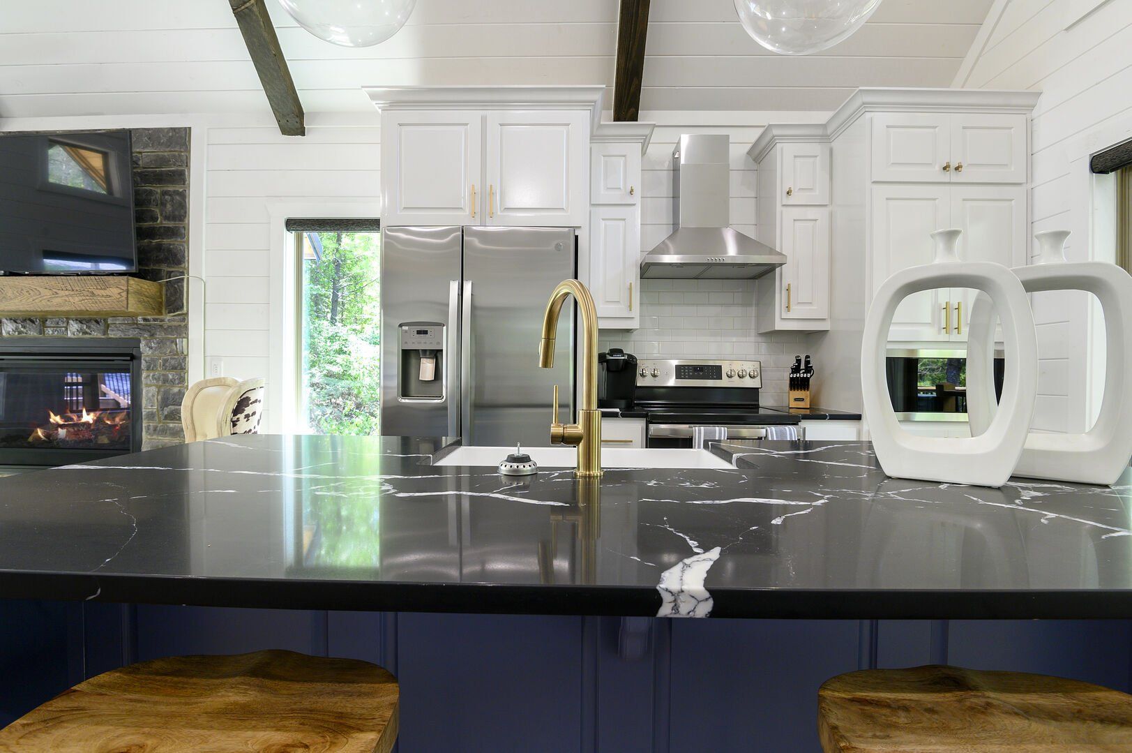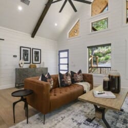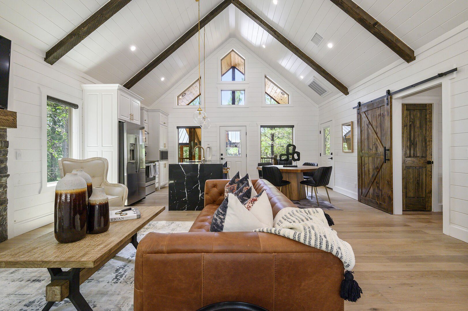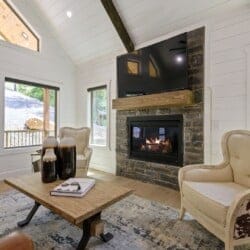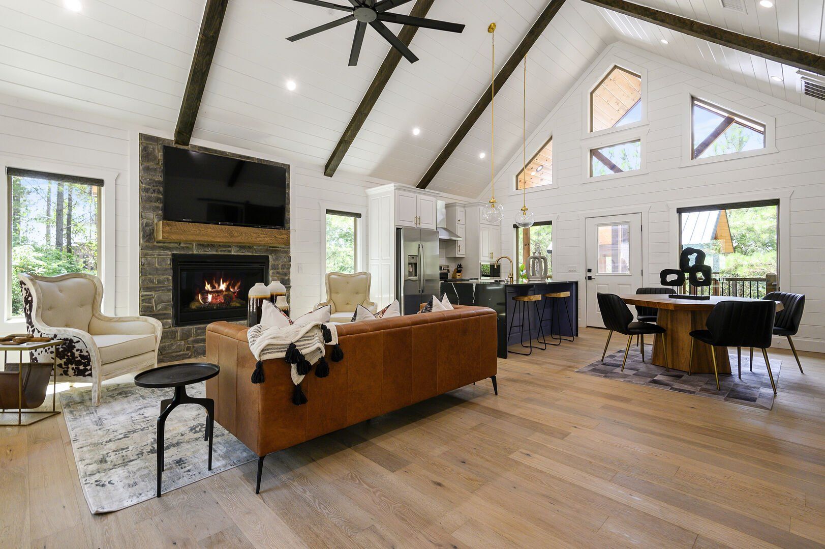 Do Not Disturb opens up into a beautiful living room with high ceilings and wide windows that showcase the forest view. A soft leather couch faces the gas fireplace, creating a warm and comfortable place to unwind. The large flat-screen television adds modern convenience, perfect for watching movies after a long day outdoors. Every detail in this space has been chosen to make guests feel at home while still providing the charm of a true cabin experience.