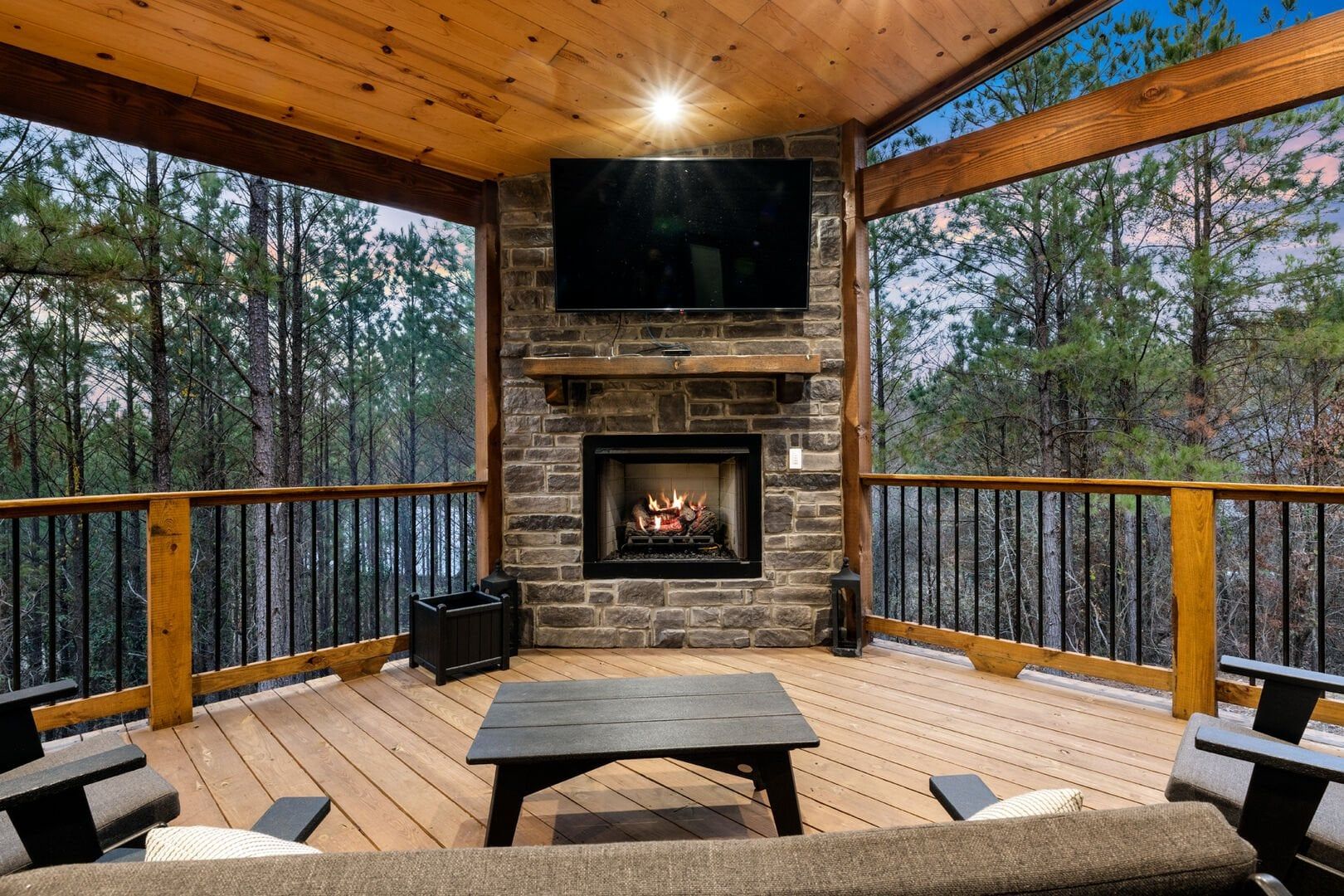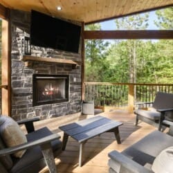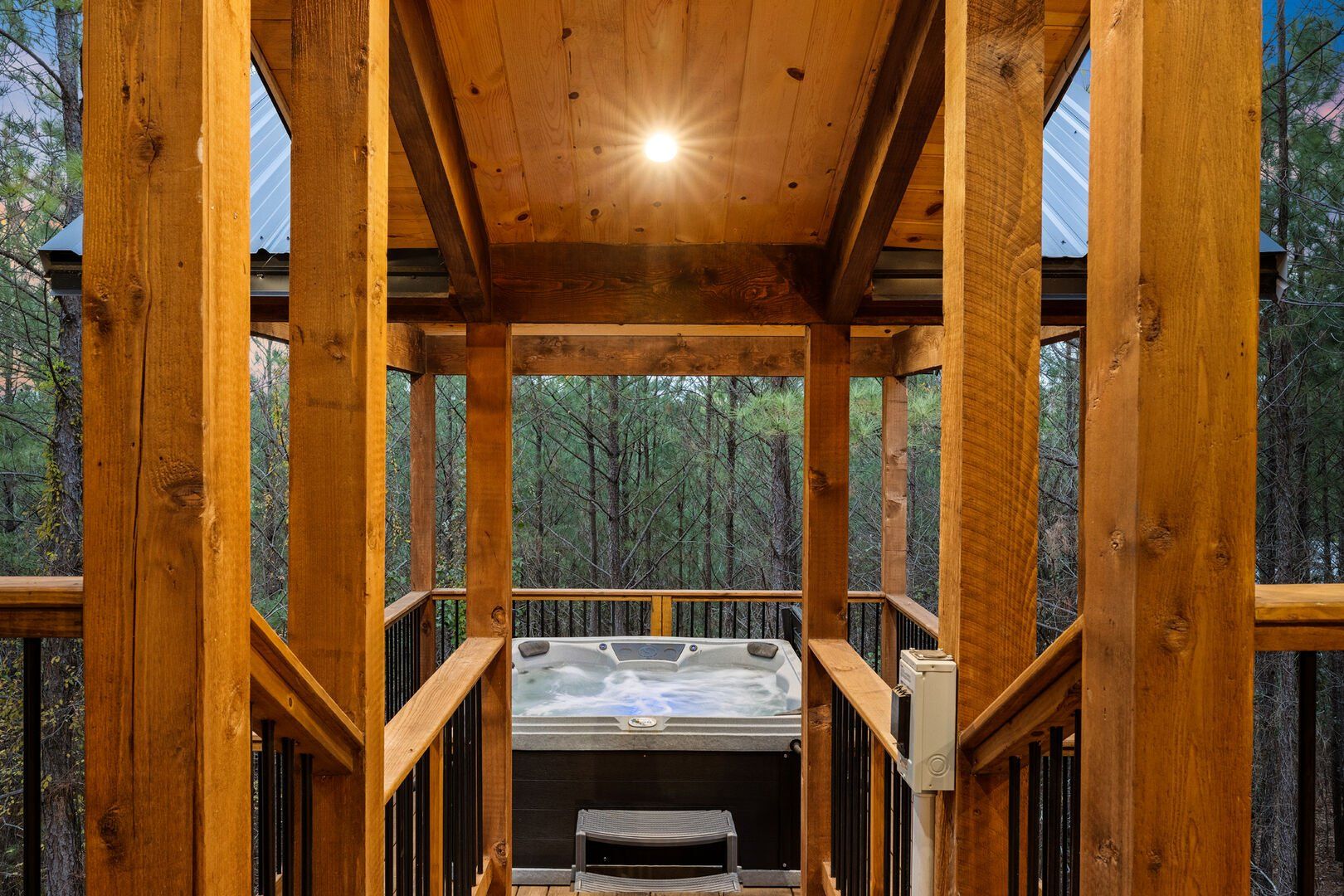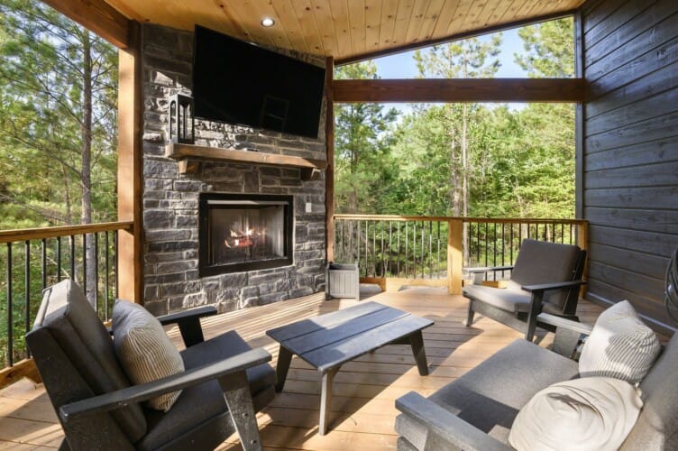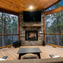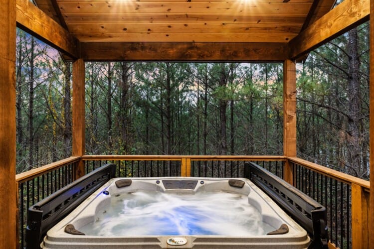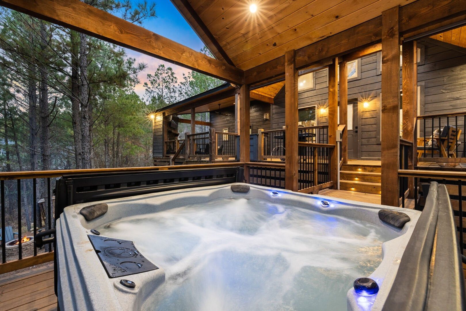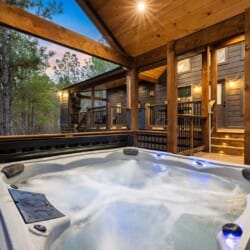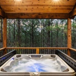 Do Not Disturb is just as inviting on the outside as it is on the inside. The private deck stretches along the back of the cabin, offering a peaceful spot to relax and take in the fresh pine-scented air. A bubbling hot tub sits under a covered gazebo, perfect for early-morning soaks or late-night stargazing. The fire pit nearby offers a classic way to spend the evening—roasting marshmallows, telling stories, or simply enjoying the quiet.