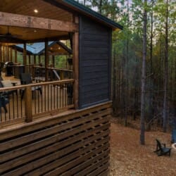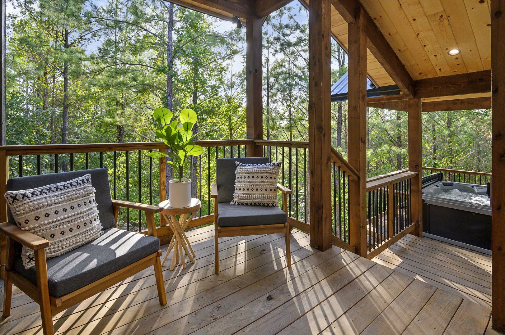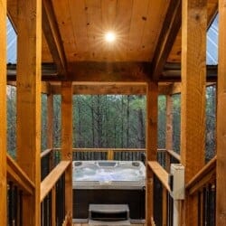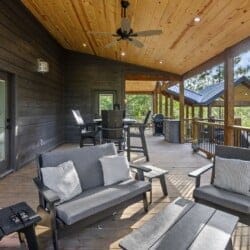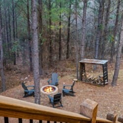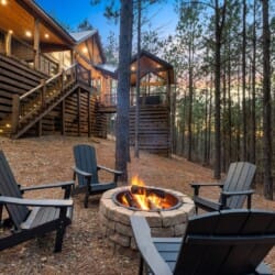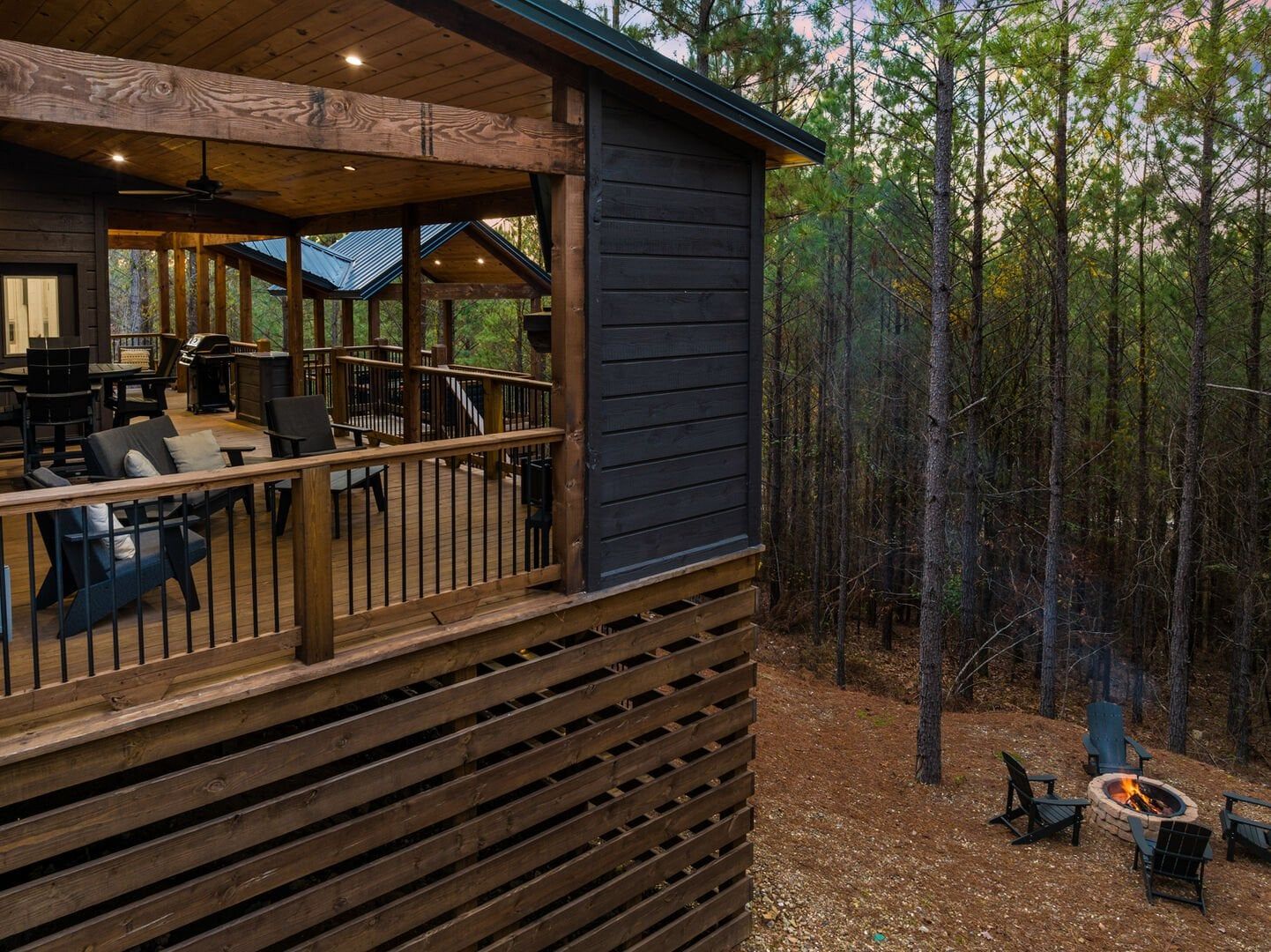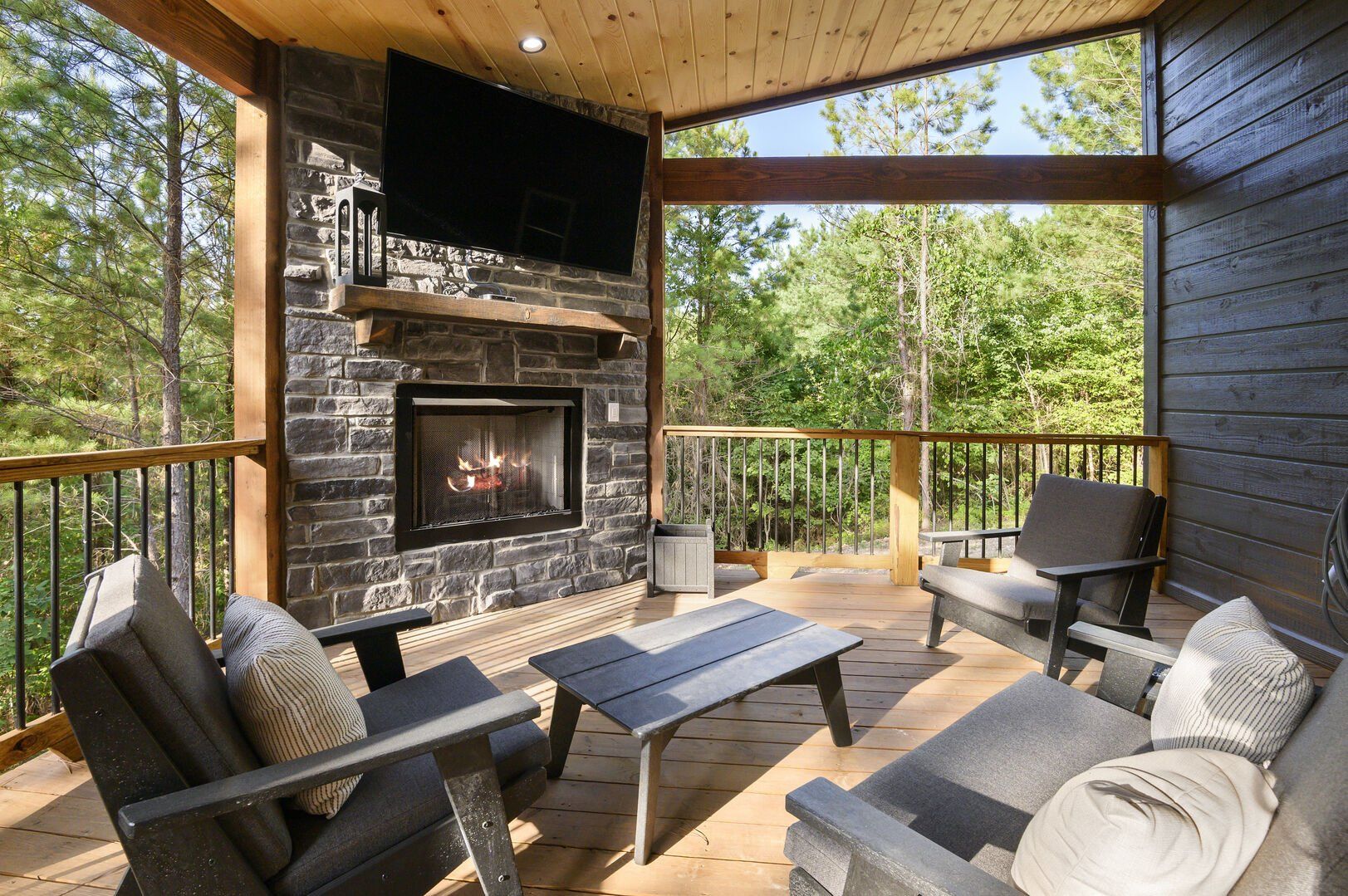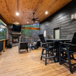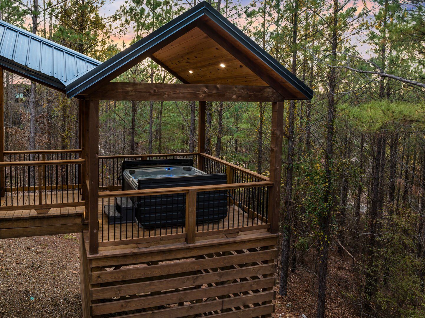 Do Not Disturb is just as inviting on the outside as it is on the inside. The private deck stretches along the back of the cabin, offering a peaceful spot to relax and take in the fresh pine-scented air. A bubbling hot tub sits under a covered gazebo, perfect for early-morning soaks or late-night stargazing. The fire pit nearby offers a classic way to spend the evening—roasting marshmallows, telling stories, or simply enjoying the quiet.