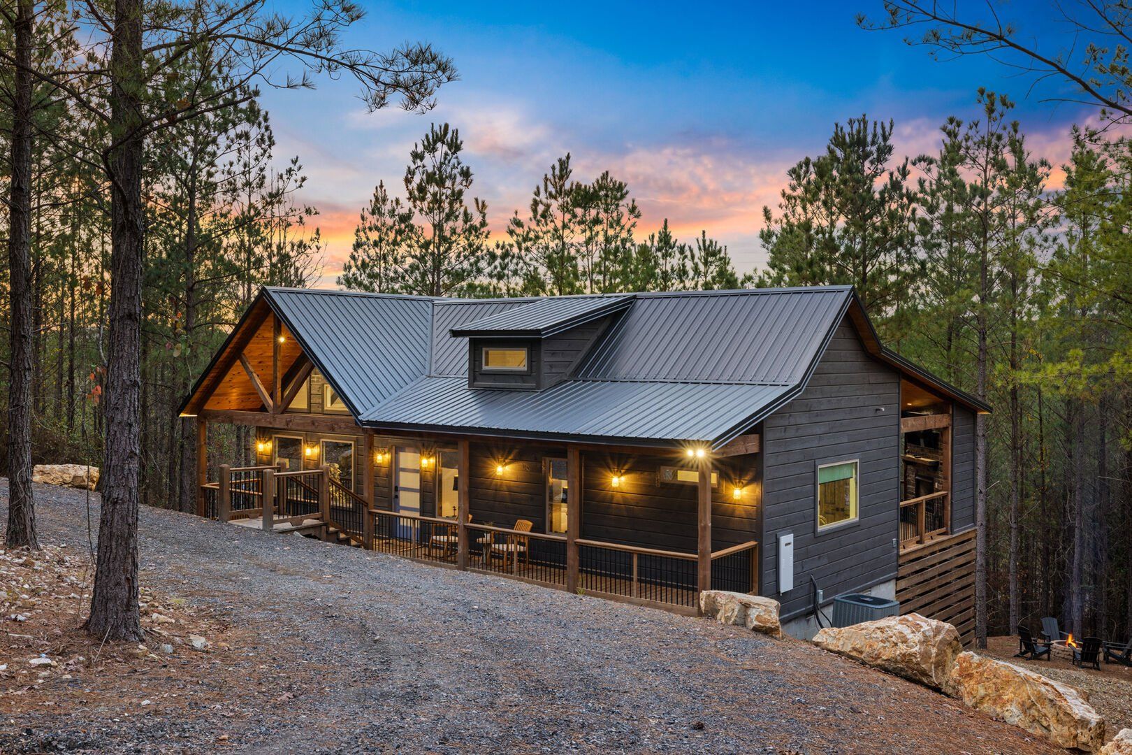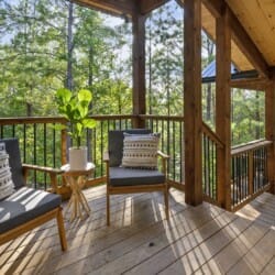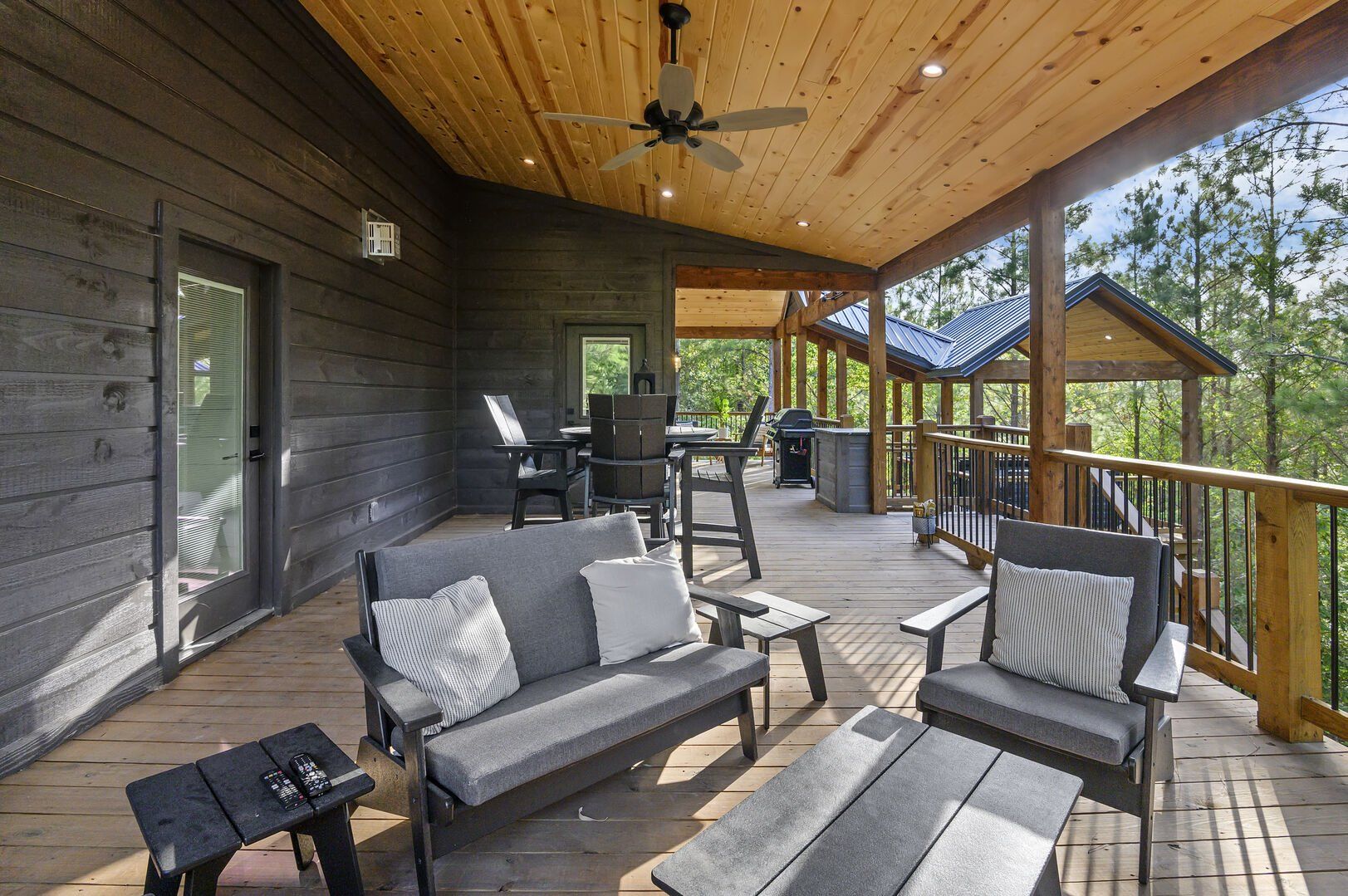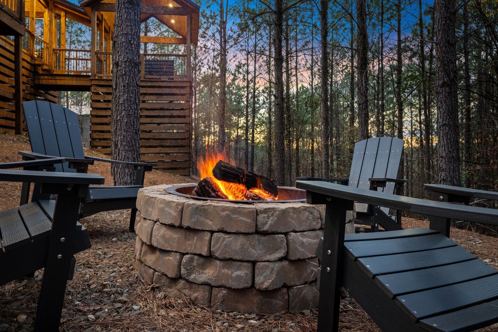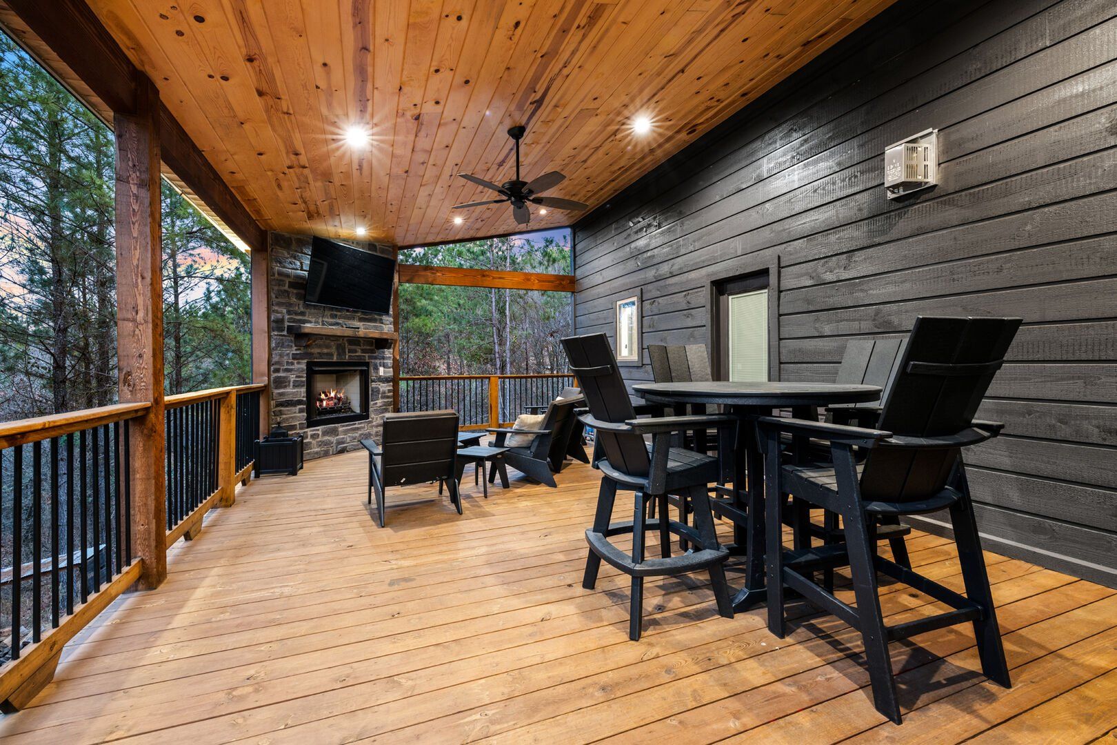 Do Not Disturb is just as inviting on the outside as it is on the inside. The private deck stretches along the back of the cabin, offering a peaceful spot to relax and take in the fresh pine-scented air. A bubbling hot tub sits under a covered gazebo, perfect for early-morning soaks or late-night stargazing. The fire pit nearby offers a classic way to spend the evening—roasting marshmallows, telling stories, or simply enjoying the quiet.