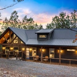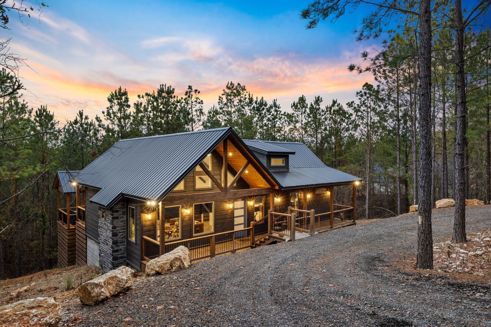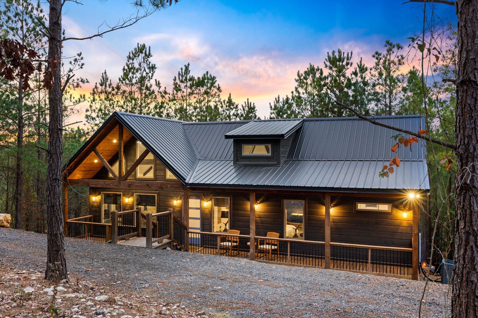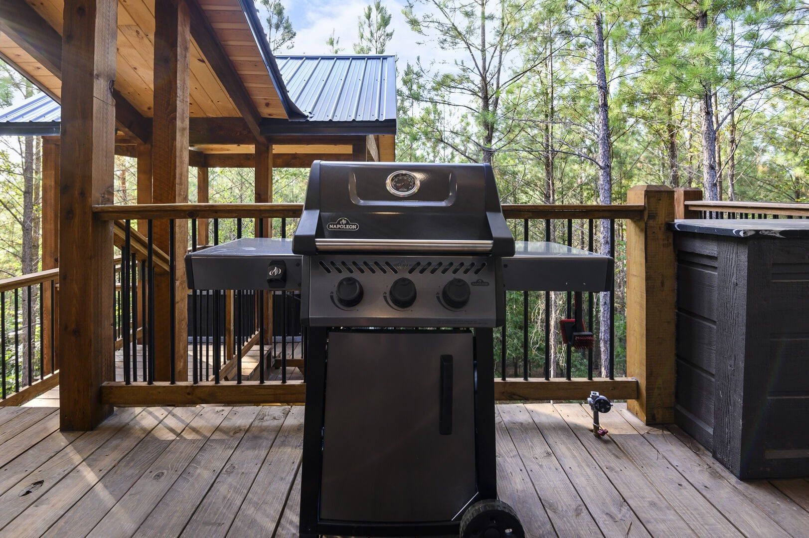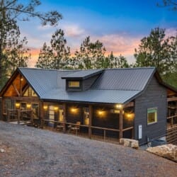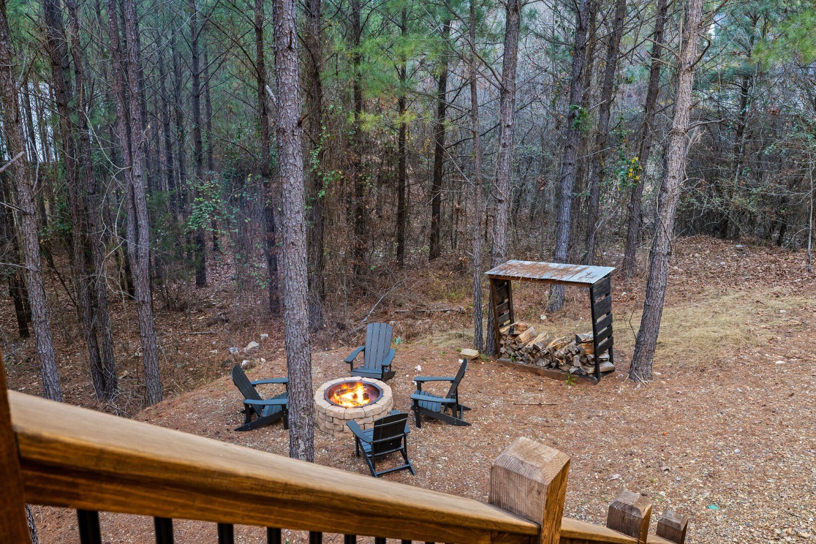 Do Not Disturb is just as inviting on the outside as it is on the inside. The private deck stretches along the back of the cabin, offering a peaceful spot to relax and take in the fresh pine-scented air. A bubbling hot tub sits under a covered gazebo, perfect for early-morning soaks or late-night stargazing. The fire pit nearby offers a classic way to spend the evening—roasting marshmallows, telling stories, or simply enjoying the quiet.