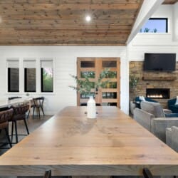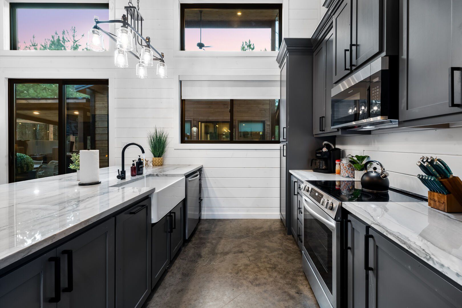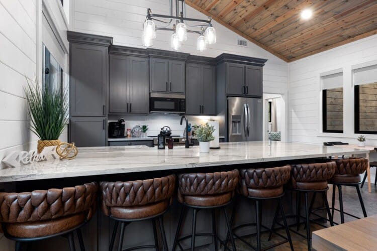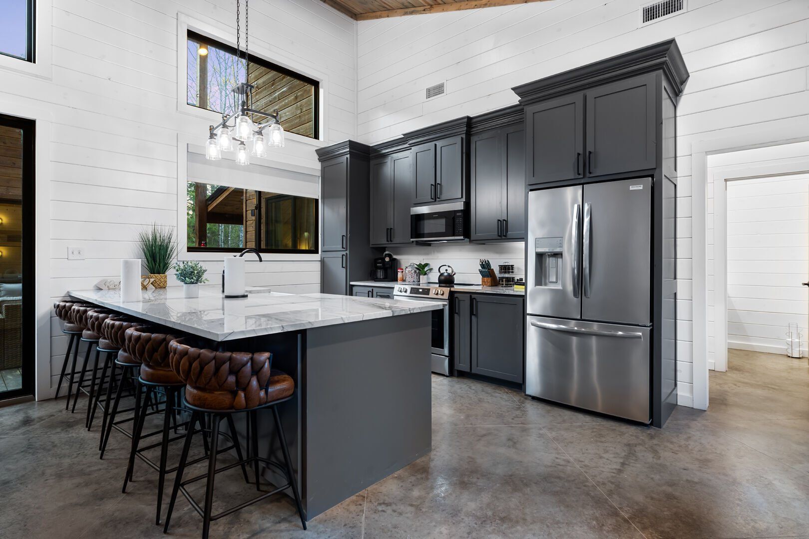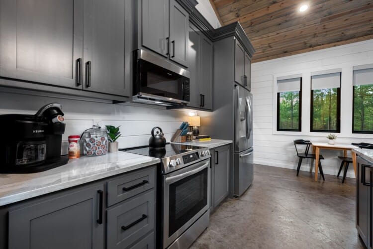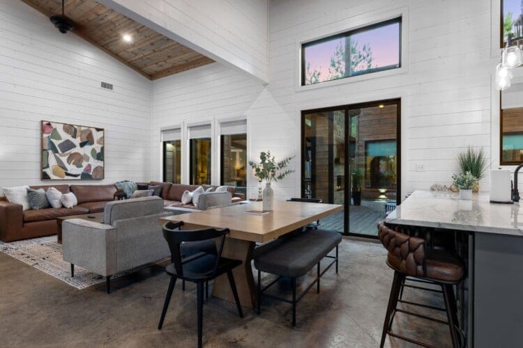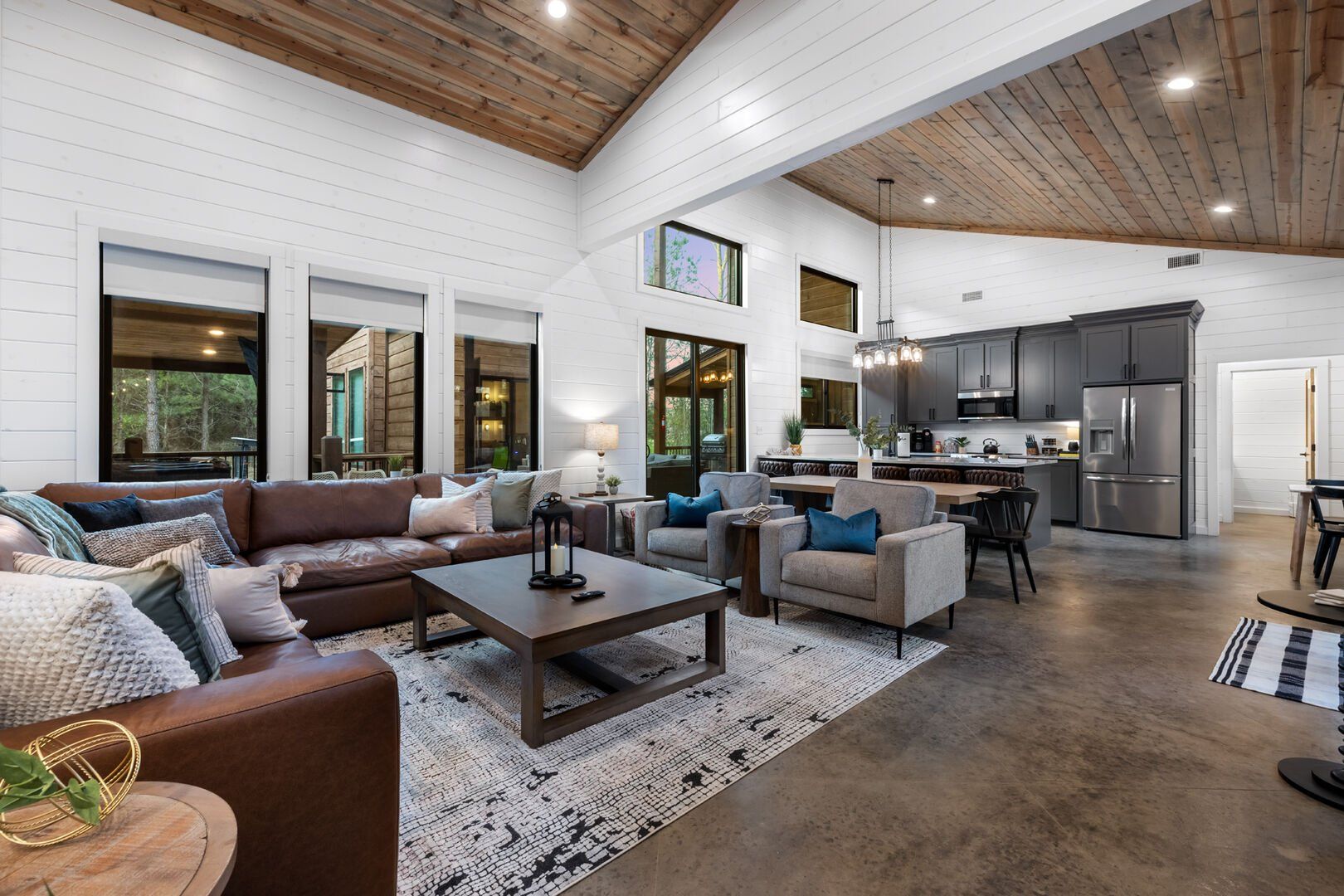 The open-concept living area inside GameTime Cabin creates an inviting atmosphere for gathering. Large wood floor panels stretch out under high ceilings, while windows frame the natural beauty of the pine trees outside. The comfortable couch, poufs, and accent chairs offer plenty of seating for guests to enjoy movies on the large flat-screen HDTV or chat by the warm glow of the gas fireplace. The modern kitchen, with sleek appliances and a coffee bar featuring a Keurig dual coffee machine, is perfect for preparing and sharing meals at the beautiful dining table or outside on the deck.