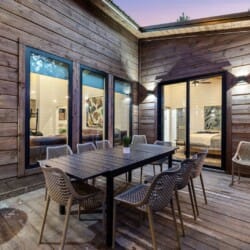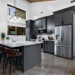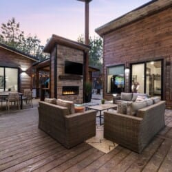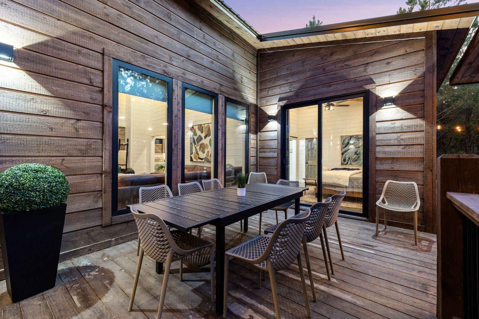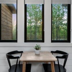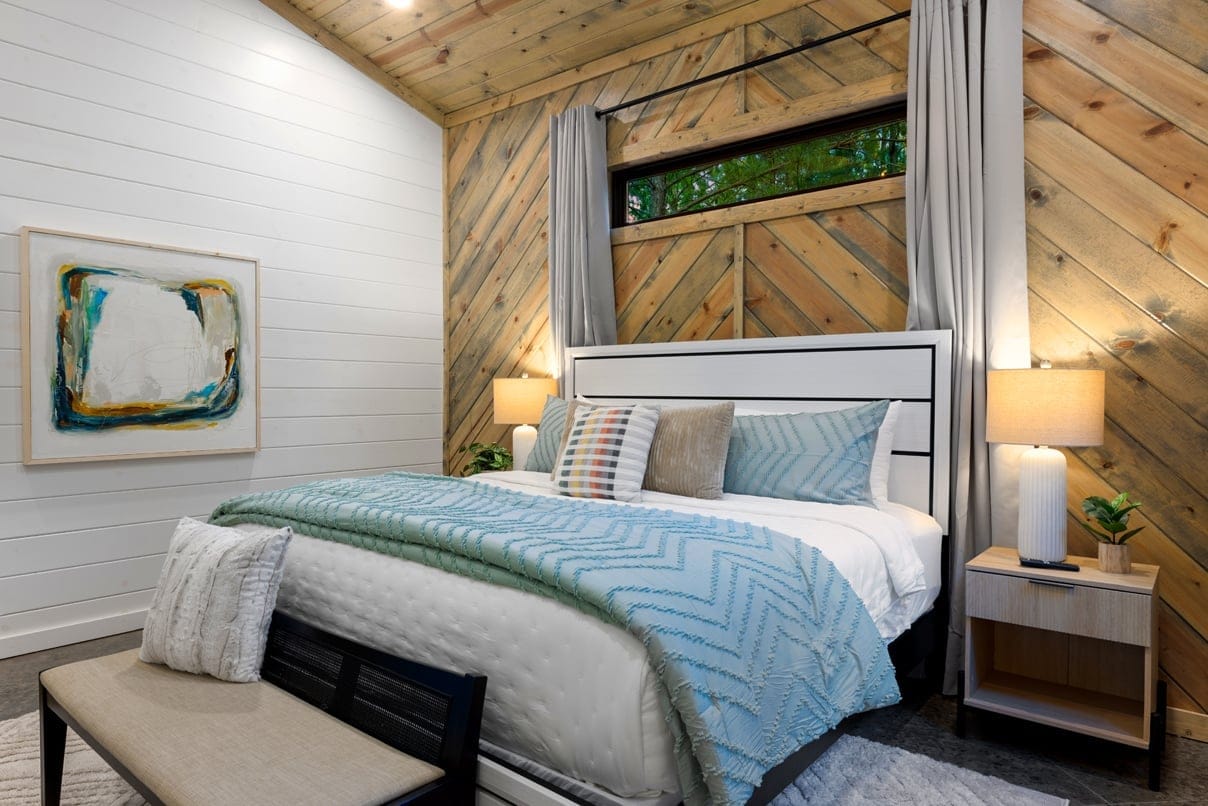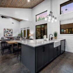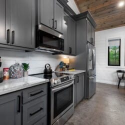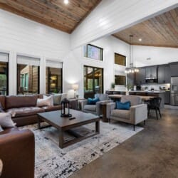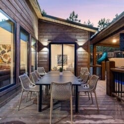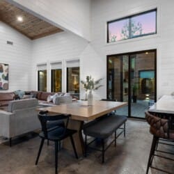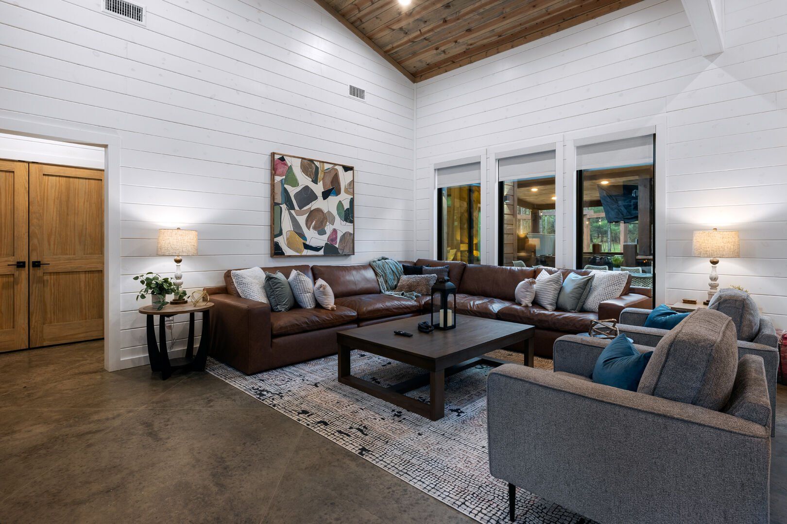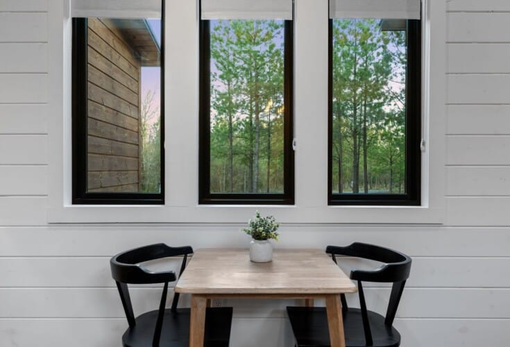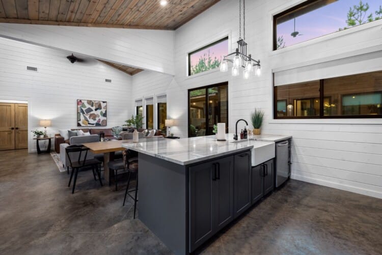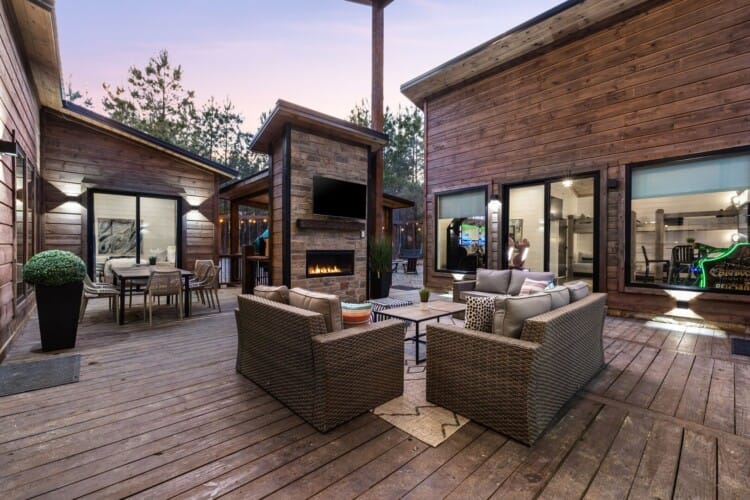 The open-concept living area inside GameTime Cabin creates an inviting atmosphere for gathering. Large wood floor panels stretch out under high ceilings, while windows frame the natural beauty of the pine trees outside. The comfortable couch, poufs, and accent chairs offer plenty of seating for guests to enjoy movies on the large flat-screen HDTV or chat by the warm glow of the gas fireplace. The modern kitchen, with sleek appliances and a coffee bar featuring a Keurig dual coffee machine, is perfect for preparing and sharing meals at the beautiful dining table or outside on the deck.