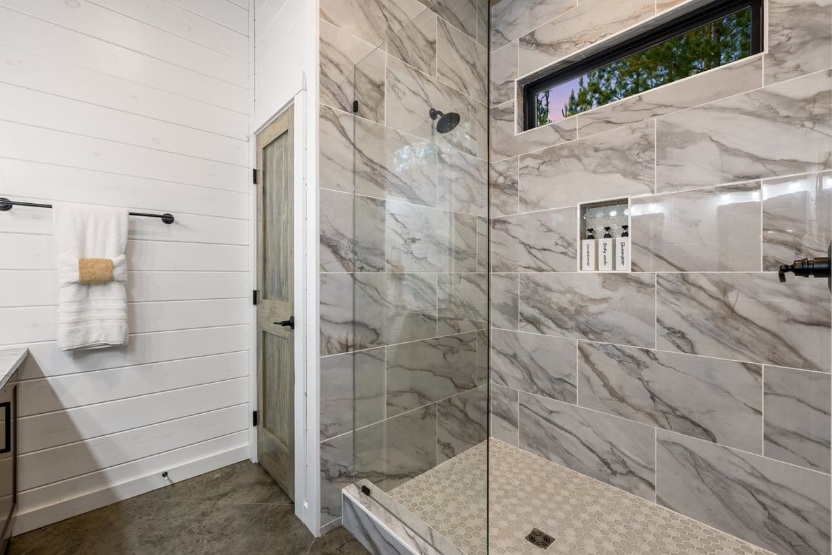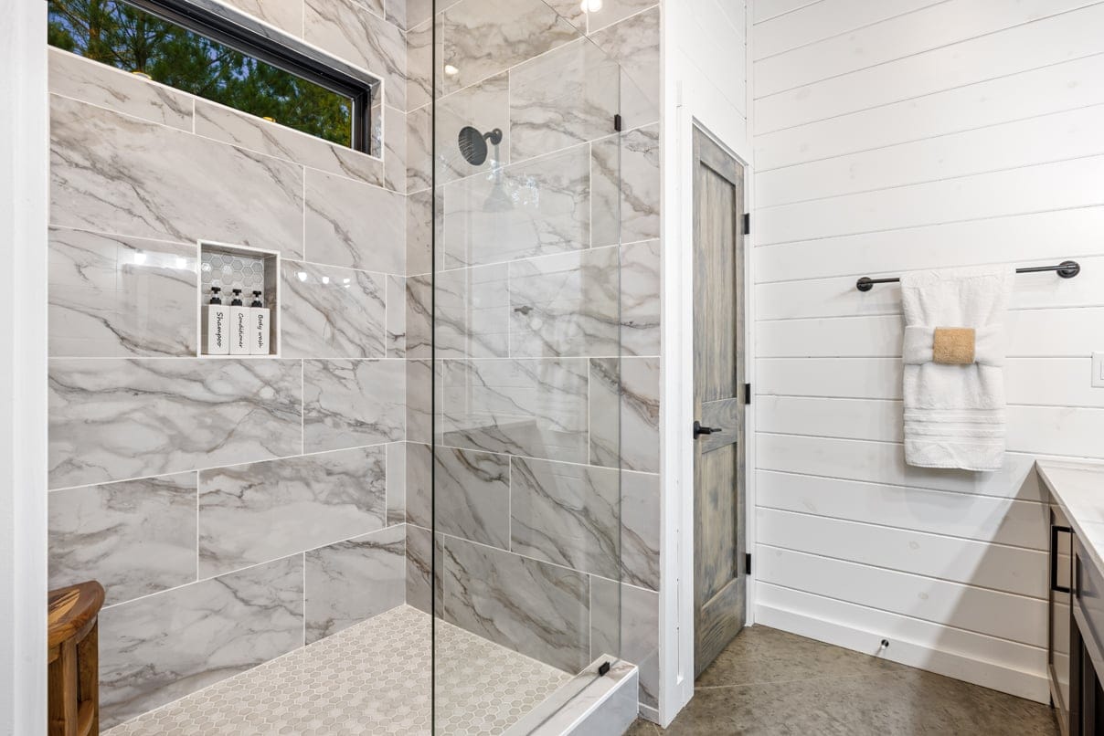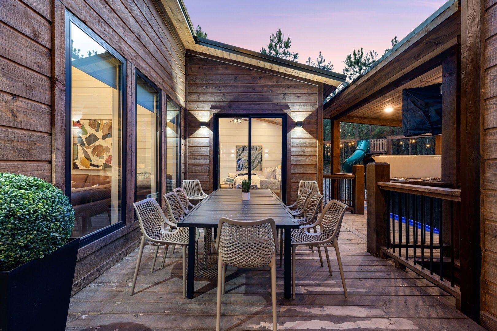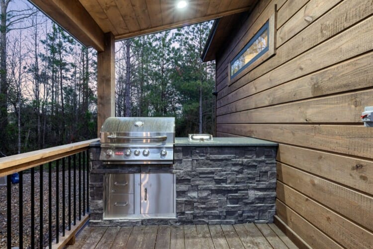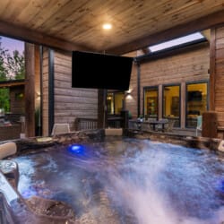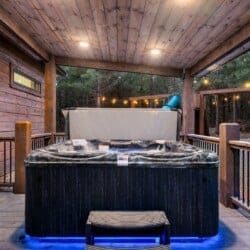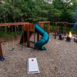 Step outside, and the GameTime Cabin truly shines. The large deck overlooks the peaceful forest, providing the ideal spot for outdoor dining or simply soaking up the fresh mountain air. The outdoor kitchen, equipped with a grill hardwired to propane, makes cooking under the open sky a breeze. The bubbling, gazebo-style hot tub invites guests to unwind while enjoying the scenic views, while the fire pit surrounded by swing chairs sets the stage for laughter and conversation long into the night. The outdoor play set and custom corn hole boards add even more fun for families, keeping kids and adults entertained for hours. A Tesla EV charger and a circular drive with boat parking ensure that every detail has been thoughtfully considered for convenience.