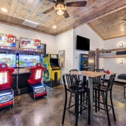 GameTime Cabin is where adventure and relaxation meet, offering families and friends a perfect retreat in Broken Bow. Nestled among the towering pines, this cabin blends the rustic charm of nature with modern comforts that make it easy to settle in and feel at home. The cabin features four spacious king master bedrooms with an ensuite bathroom, ensuring everyone has private space to relax and unwind. Just across the outdoor patio, a separate bunkhouse provides a cozy spot for kids or additional guests, with four twin beds, its bathroom, and an array of exciting arcade games like Pac-Man, Buck Hunter, Mario Kart, and Golden Tee.